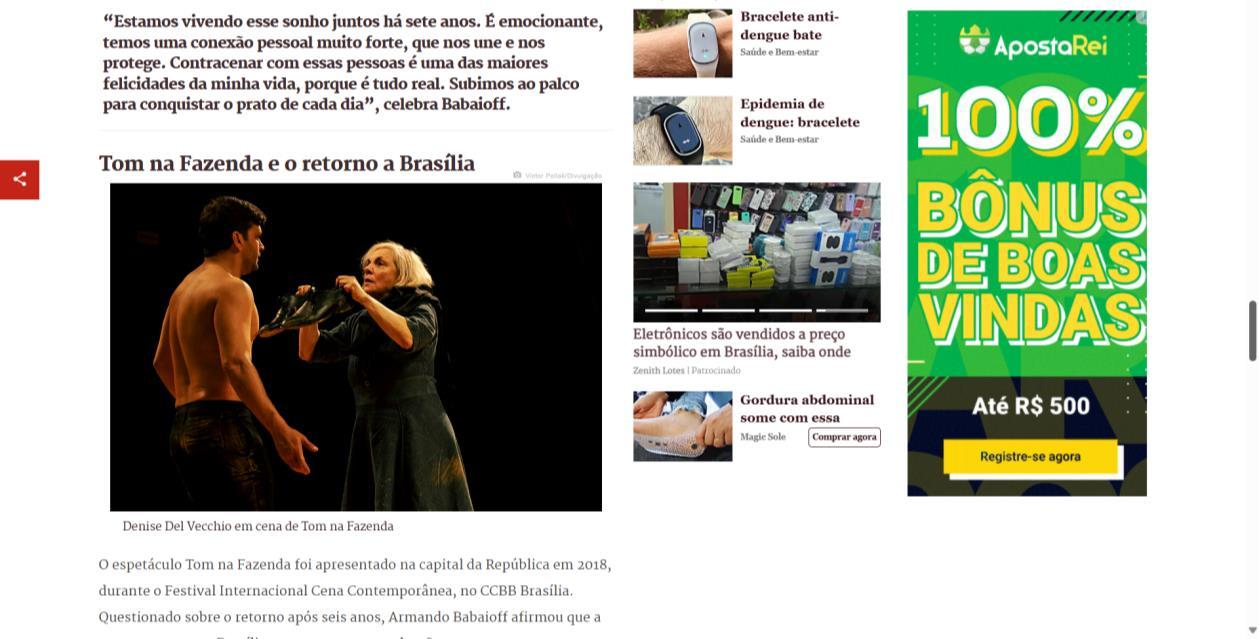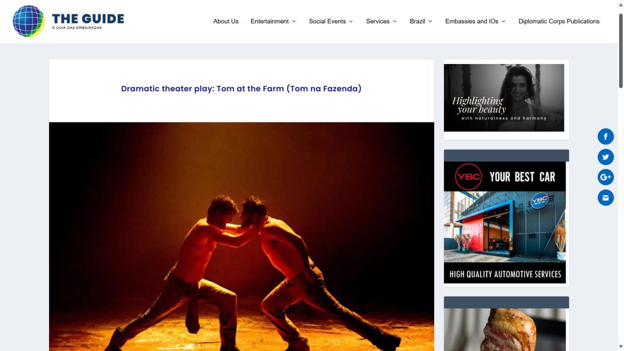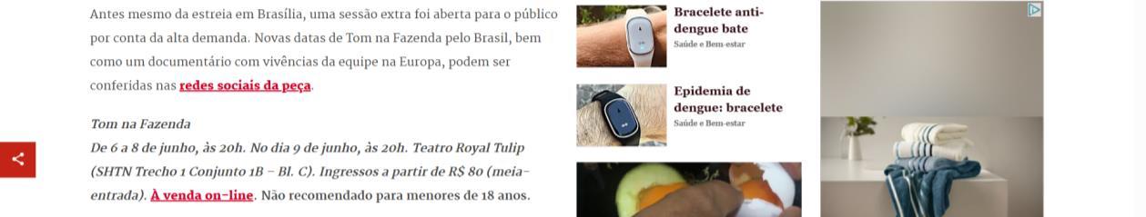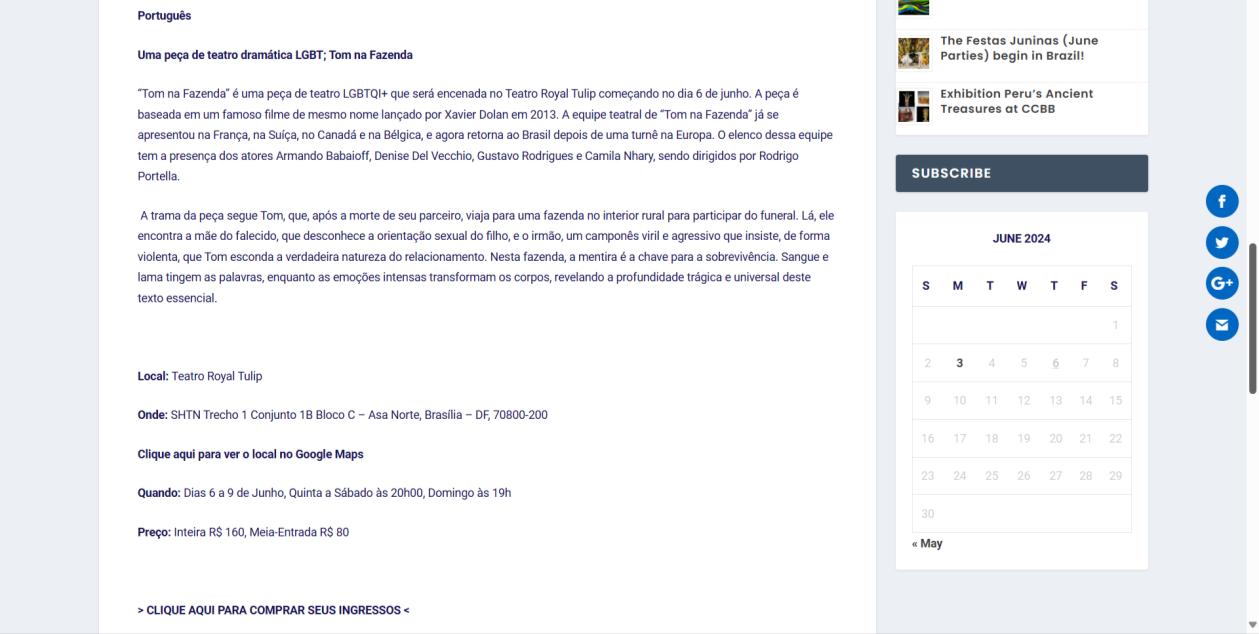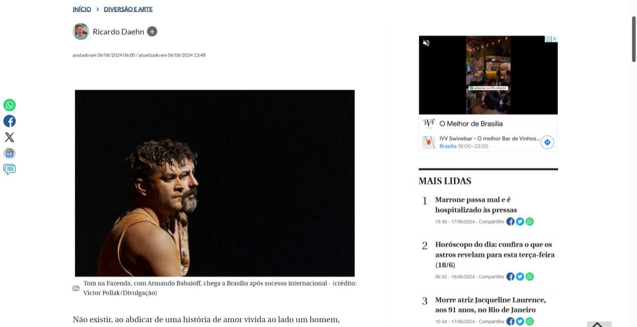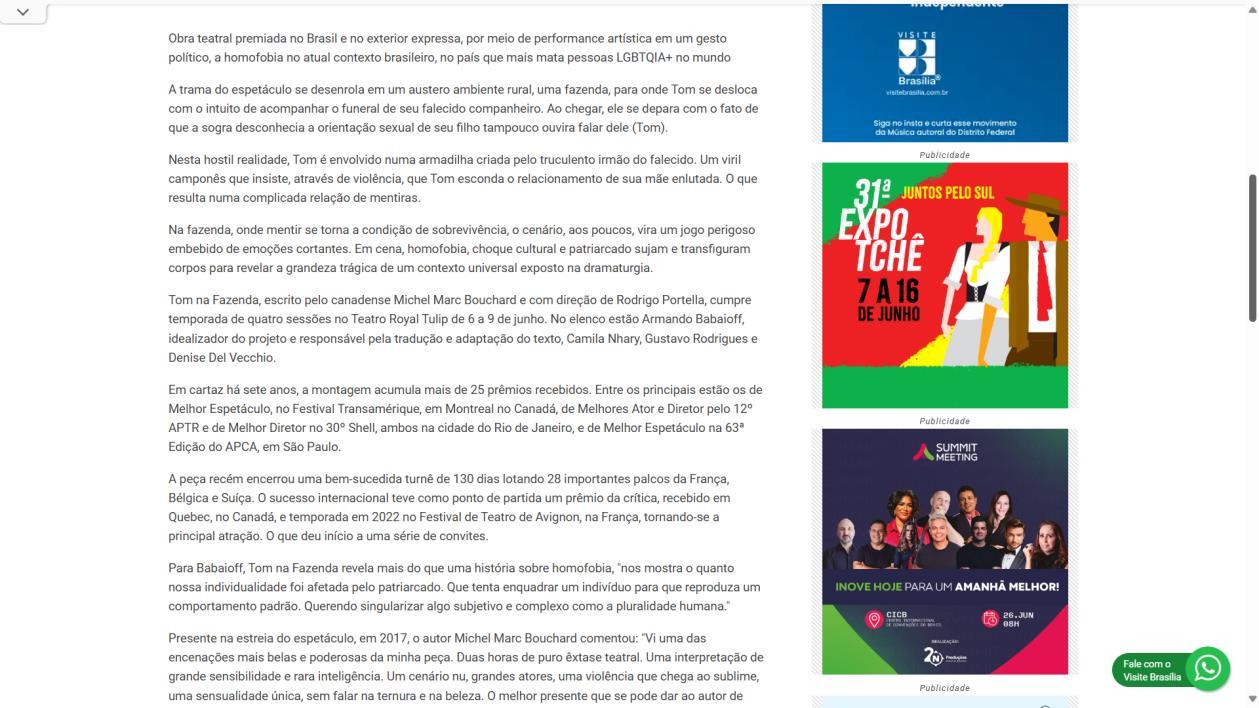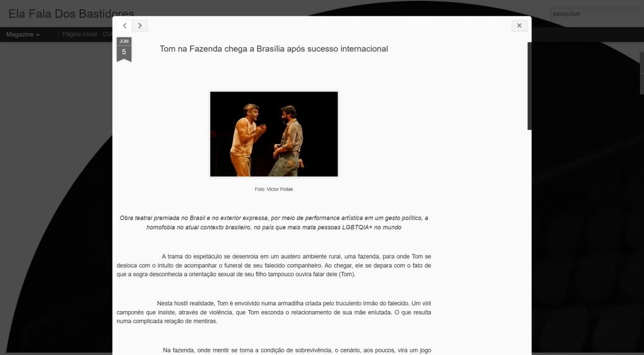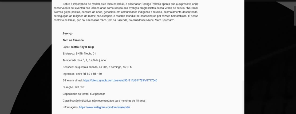Um bem-sucedido caso internacional de produção teatral brasileira “Tom na fazenda” retorna a Brasília em junho, após ganhar os palcos da Europa em uma turnê por 28 praças lotando teatros ao longo de 130 dias. Há relatos de pessoas que acompanham a peça por diferentes cidades para poder assistir mais de uma vez.