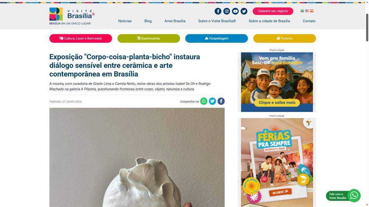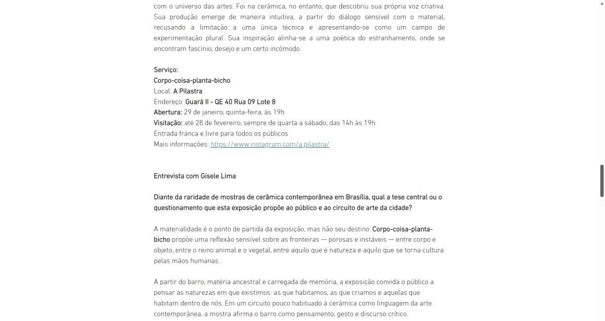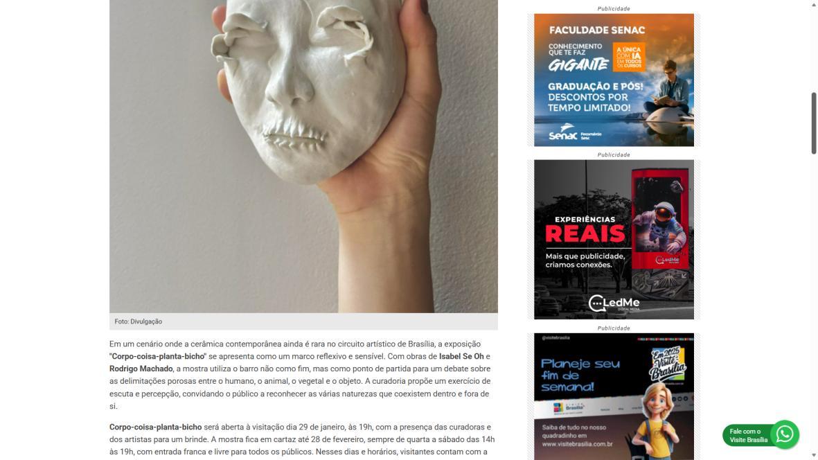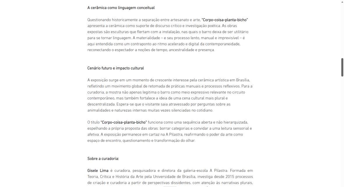 Corpo-coisa-planta-bicho afirma a cerâmica como linguagem legítima da arte contemporânea em Brasília, ampliando o repertório do circuito local e tensionando hierarquias ainda presentes na cena cultural.