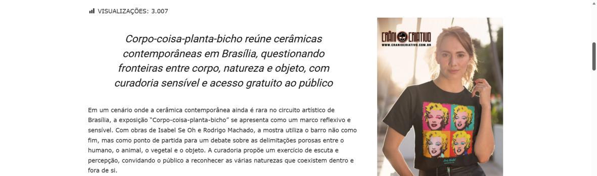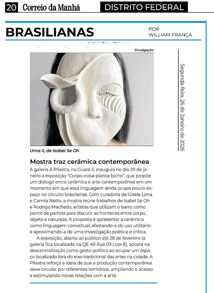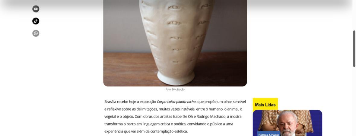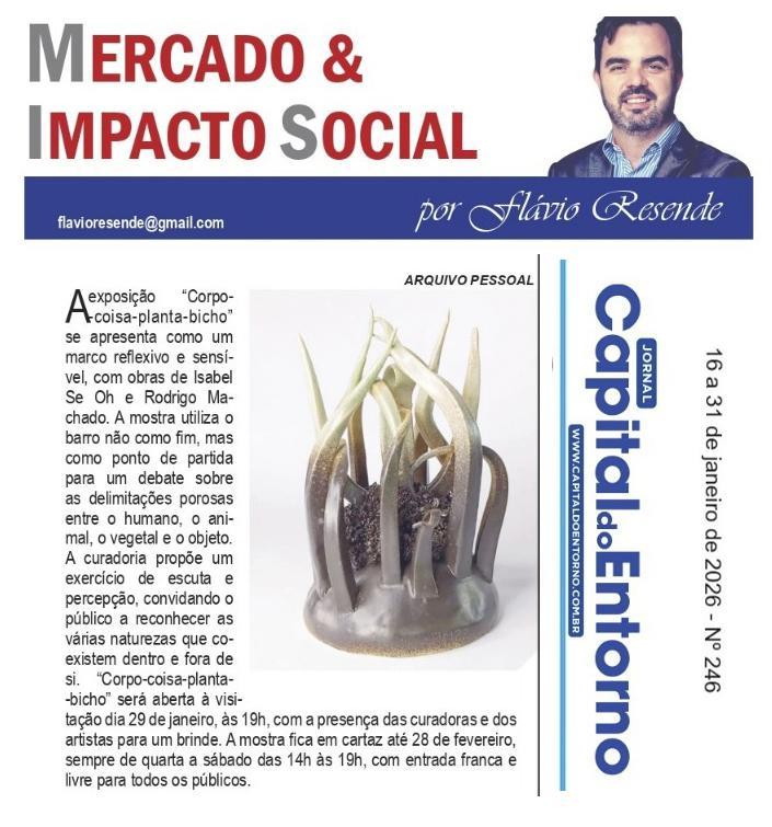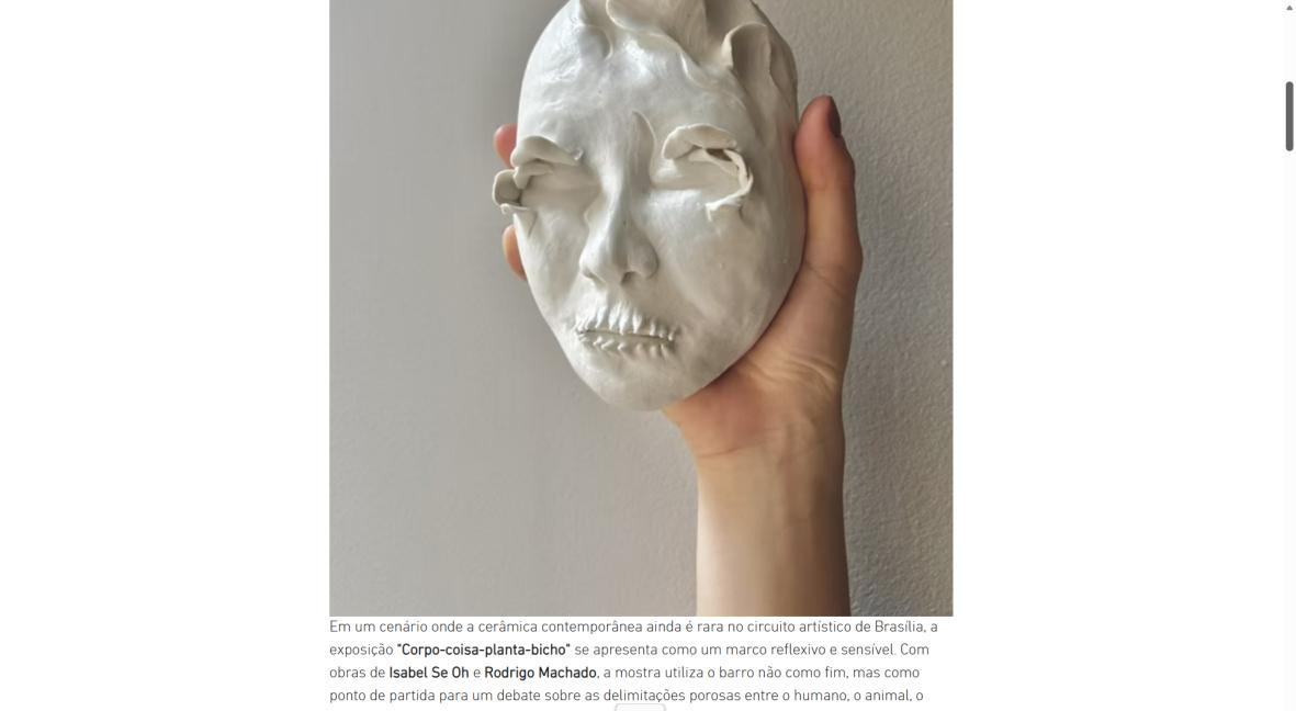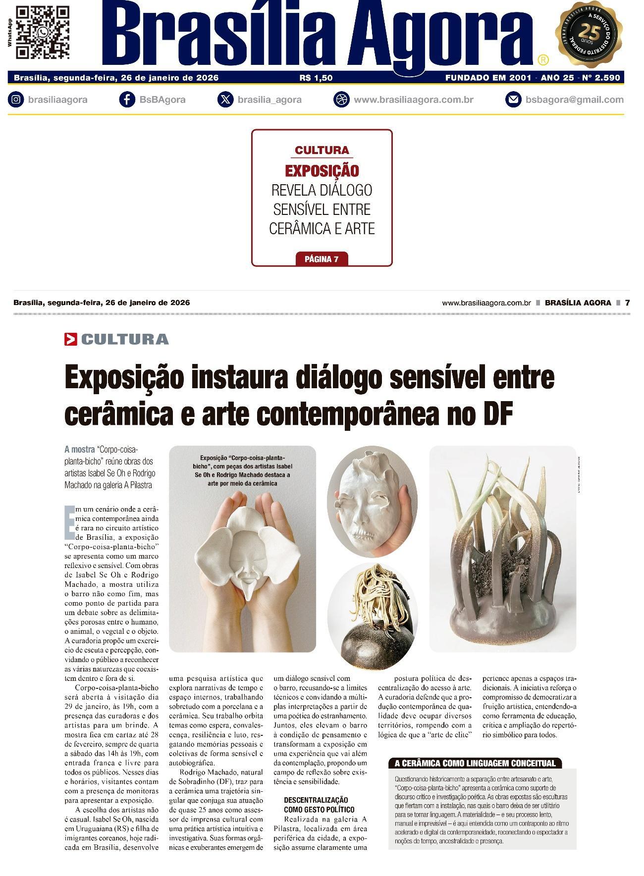 Em um cenário onde a cerâmica contemporânea ainda é rara no circuito artístico de Brasília, a exposição "Corpo-coisa-planta-bicho" se apresenta como um marco reflexivo e sensível. Com obras de Isabel Se Oh e Rodrigo Machado, a mostra utiliza o barro não como fim, mas como ponto de partida para um debate sobre as delimitações porosas entre o humano, o animal, o vegetal e o objeto. A curadoria propõe um exercício de escuta e percepção, convidando o público a reconhecer as várias naturezas que coexistem dentro e fora de si.