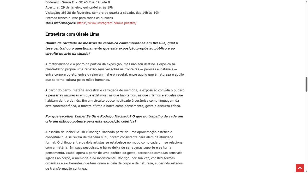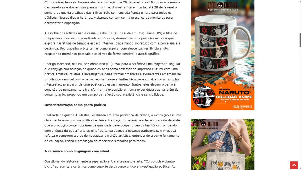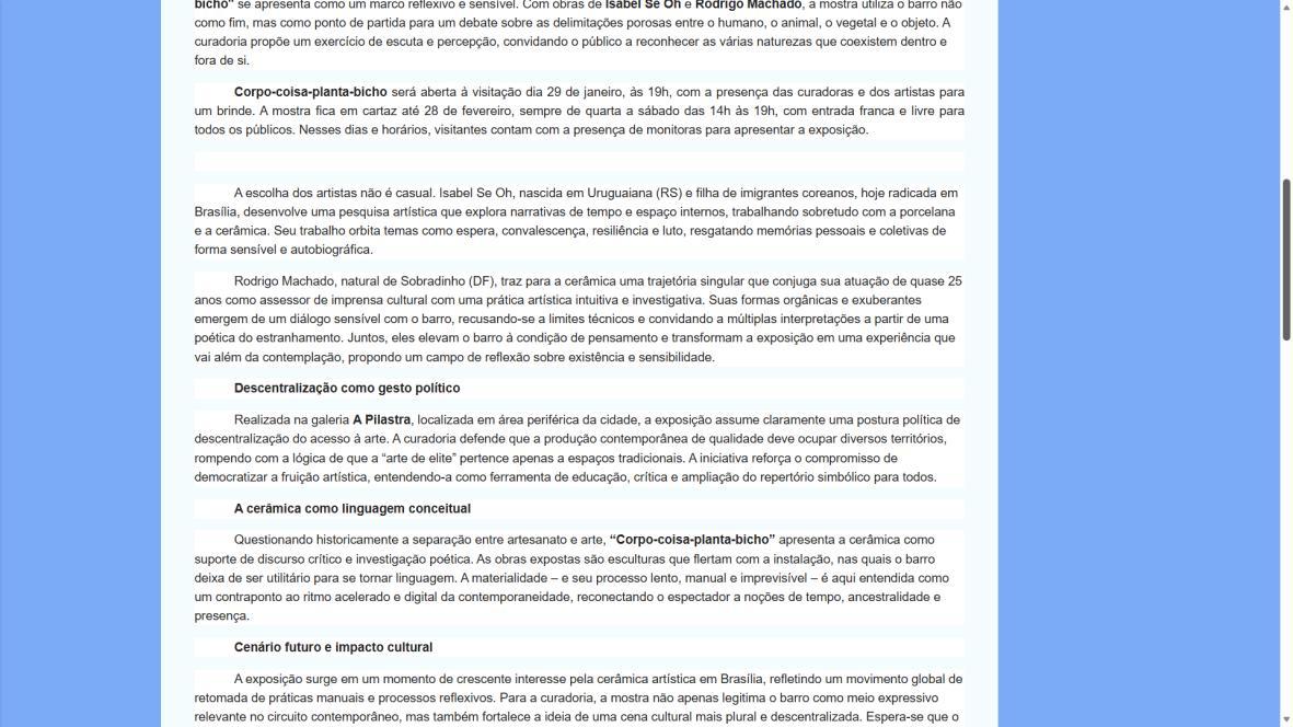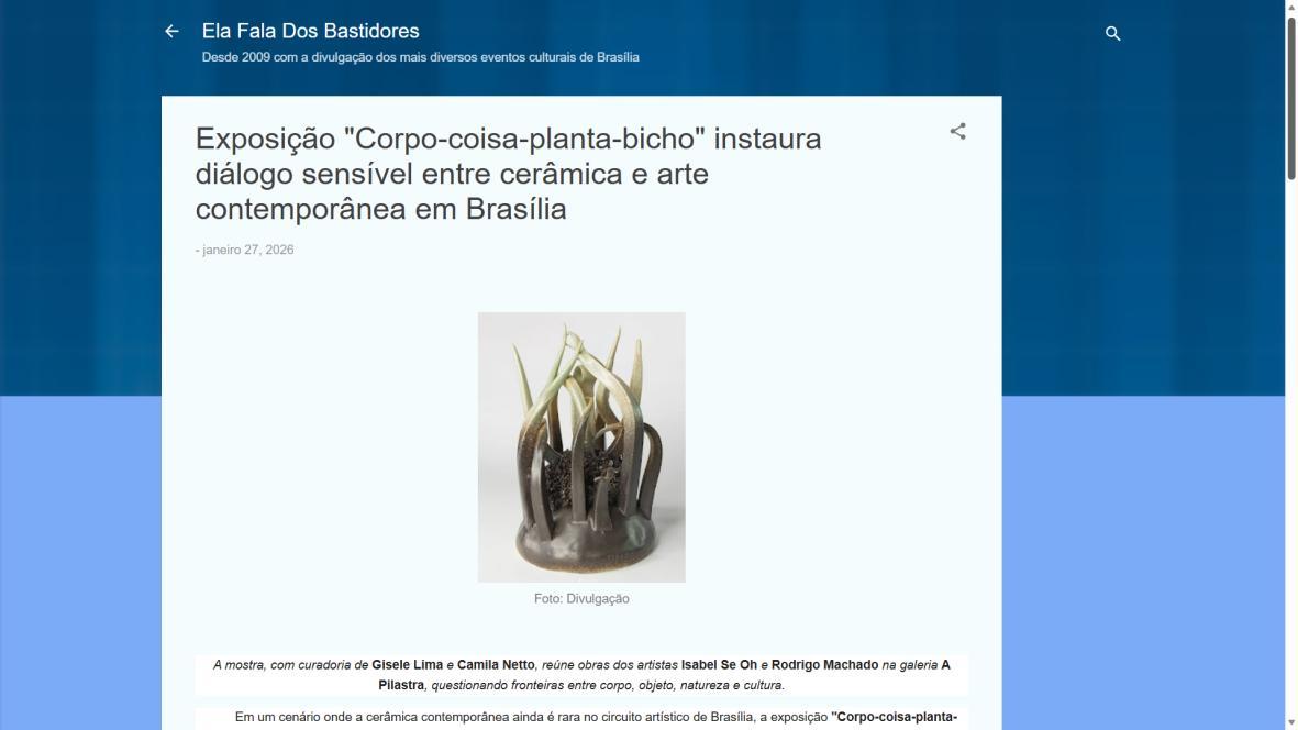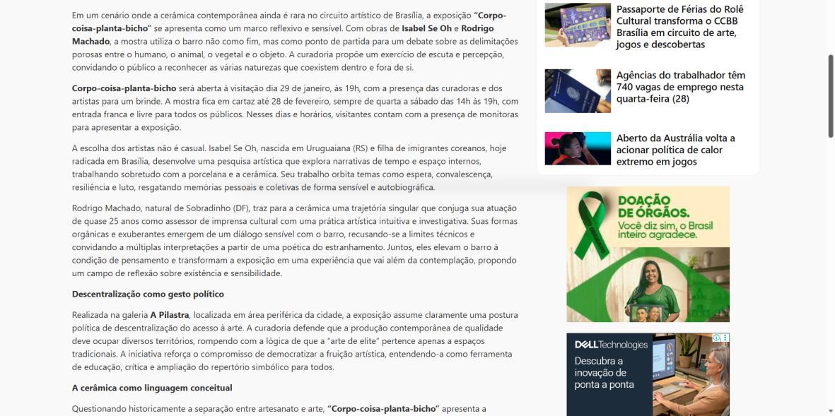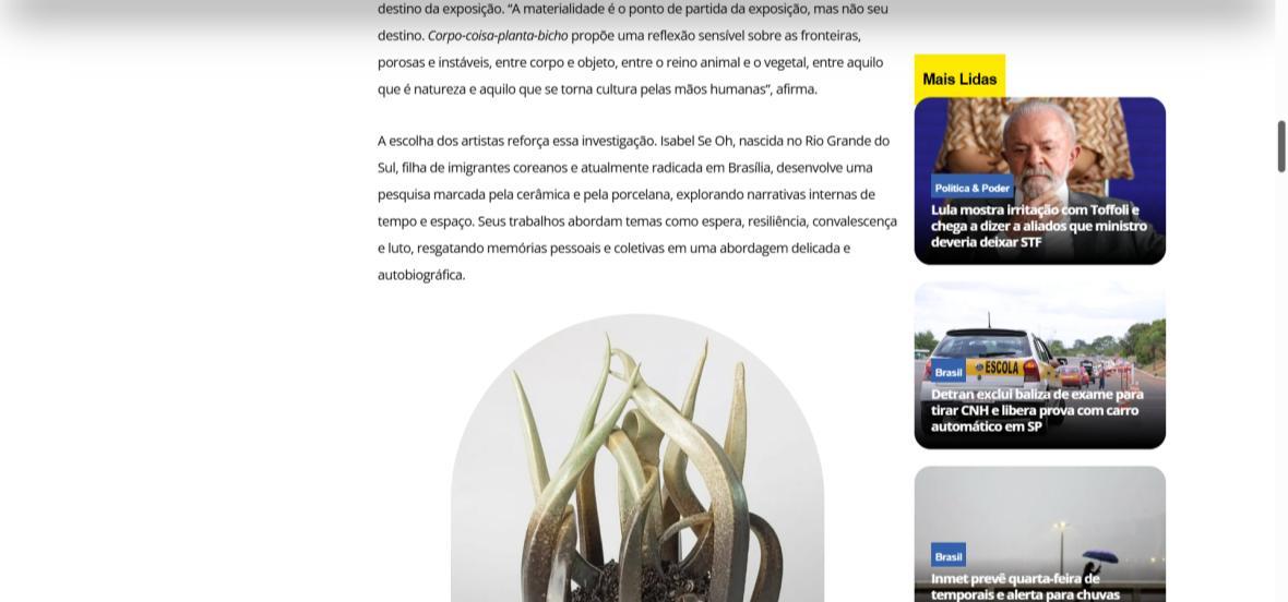 Em um cenário onde a cerâmica contemporânea ainda é rara no circuito artístico de Brasília, a exposição "Corpo-coisa-planta-bicho" se apresenta como um marco reflexivo e sensível. Com obras de Isabel Se Oh e Rodrigo Machado, a mostra utiliza o barro não como fim, mas como ponto de partida para um debate sobre as delimitações porosas entre o humano, o animal, o vegetal e o objeto. A curadoria propõe um exercício de escuta e percepção, convidando o público a reconhecer as várias naturezas que coexistem dentro e fora de si.