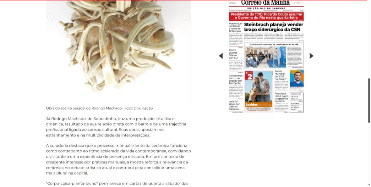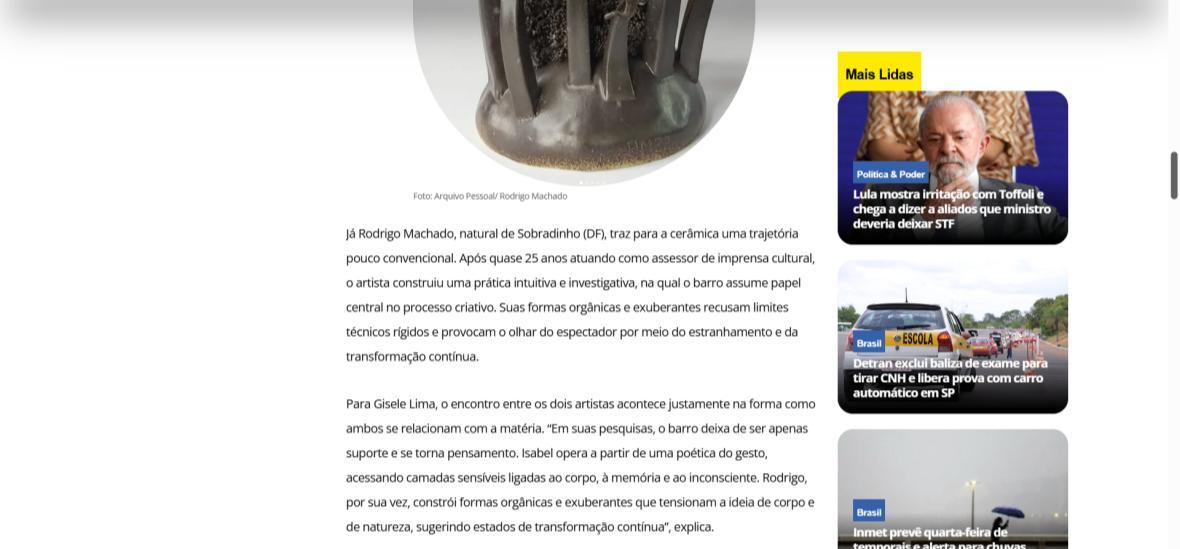 Rodrigo Machado, natural de Sobradinho (DF), traz para a cerâmica uma trajetória singular que conjuga sua atuação de quase 25 anos como assessor de imprensa cultural com uma prática artística intuitiva e investigativa. Suas formas orgânicas e exuberantes emergem de um diálogo sensível com o barro, recusando-se a limites técnicos e convidando a múltiplas interpretações a partir de uma poética do estranhamento. Juntos, eles elevam o barro à condição de pensamento e transformam a exposição em uma experiência que vai além da contemplação, propondo um campo de reflexão sobre existência e sensibilidade.