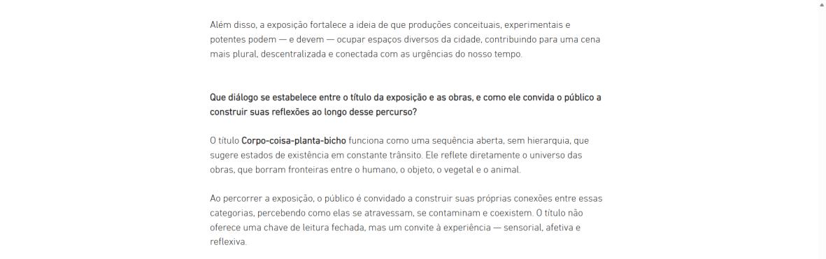 Além disso, a exposição fortalece a ideia de que produções conceituais, experimentais e potentes podem e devem ocupar espaços diversos da cidade, contribuindo para uma cena mais plural, descentralizada e conectada com as urgências do nosso tempo.