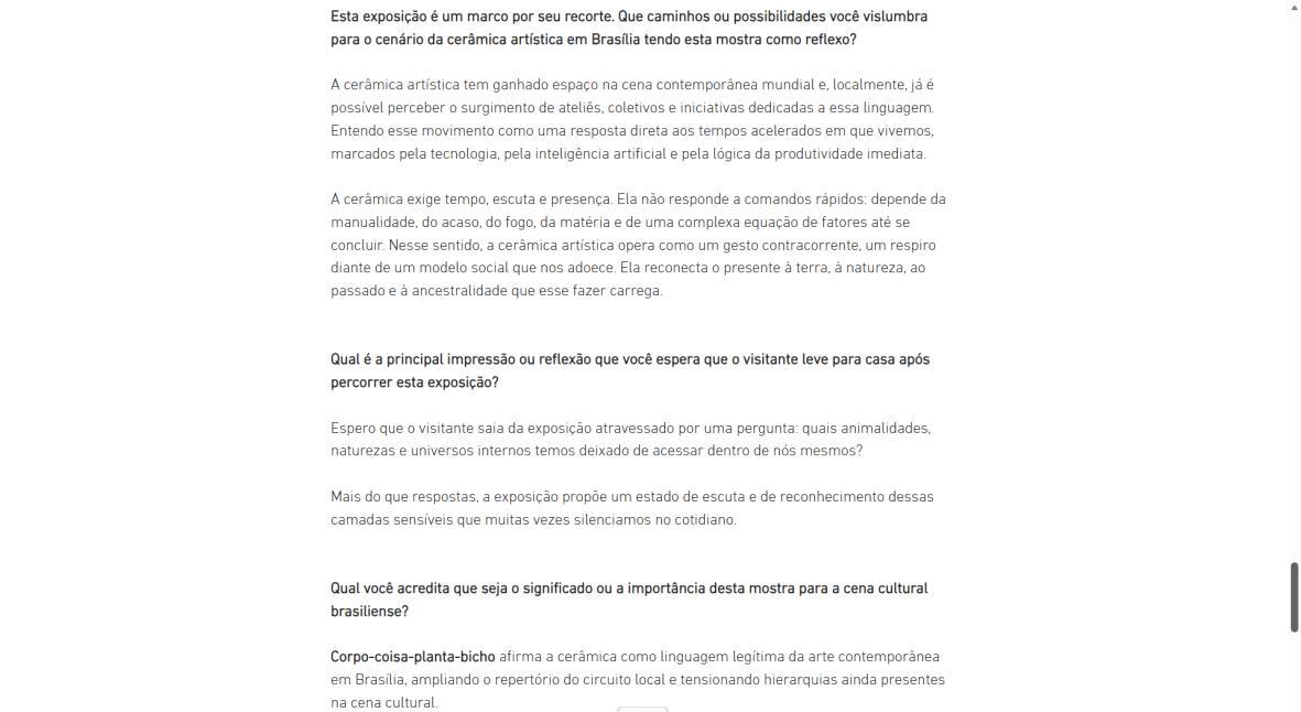 A exposição surge em um momento de crescente interesse pela cerâmica artística em Brasília, refletindo um movimento global de retomada de práticas manuais e processos reflexivos. Para a curadoria, a mostra não apenas legitima o barro como meio expressivo relevante no circuito contemporâneo, mas também fortalece a ideia de uma cena cultural mais plural e descentralizada. Espera-se que o visitante saia atravessado por perguntas sobre as animalidades e naturezas internas muitas vezes silenciadas no cotidiano.
