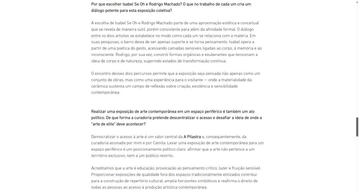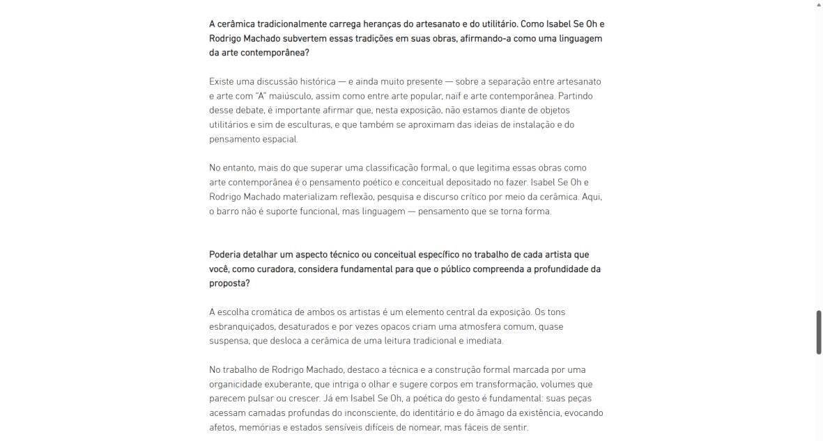 O encontro desses dois percursos permite que a exposição seja pensada não apenas como um conjunto de obras, mas como uma experiência para o visitante onde a materialidade da cerâmica sustenta um campo de reflexão sobre criação, existência e sensibilidade contemporânea.