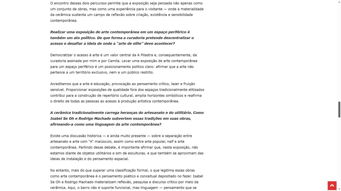 Isabel Se Oh e Rodrigo Machado materializam reflexão, pesquisa e discurso crítico por meio da cerâmica. Aqui, o barro não é suporte funcional, mas linguagem pensamento que se torna forma.