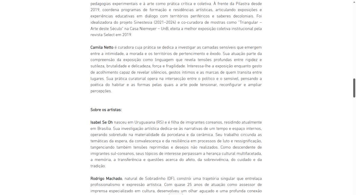 A escolha dos artistas não é casual. Isabel Se Oh, nascida em Uruguaiana (RS) e filha de imigrantes coreanos, hoje radicada em Brasília, desenvolve uma pesquisa artística que explora narrativas de tempo e espaço internos, trabalhando sobretudo com a porcelana e a cerâmica. Seu trabalho orbita temas como espera, convalescença, resiliência e luto, resgatando memórias pessoais e coletivas de forma sensível e autobiográfica.