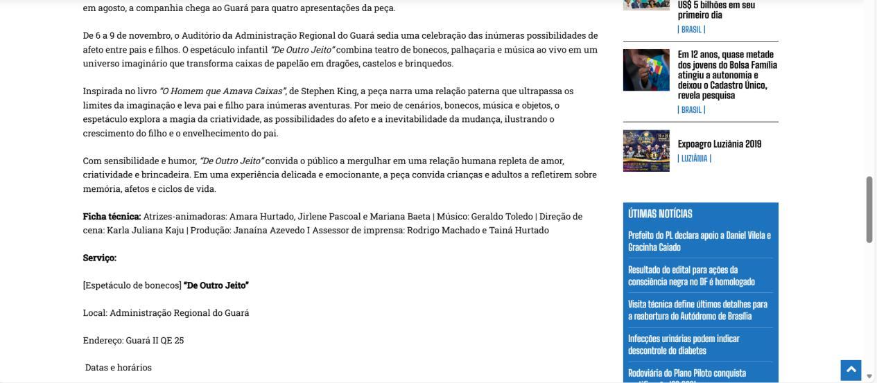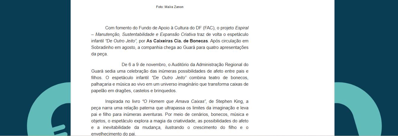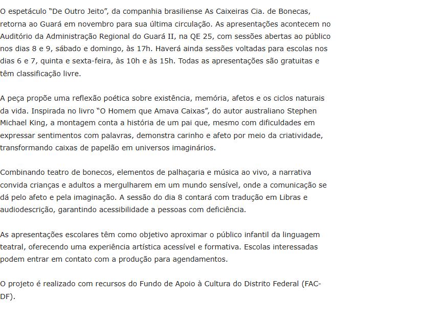 Oficina de Teatro Lambe-lambe para iniciantes (vagas limitadas, inscrições a R$ 50); Temporada do espetáculo De Outro Jeito, inspirado no livro O Homem que Amava Caixas, com apresentações no Guará e em Sobradinho.