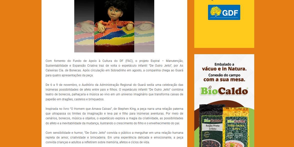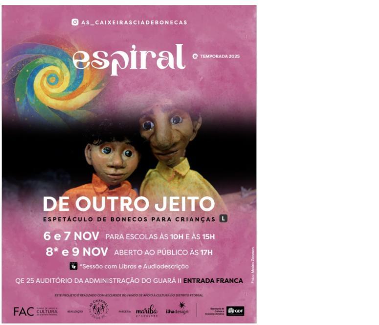 Com fomento do Fundo de Apoio à Cultura do DF (FAC), o projeto Espiral –Manutenção, Sustentabilidade e Expansão Criativa traz de volta o espetáculo infantil “De Outro Jeito”, por As Caixeiras Cia. de Bonecas Após circulação em Sobradinho em agosto, a companhia chega ao Guará para quatro apresentações da peça.