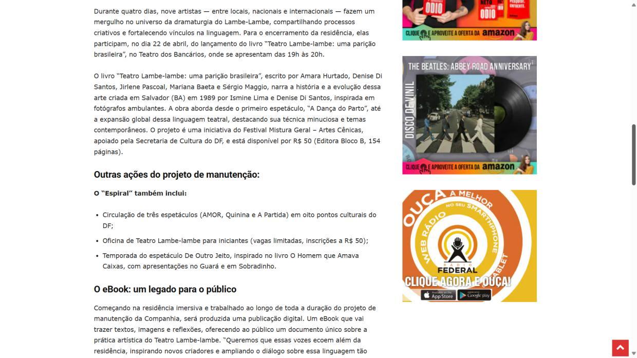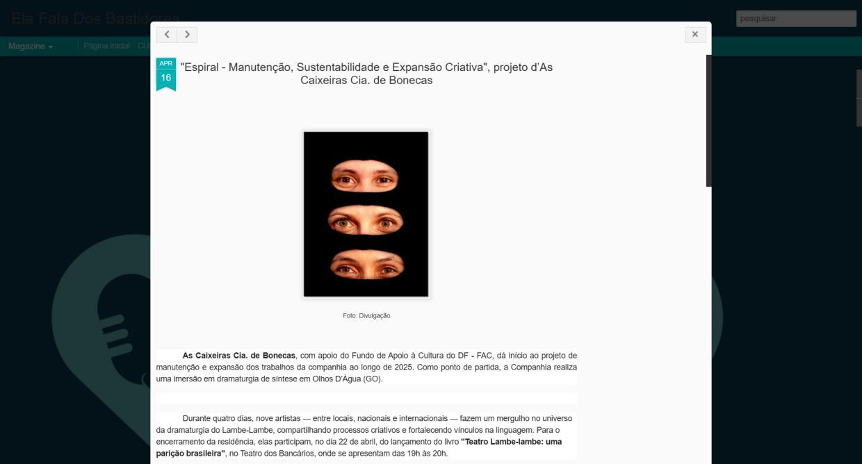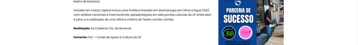 Iniciado em março, Espiral incluiu uma frutífera imersão em dramaturgia em Olhos D'Água (GO) com artistas nacionais e internacionais, apresentações em sete pontos culturais do DF entre abril e julho, e a realização de uma oficina criativa de Teatro LambeLambe.