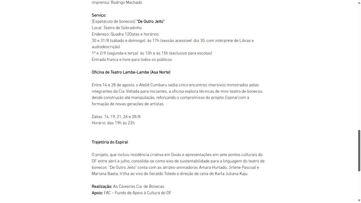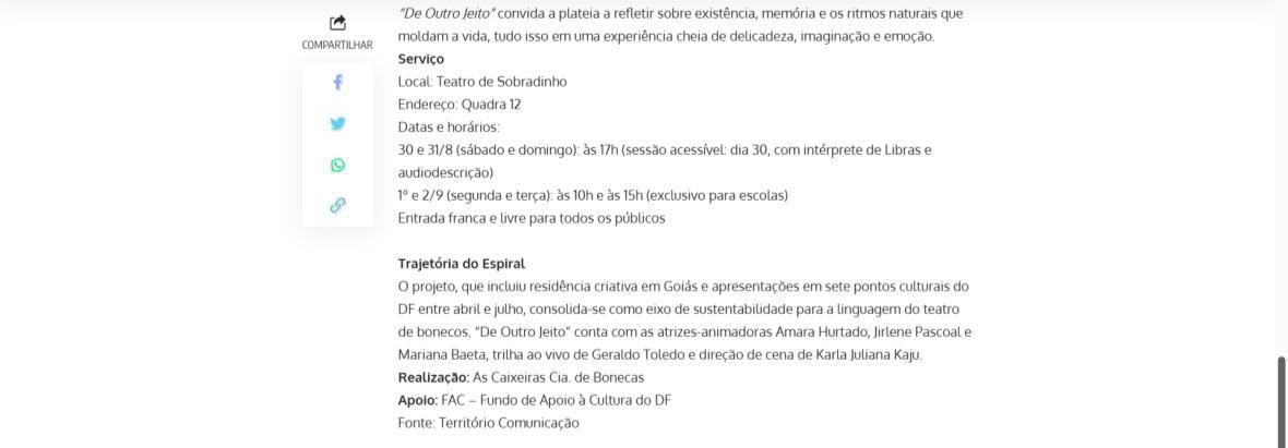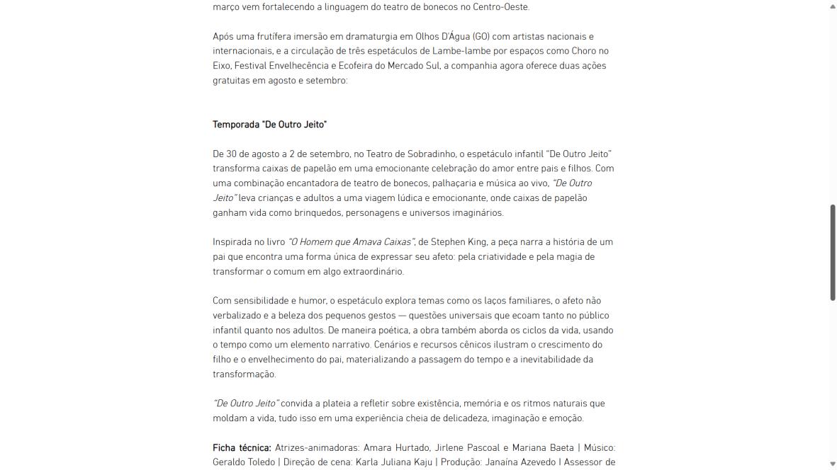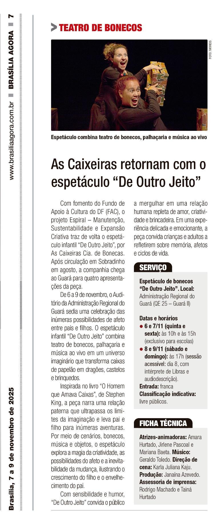 O projeto, que incluiu residência criativa em Goiás e apresentações em sete pontos culturais do DF entre abril e julho, consolida-se como eixo de sustentabilidade para a linguagem do teatro de bonecos. "De Outro Jeito" conta com as atrizes-animadoras Amara Hurtado, Jirlene Pascoal e Mariana Baeta, trilha ao vivo de Geraldo Toledo e direção de cena de Karla Juliana Kaju.