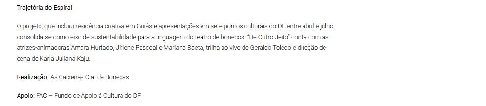 - Manutenção, Sustentabilidade e Expansão Criativa", projeto d’As Caixeiras Cia. de Bonecas - Capital do Entorno