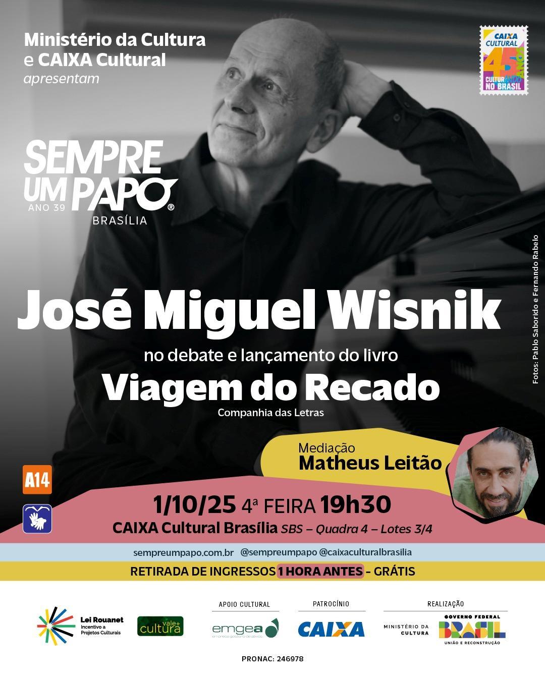 O próximo convidado do projeto Sempre Um Papo na CAIXA Cultural Brasília é o escritor, músico e crítico literário José Miguel Wisnik. Ele vai falar a respeito do seu novo livro, “Viagem do recado: música e literatura”, sob a mediação de Matheus Leitão. O encontro acontece no dia 1º/10, quarta-feira, às 19h30. A entrada é gratuita, num patrocínio da CAIXA / Governo Federal e apoio cultural da Emgea, via Lei Rouanet do Ministério da Cultura. A classificação indicativa é 14 anos, e os ingressos ficam disponíveis uma hora antes do início do evento.
