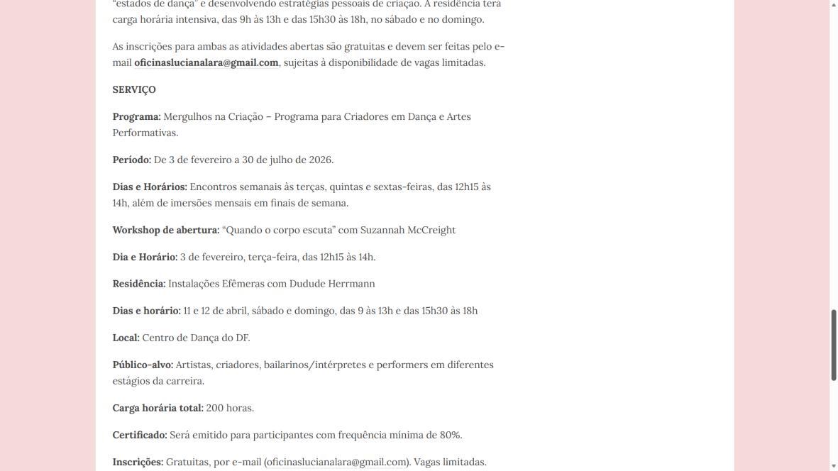 Sob a condução da coreógrafa e diretora Luciana Lara, referência com 37 anos de carreira, o programa se destaca pela proposta de imersão prolongada e pela qualidade das facilitadoras envolvidas. Além da mentoria principal, os participantes contarão com a expertise de duas grandes convidadas: a artista mineira Dudude Herrmann, especialista em improvisação, e a coreógrafa internacional Suzannah McCreight, da Irlanda do Norte. As inscrições gratuitas já estão abertas e devem ser feitas pelo e-mail oficinaslucianalara@gmail.com. As vagas são limitadas.