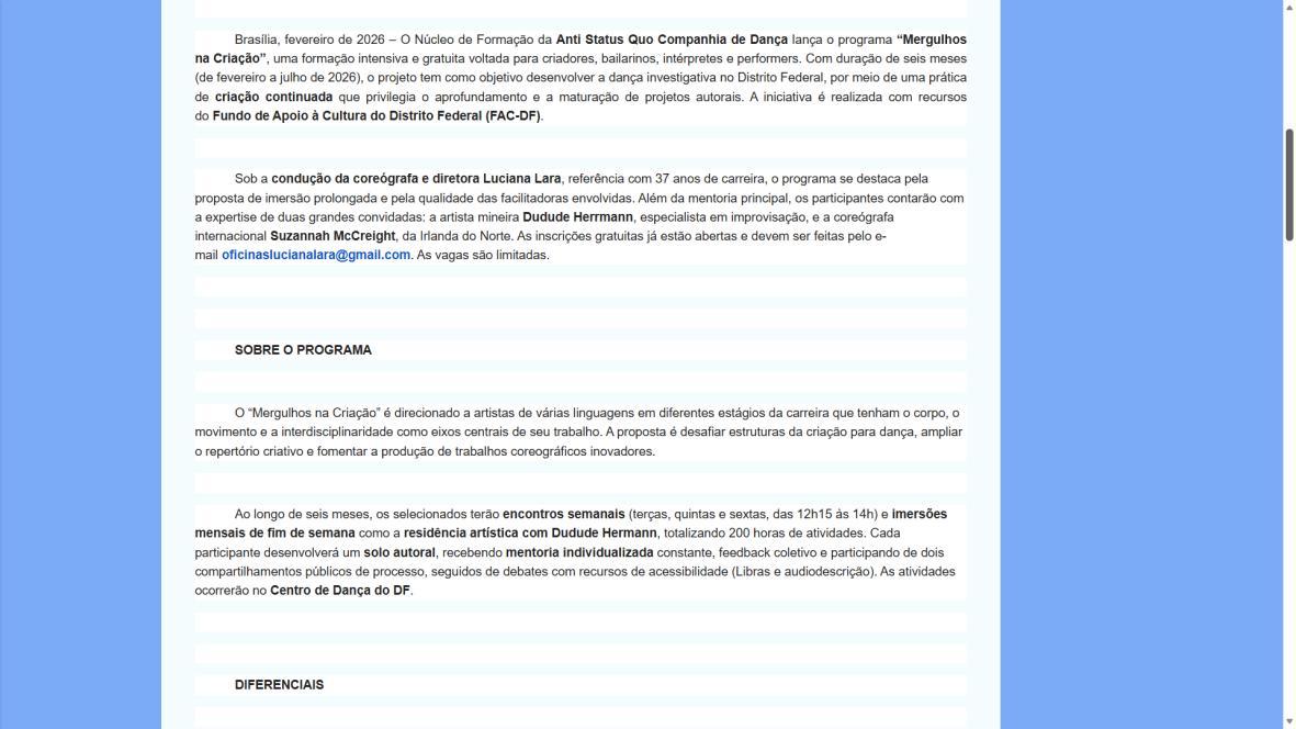 Brasília, fevereiro de 2026 – O Núcleo de Formação da Anti Status Quo Companhia de Dança lança o programa “Mergulhos na Criação”, uma formação intensiva e gratuita voltada para criadores, bailarinos, intérpretes e performers. Com duração de seis meses (de fevereiro a julho de 2026), o projeto tem como objetivo desenvolver a dança investigativa no Distrito Federal, por meio de uma prática de criação continuada que privilegia o aprofundamento e a maturação de projetos autorais. A iniciativa é realizada com recursos do Fundo de Apoio à Cultura do Distrito Federal (FAC-DF)