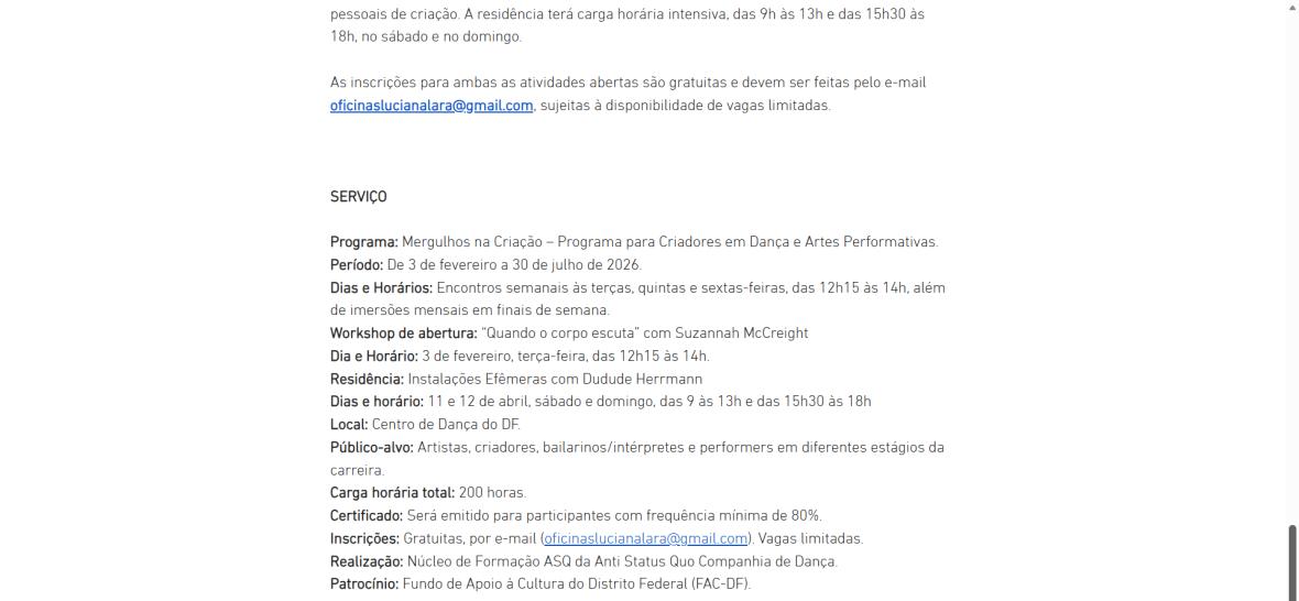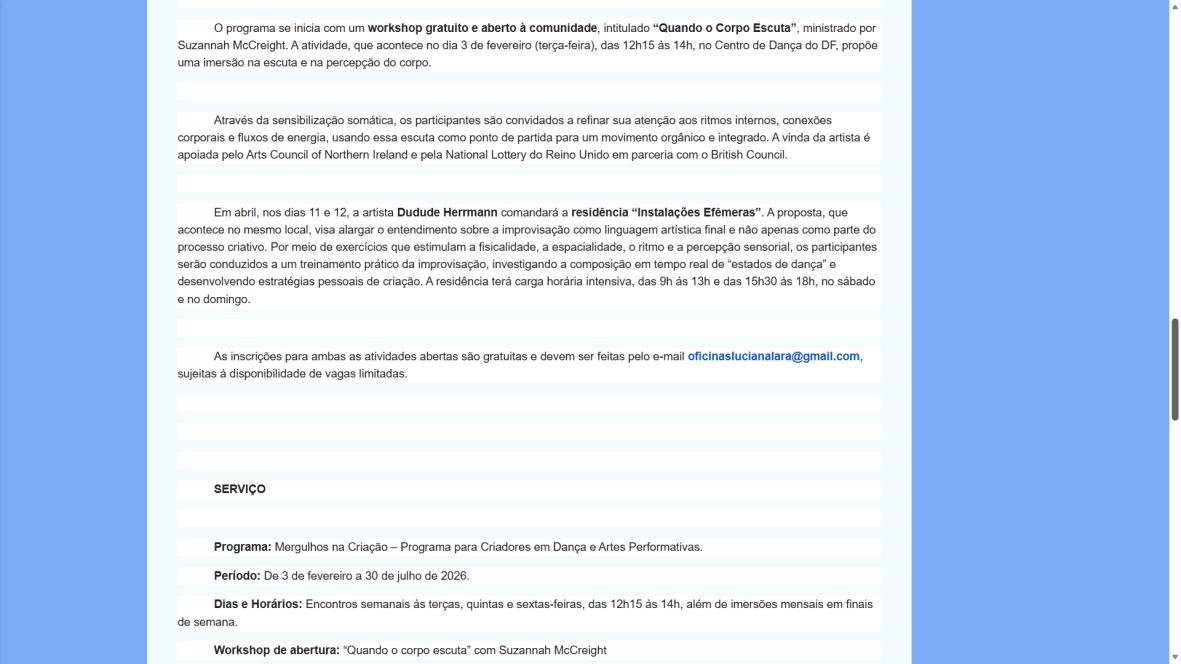O programa se inicia com um workshop gratuito e aberto à comunidade, intitulado “Quando o Corpo Escuta”, ministrado por Suzannah McCreight. A atividade, que acontece no dia 3 de fevereiro (terça-feira), das 12h15 às 14h, no Centro de Dança do DF, propõe uma imersão na escuta e na percepção do corpo.
