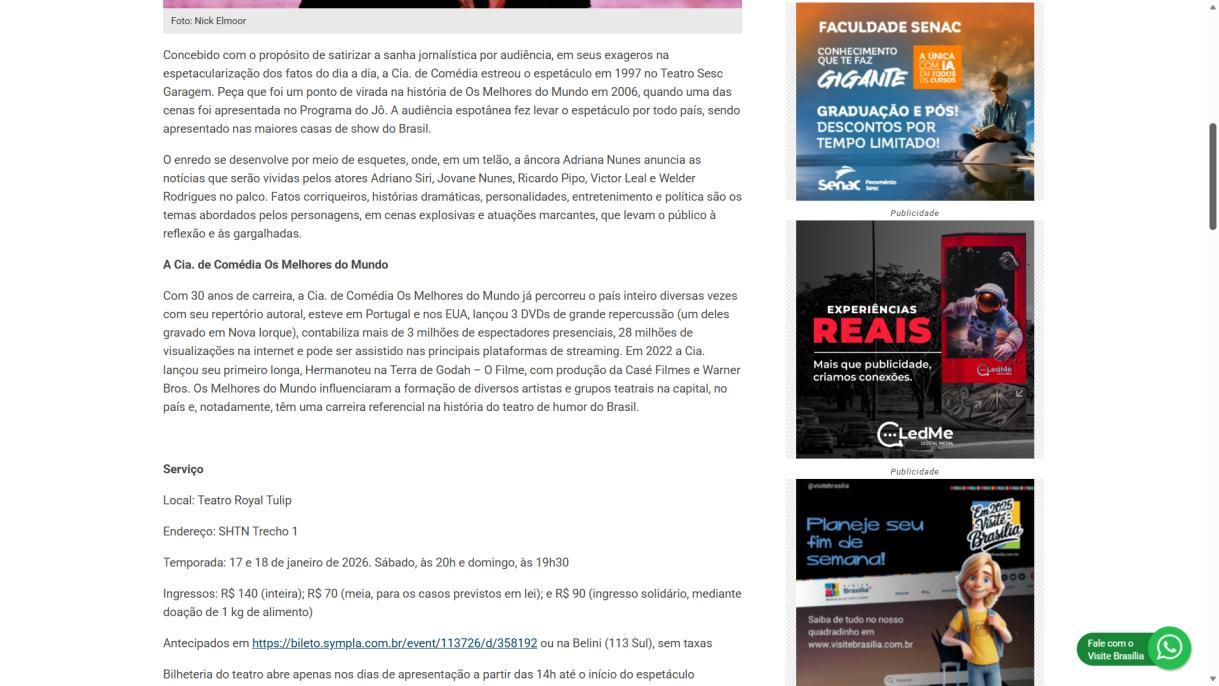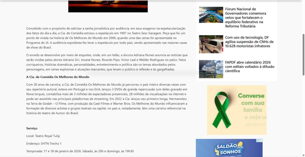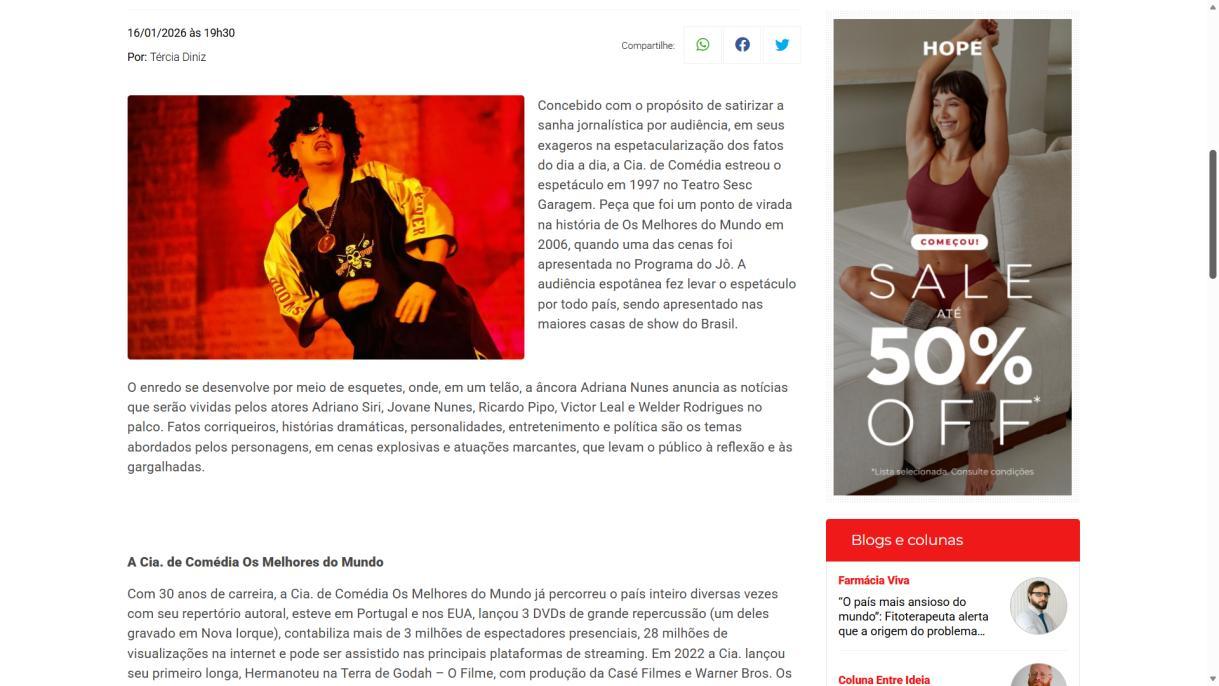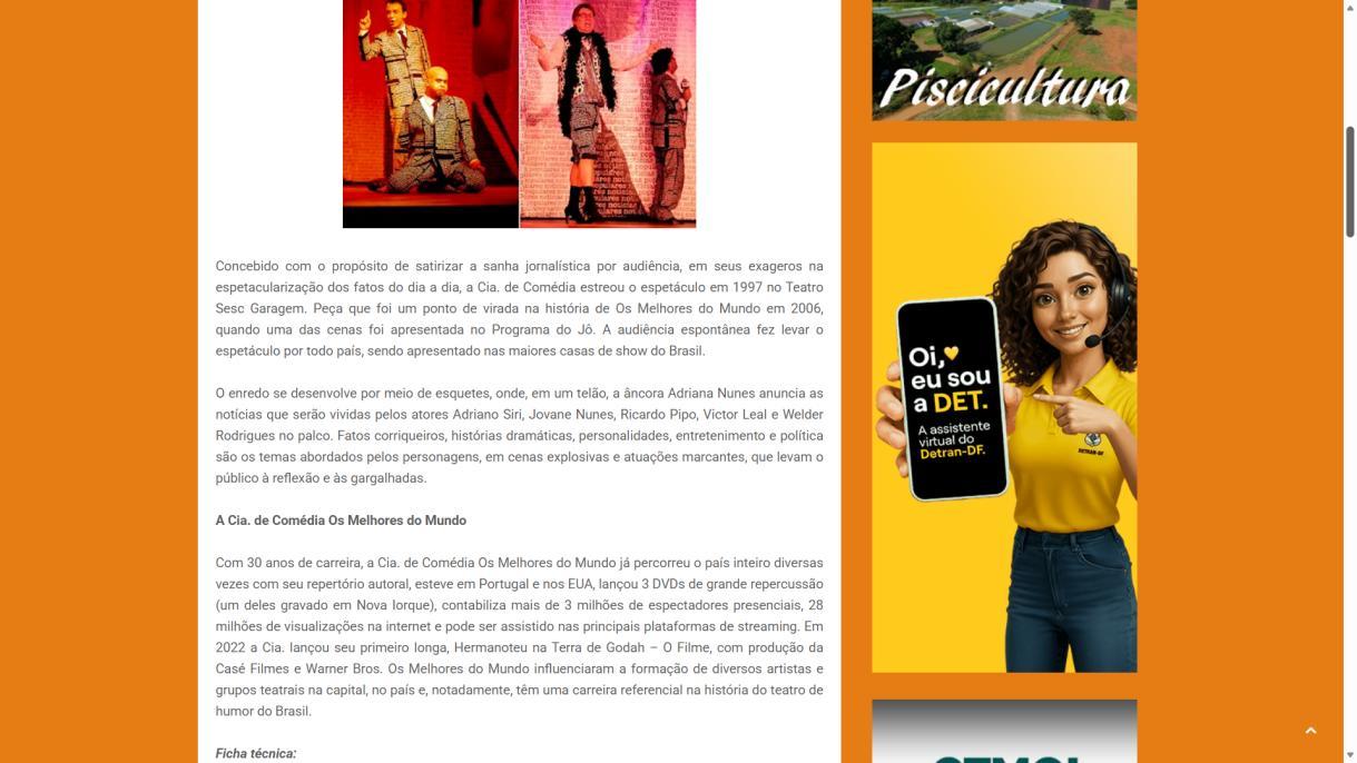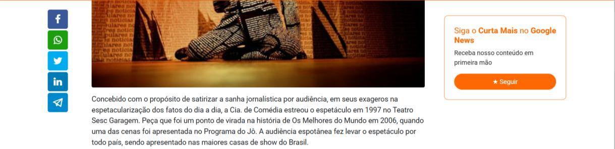 Concebido com o propósito de satirizar a sanha jornalística por audiência, em seus exageros na espetacularização dos fatos do dia a dia, a Cia. de Comédia estreou o espetáculo em 1997 no Teatro Sesc Garagem. Peça que foi um ponto de virada na história de Os Melhores do Mundo em 2006, quando uma das cenas foi apresentada no Programa do Jô. A audiência espotânea fez levar o espetáculo por todo país, sendo apresentado nas maiores casas de show do Brasil.