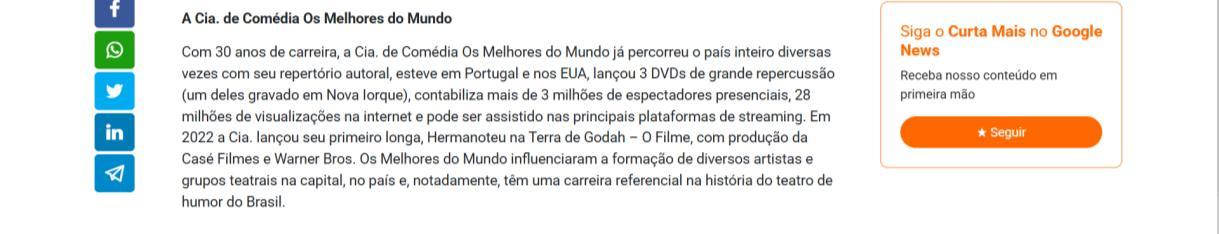 Com 30 anos de carreira, a Cia. de Comédia Os Melhores do Mundo já percorreu o país inteiro diversas vezes com seu repertório autoral, esteve em Portugal e nos EUA, lançou 3 DVDs de grande repercussão (um deles gravado em Nova Iorque), contabiliza mais de 3 milhões de espectadores presenciais, 28 milhões de visualizações na internet e pode ser assistido nas principais plataformas de streaming. Em 2022 a Cia. lançou seu primeiro longa, Hermanoteu na Terra de Godah – O Filme, com produção da Casé Filmes e Warner Bros. Os Melhores do Mundo influenciaram a formação de diversos artistas e grupos teatrais na capital, no país e, notadamente, têm uma carreira referencial na história do teatro de humor do Brasil