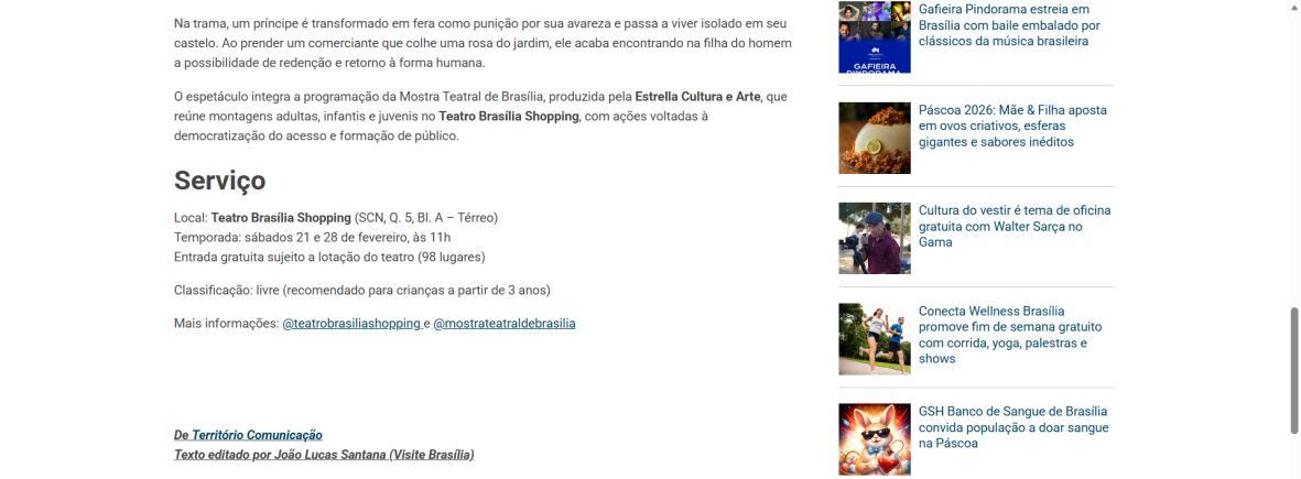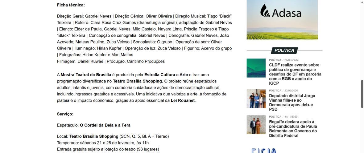 A Mostra Teatral de Brasília é produzida pela Estrella Cultura e Arte e traz uma programação diversificada no Teatro Brasília Shopping. O projeto reúne espetáculos adultos, infantis e juvenis, com curadoria cuidadosa e ações de democratização cultural, incluindo ingressos gratuitos e acessíveis. Uma iniciativa que valoriza a arte, a formação de plateia e o impacto econômico, graças ao apoio essencial da Lei Rouanet.