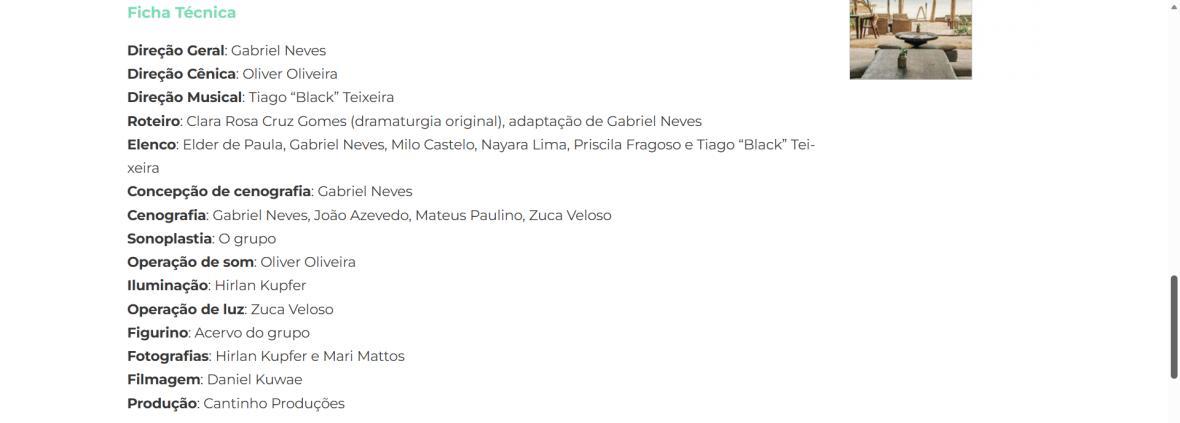Direção Geral: Gabriel Neves | Direção Cênica: Oliver Oliveira | Direção Musical: Tiago "Black" Teixeira | Roteiro: Clara Rosa Cruz Gomes (dramaturgia original), adaptação de Gabriel Neves | Elenco: Elder de Paula, Gabriel Neves, Milo Castelo, Nayara Lima, Priscila Fragoso e Tiago "Black" Teixeira | Concepção de cenografia: Gabriel Neves | Cenografia: Gabriel Neves, João Azevedo, Mateus Paulino, Zuca Veloso | Sonoplastia: O grupo | Operação de som: Oliver Oliveira | Iluminação: Hirlan Kupfer | Operação de luz: Zuca Veloso | Figurino: Acervo do grupo | Fotografias: Hirlan Kupfer e Mari Mattos
