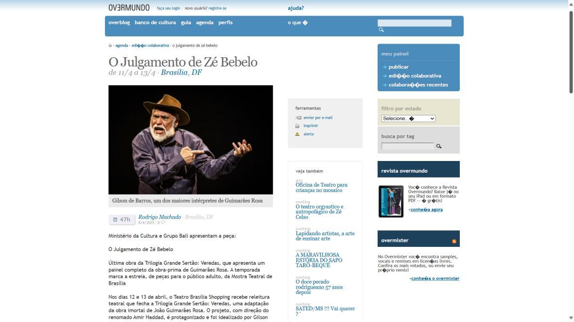 Última obra da Trilogia Grande Sertão: Veredas, que apresenta um painel completo da obra-prima de Guimarães Rosa A temporada marca a estreia, de peças para o público adulto, da Mostra Teatral de Brasília