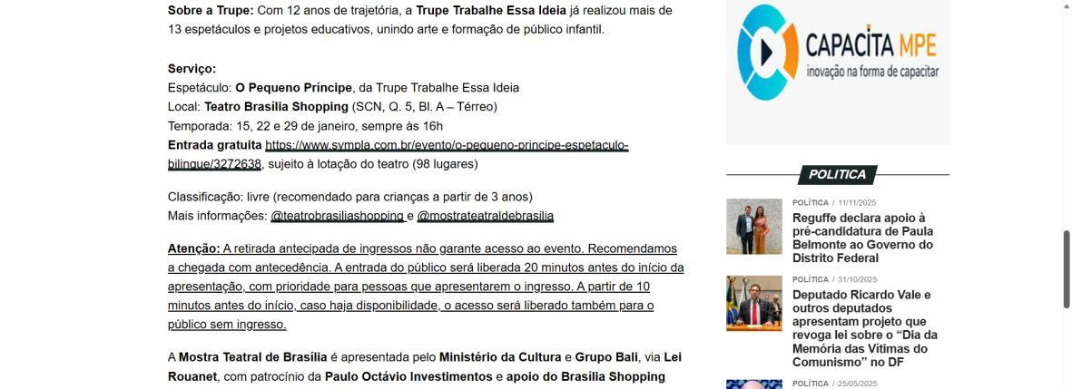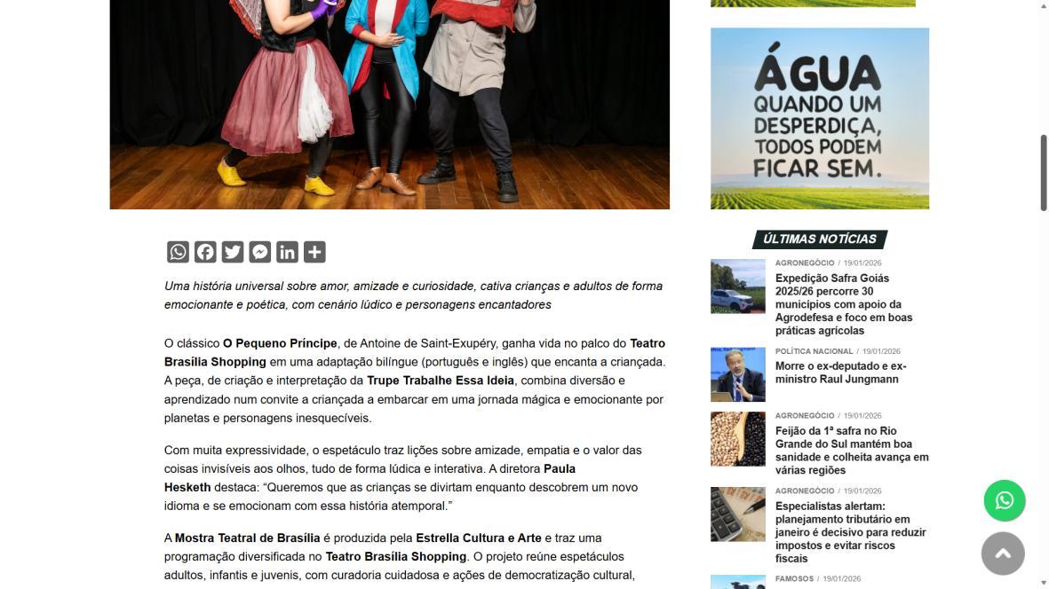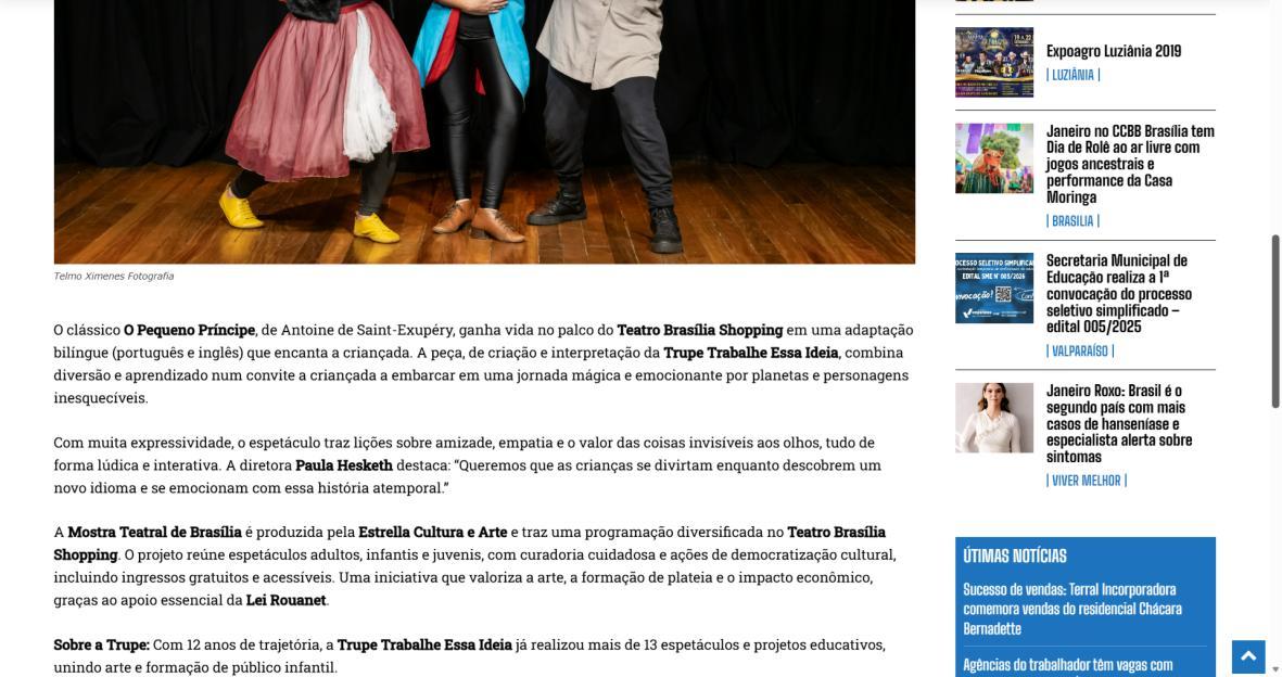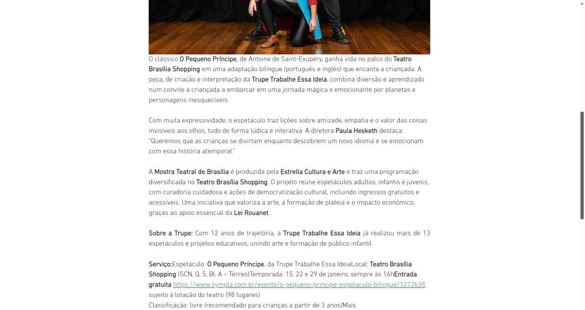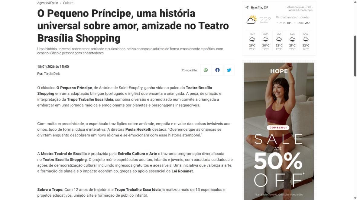 A Mostra Teatral de Brasília é produzida pela Estrella Cultura e Arte e traz uma programação diversificada no Teatro Brasília Shopping. O projeto reúne espetáculos adultos, infantis e juvenis, com curadoria cuidadosa e ações de democratização cultural, incluindo ingressos gratuitos e acessíveis. Uma iniciativa que valoriza a arte, a formação de plateia e o impacto econômico, graças ao apoio essencial da Lei Rouanet.