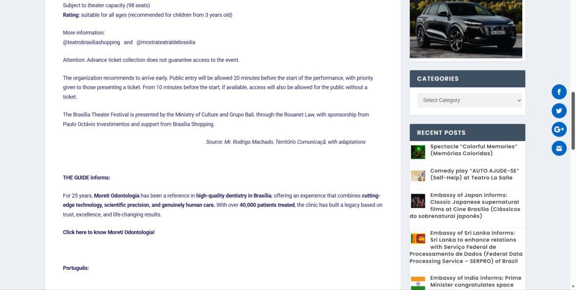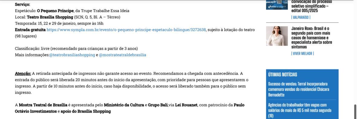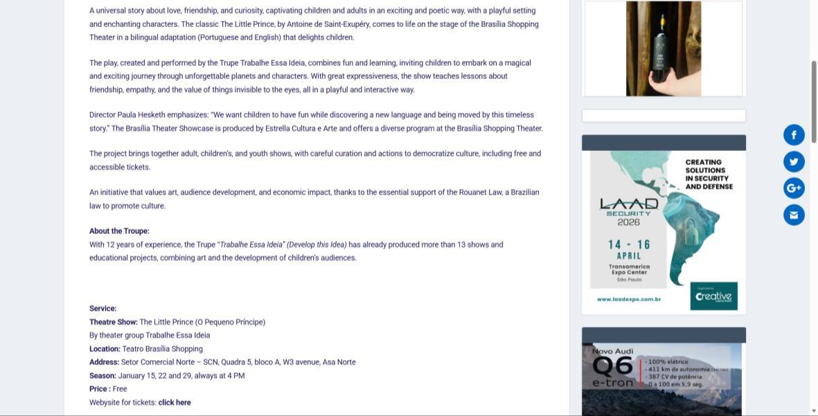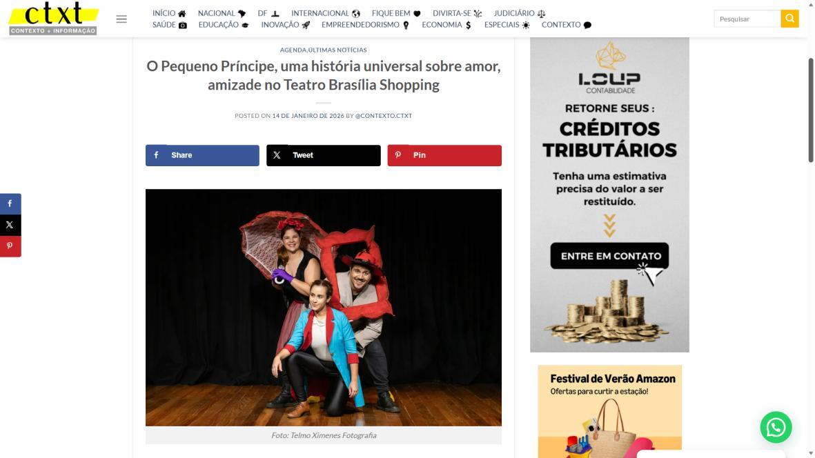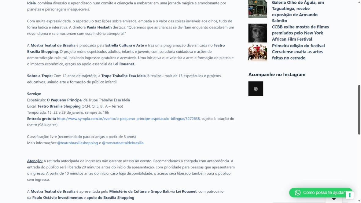A Mostra Teatral de Brasília é produzida pela Estrella Cultura e Arte e traz uma programação diversificada no Teatro Brasília Shopping. O projeto reúne espetáculos adultos, infantis e juvenis, com curadoria cuidadosa e ações de democratização cultural, incluindo ingressos gratuitos e acessíveis. Uma iniciativa que valoriza a arte, a formação de plateia e o impacto econômico, graças ao apoio essencial da Lei Rouanet.
