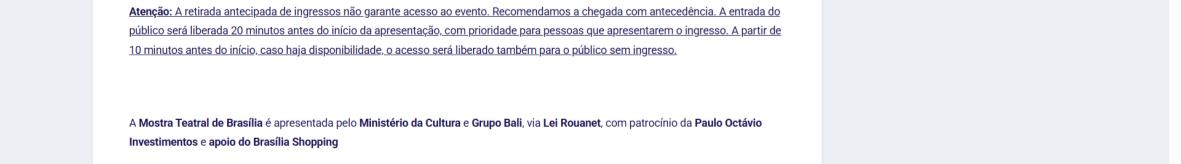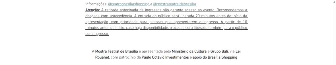 Atenção: A retirada antecipada de ingressos não garante acesso ao evento. Recomendamos a chegada com antecedência. A entrada do público será liberada 20 minutos antes do início da apresentação, com prioridade para pessoas que apresentarem o ingresso. A partir de 10 minutos antes do início, caso haja disponibilidade, o acesso será liberado também para o público sem ingresso.