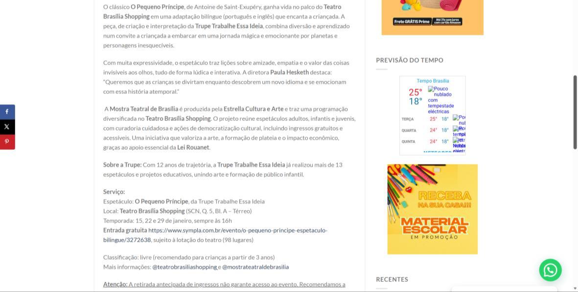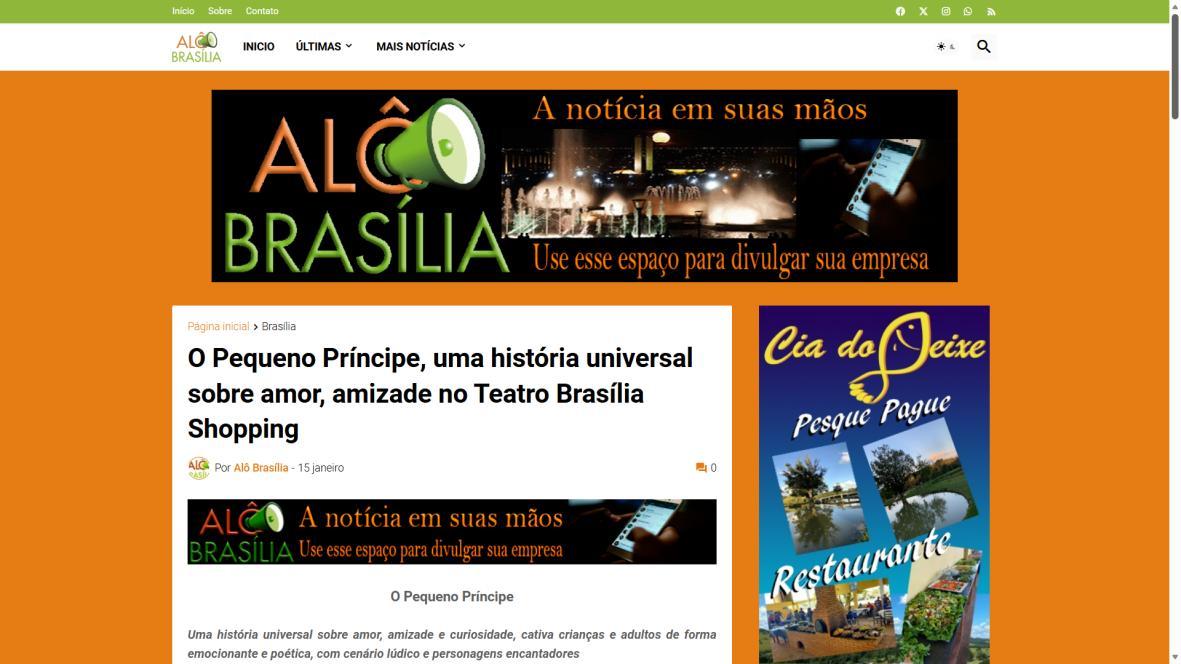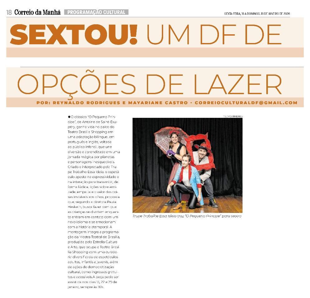 O clássico O Pequeno Príncipe, de Antoine de Saint-Exupéry, ganha vida no palco do Teatro Brasília Shopping em uma adaptação bilíngue (português e inglês) que encanta a criançada. A peça, de criação e interpretação da Trupe Trabalhe Essa Ideia, combina diversão e aprendizado num convite a criançada a embarcar em uma jornada mágica e emocionante por planetas e personagens inesquecíveis.