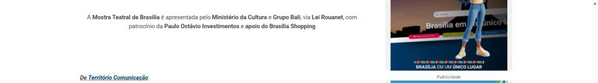 A Mostra Teatral de Brasília é apresentada pelo Ministério da Cultura e Grupo Bali, via Lei Rouanet, com patrocínio da Paulo Octávio Investimentos e apoio do Brasília Shopping