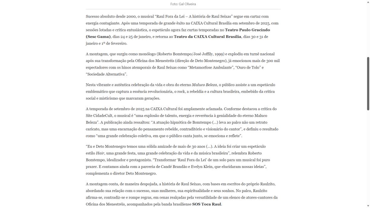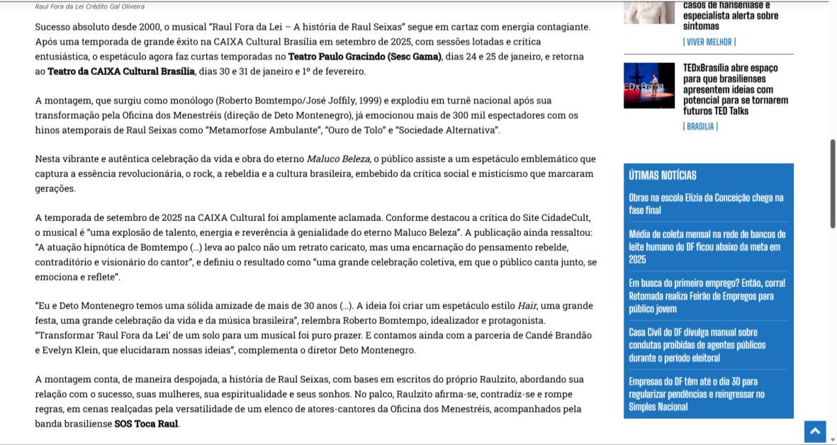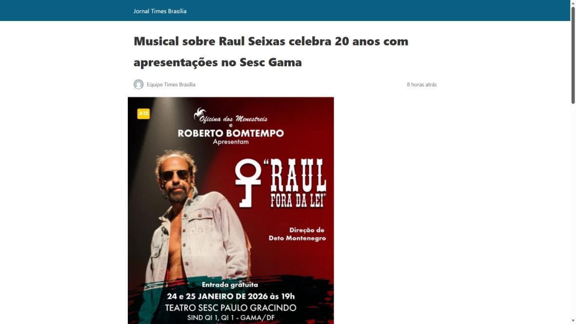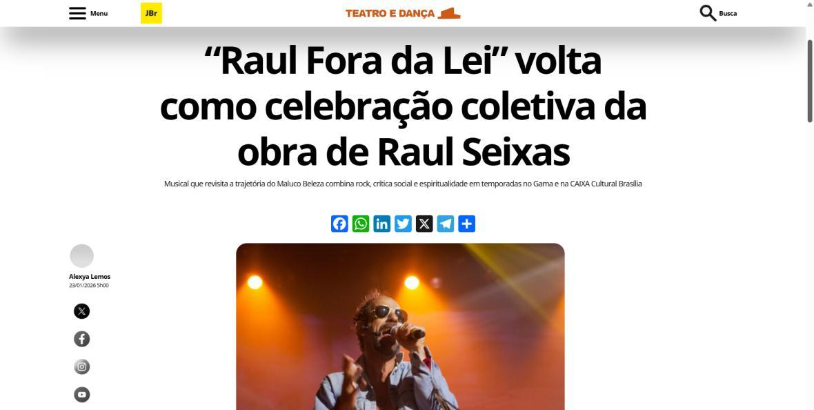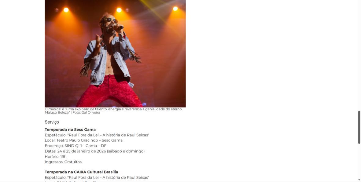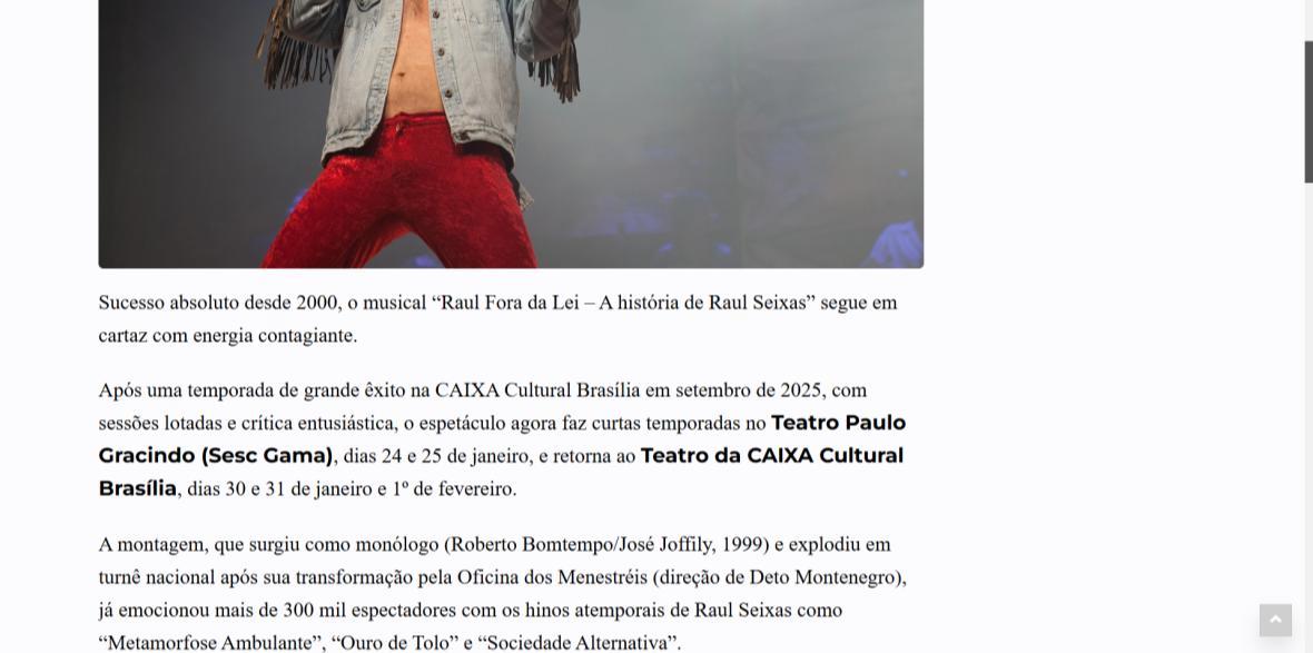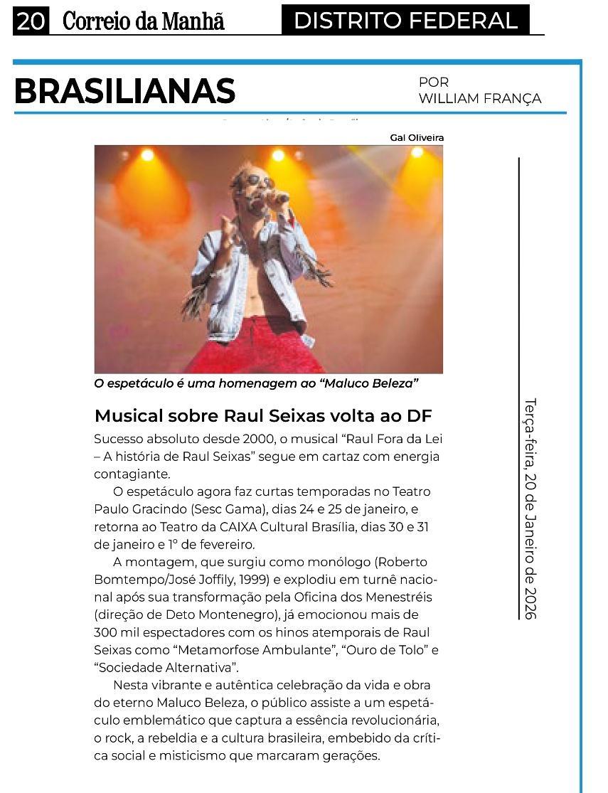 Sucesso absoluto desde 2000, o musical "Raul Fora da Lei – A história de Raul Seixas" segue em cartaz com energia contagiante. Após uma temporada de grande êxito na CAIXA Cultural Brasília em setembro de 2025, com sessões lotadas e crítica entusiástica, o espetáculo agora faz curtas temporadas no Teatro Paulo Gracindo (Sesc Gama), dias 24 e 25 de janeiro, e retorna ao Teatro da CAIXA Cultural Brasília, dias 30 e 31 de janeiro e 1º de fevereiro.
