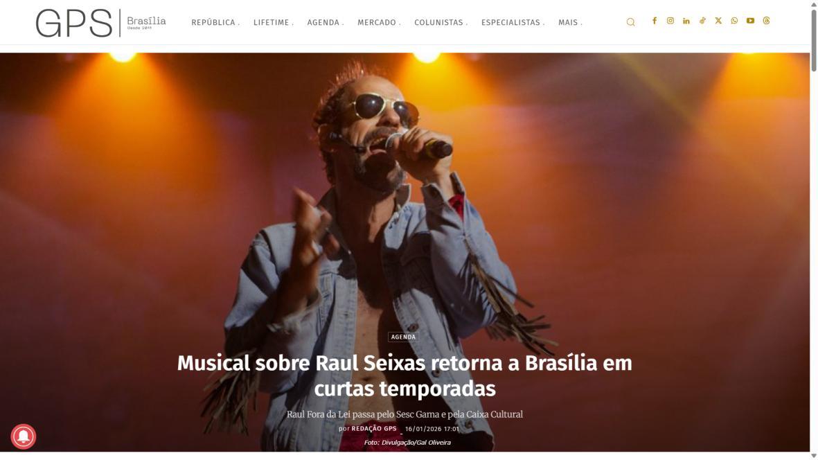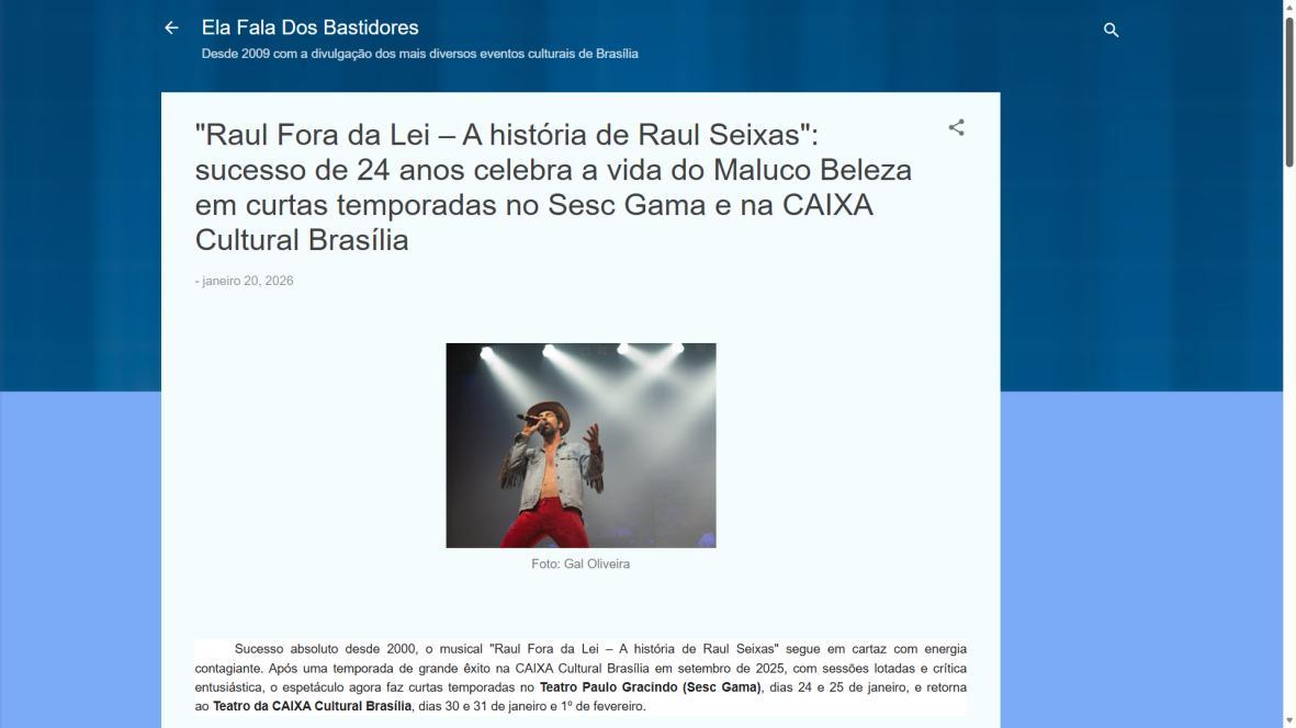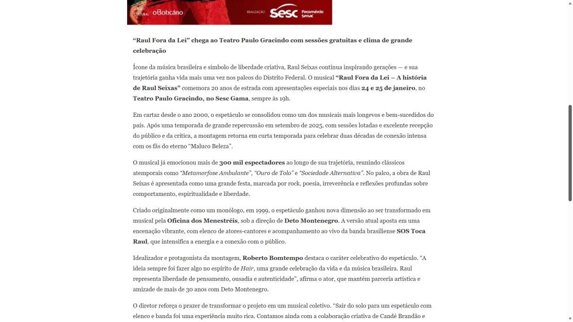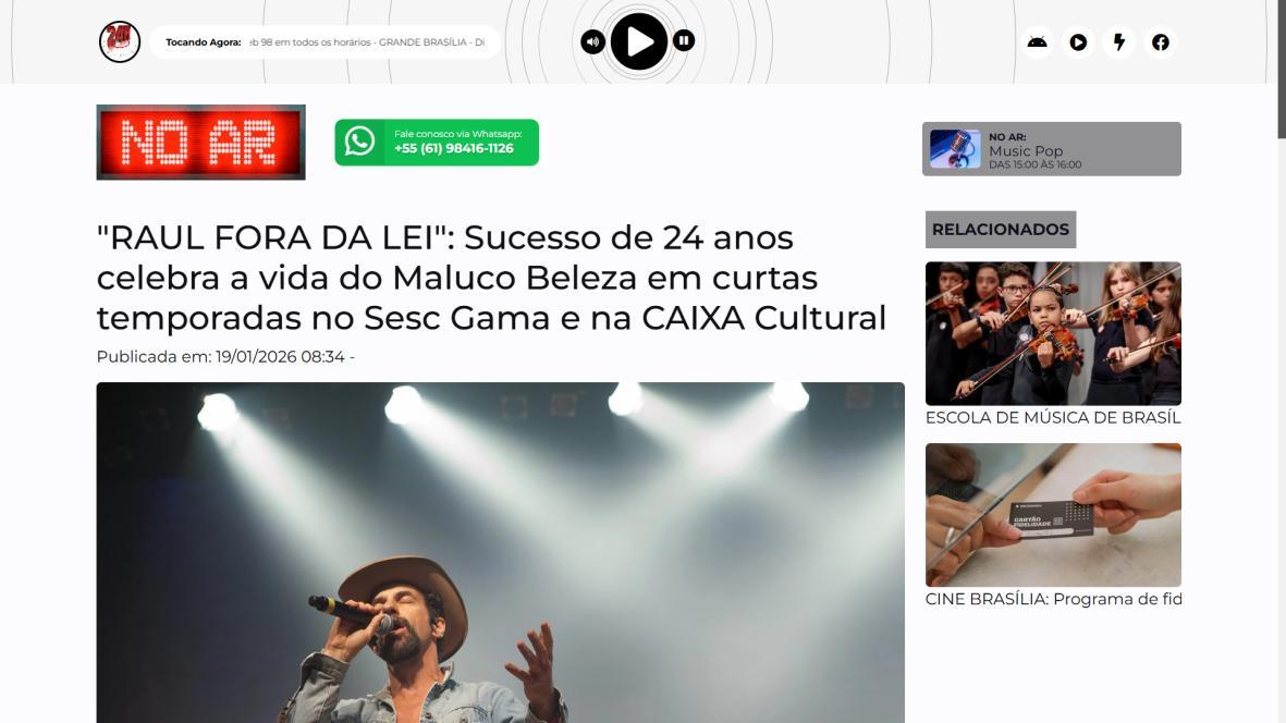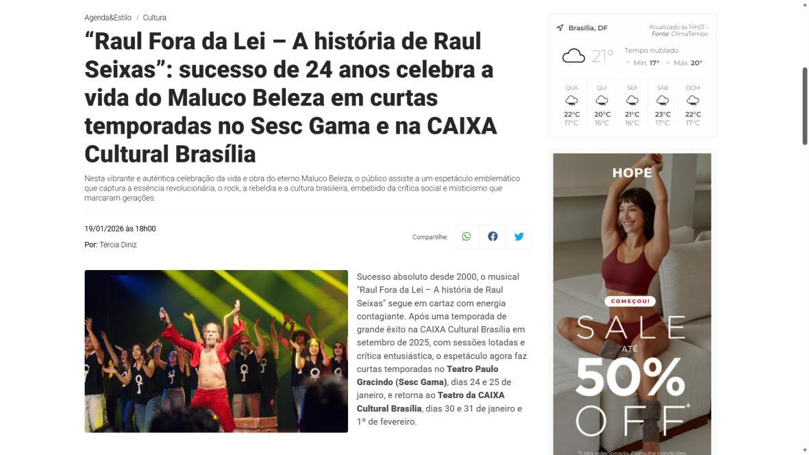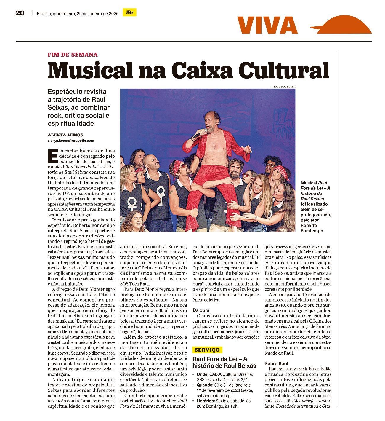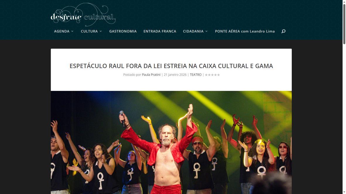 Sucesso absoluto desde 2000, o musical "Raul Fora da Lei – A história de Raul Seixas" segue em cartaz com energia contagiante. Após uma temporada de grande êxito na CAIXA Cultural Brasília em setembro de 2025, com sessões lotadas e crítica entusiástica, o espetáculo agora faz curtas temporadas no Teatro Paulo Gracindo (Sesc Gama), dias 24 e 25 de janeiro, e retorna ao Teatro da CAIXA Cultural Brasília, dias 30 e 31 de janeiro e 1º de fevereiro.