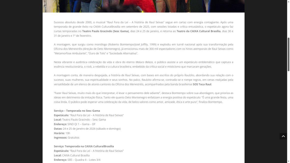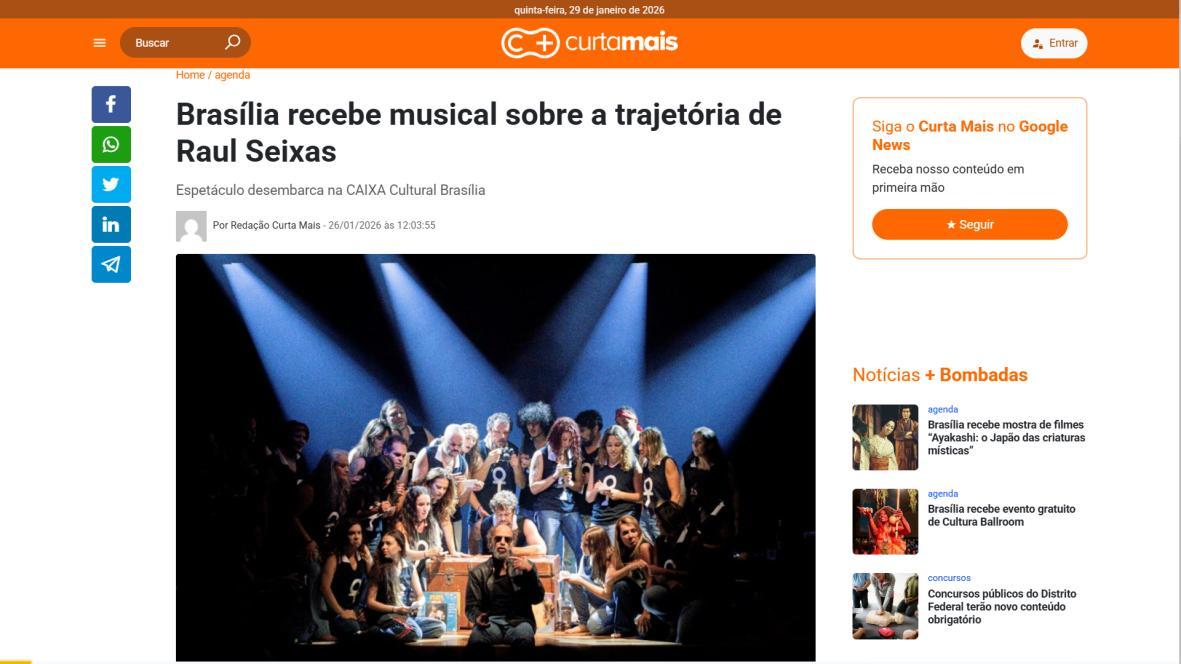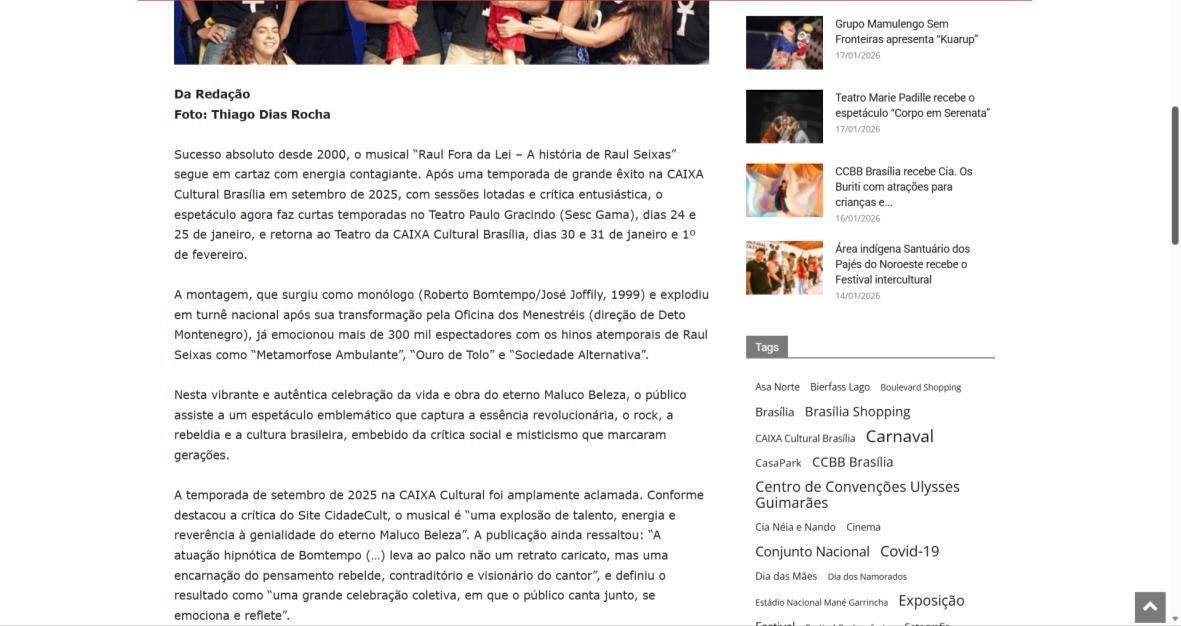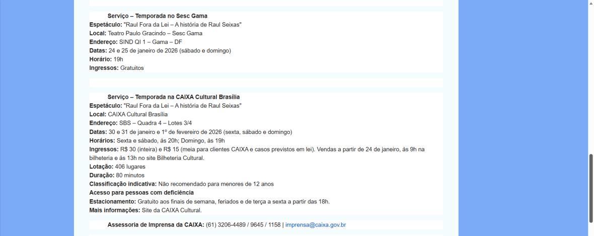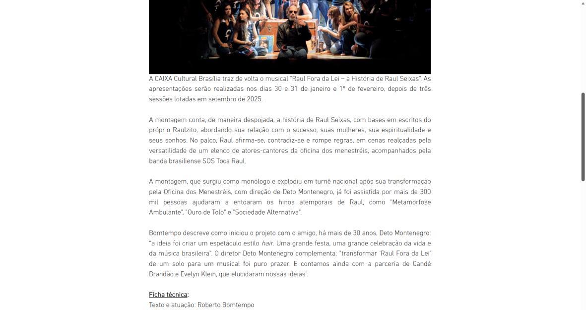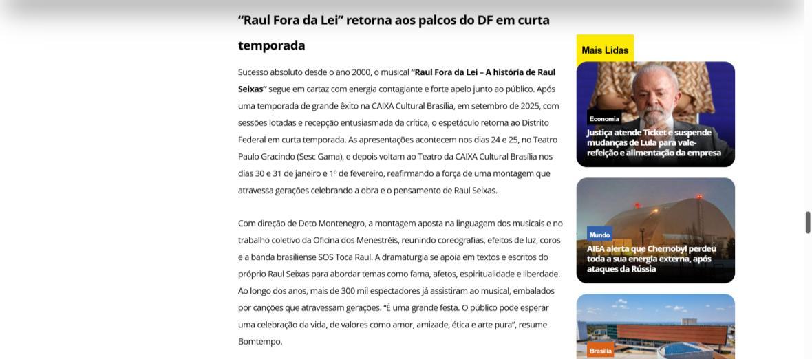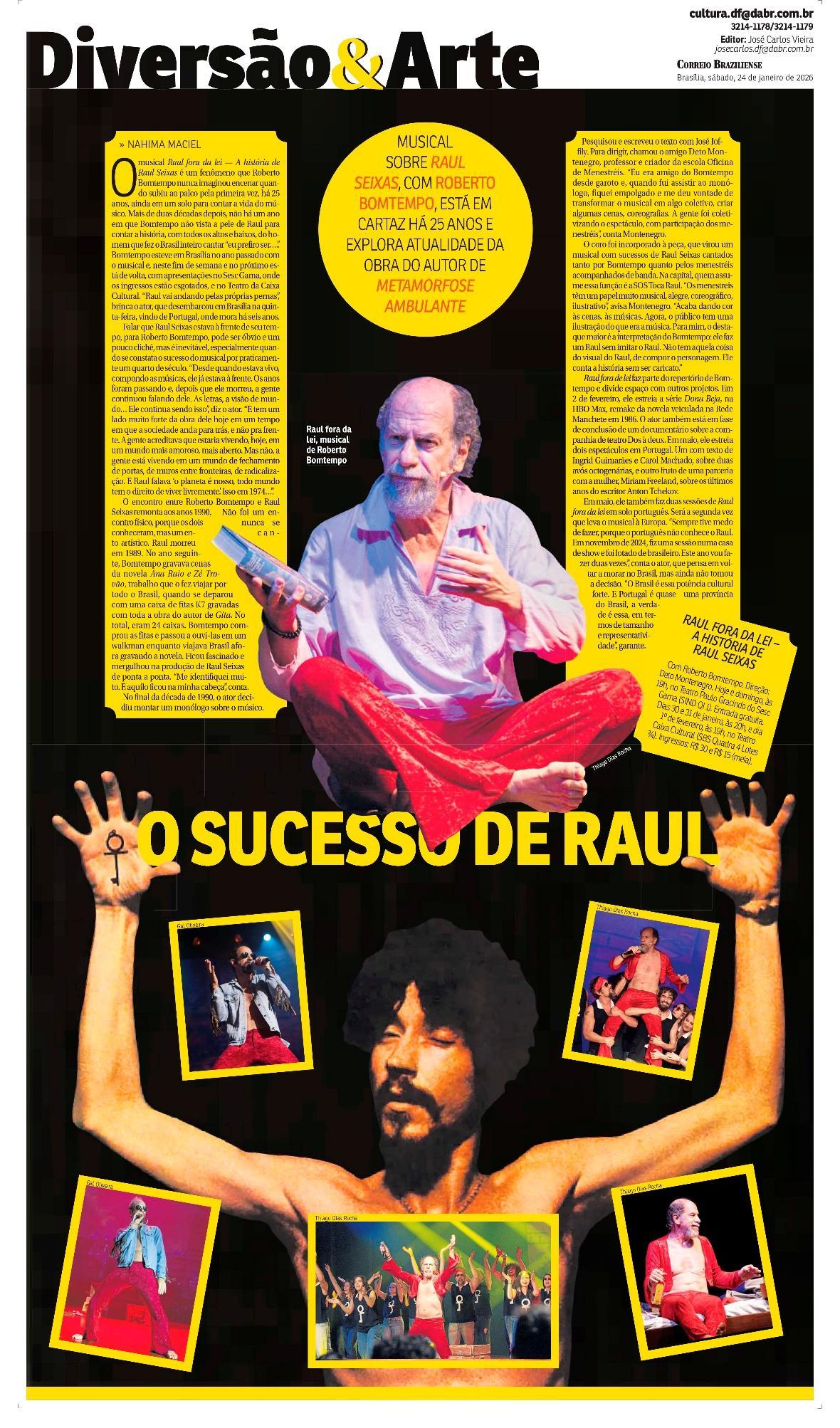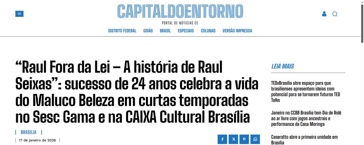 Sucesso absoluto desde 2000, o musical "Raul Fora da Lei – A história de Raul Seixas" segue em cartaz com energia contagiante. Após uma temporada de grande êxito na CAIXA Cultural Brasília em setembro de 2025, com sessões lotadas e crítica entusiástica, o espetáculo agora faz curtas temporadas no Teatro Paulo Gracindo (Sesc Gama), dias 24 e 25 de janeiro, e retorna ao Teatro da CAIXA Cultural Brasília, dias 30 e 31 de janeiro e 1º de fevereiro.