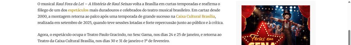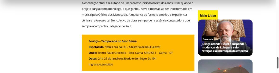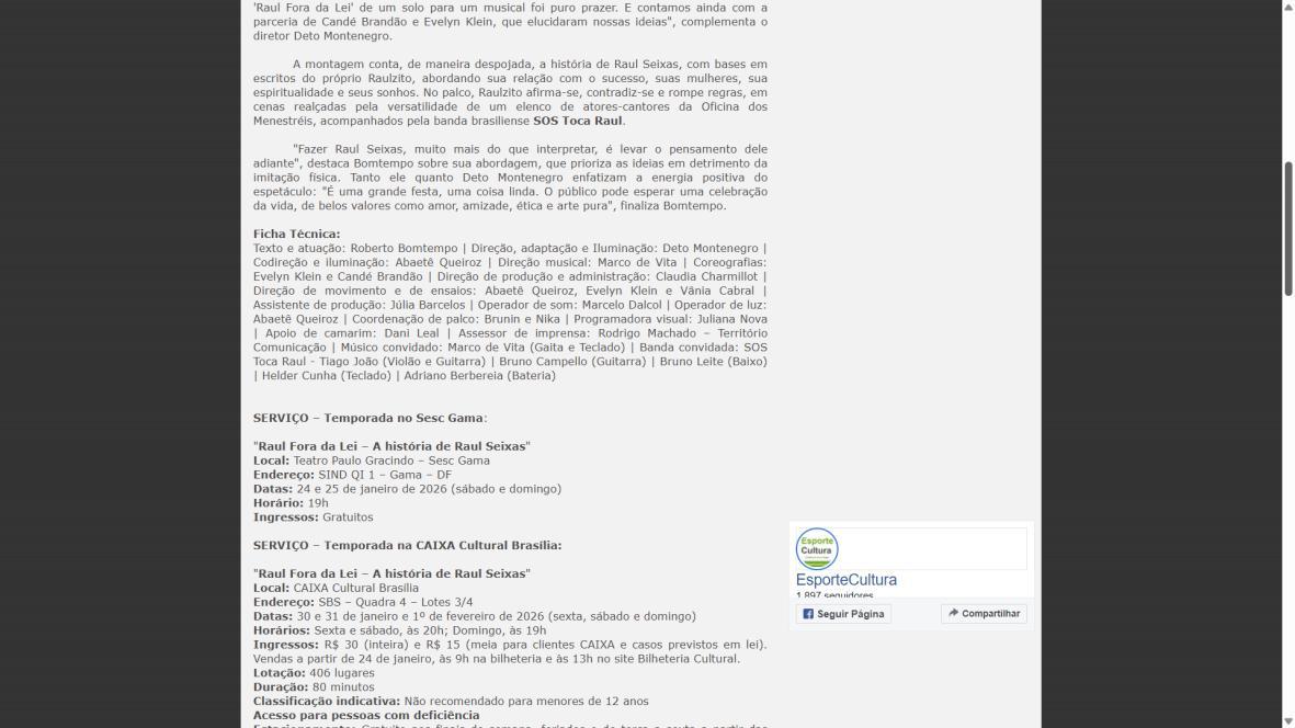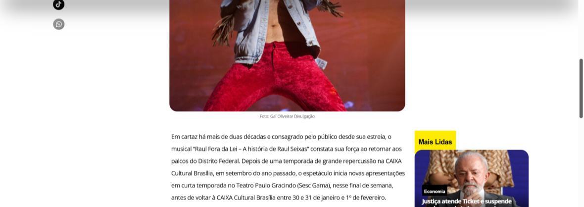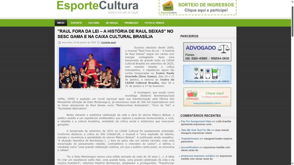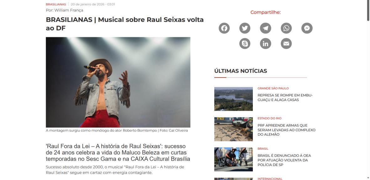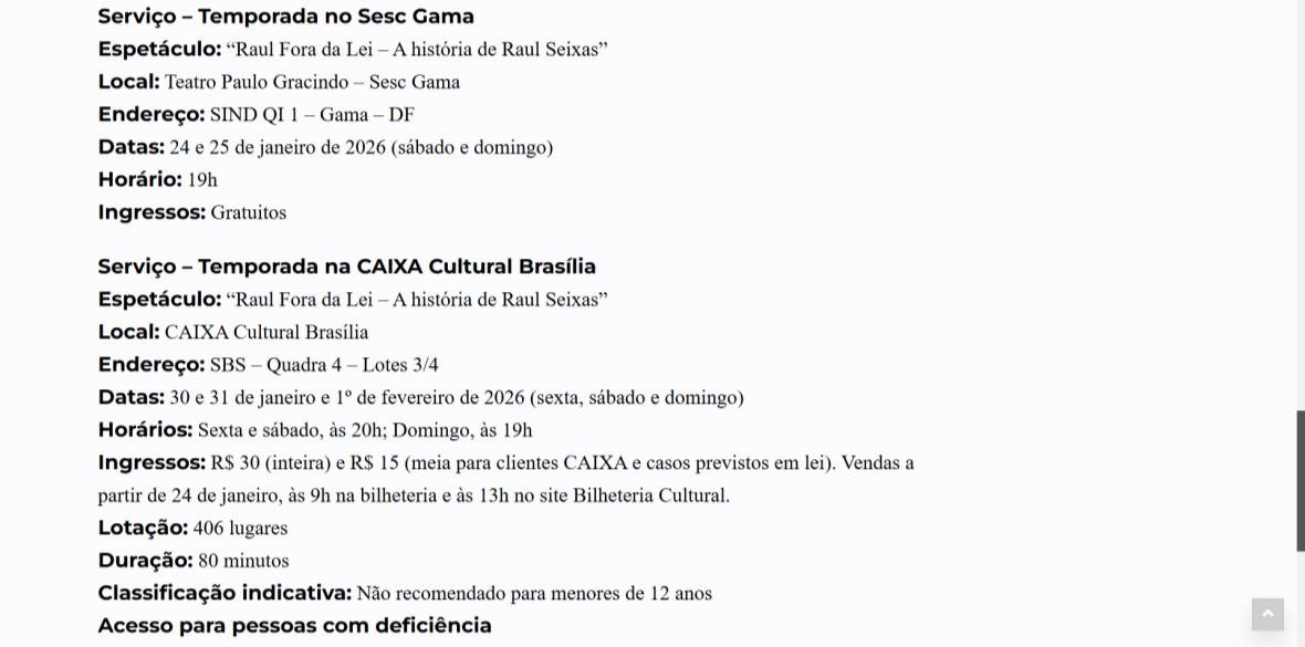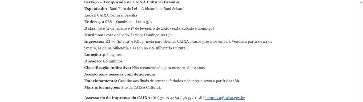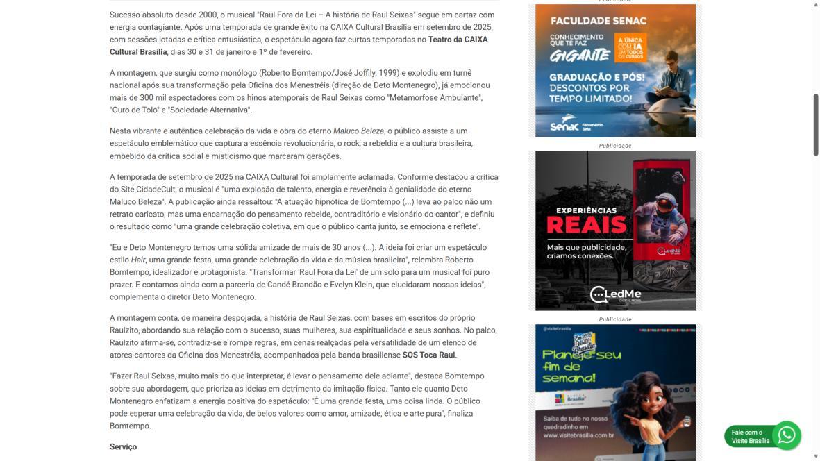Sucesso absoluto desde 2000, o musical "Raul Fora da Lei – A história de Raul Seixas" segue em cartaz com energia contagiante. Após uma temporada de grande êxito na CAIXA Cultural Brasília em setembro de 2025, com sessões lotadas e crítica entusiástica, o espetáculo agora faz curtas temporadas no Teatro Paulo Gracindo (Sesc Gama), dias 24 e 25 de janeiro, e retorna ao Teatro da CAIXA Cultural Brasília, dias 30 e 31 de janeiro e 1º de fevereiro.