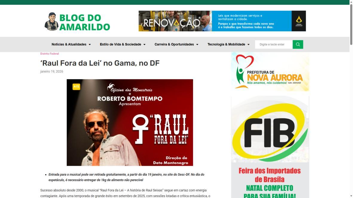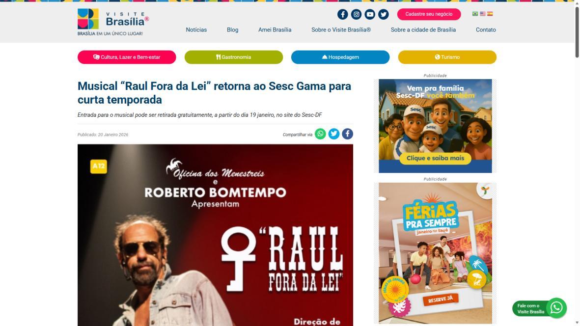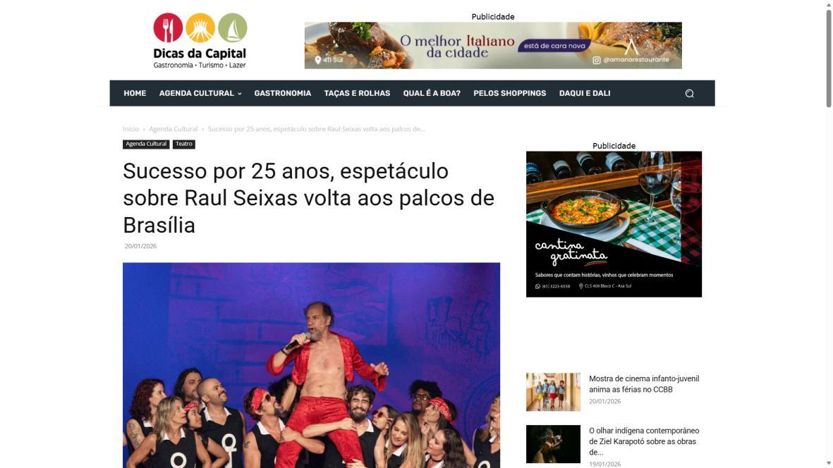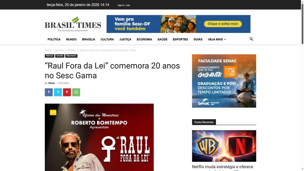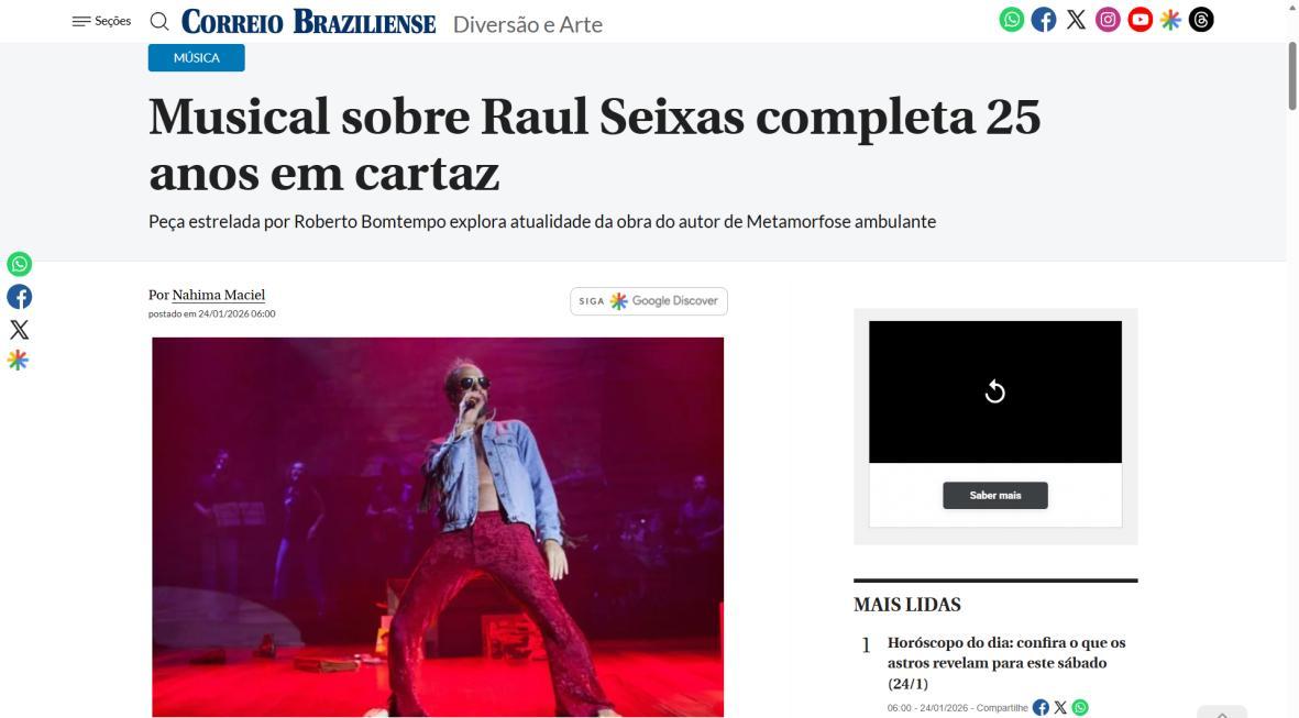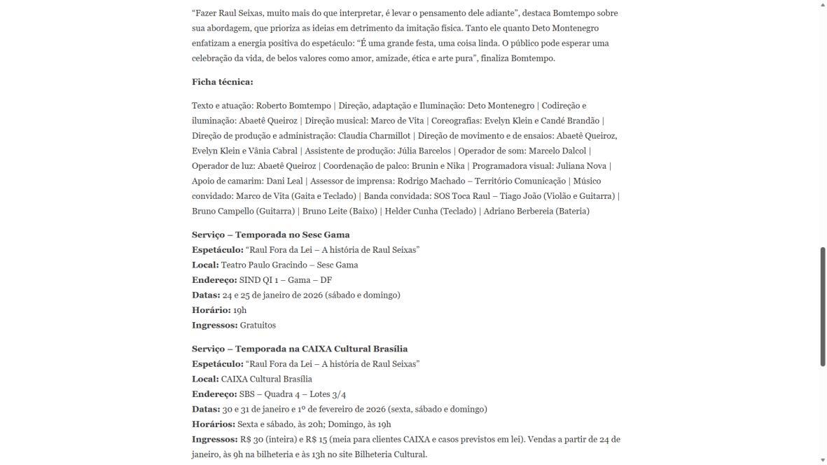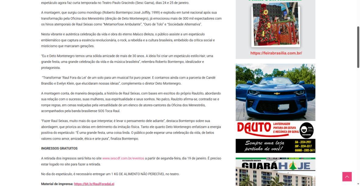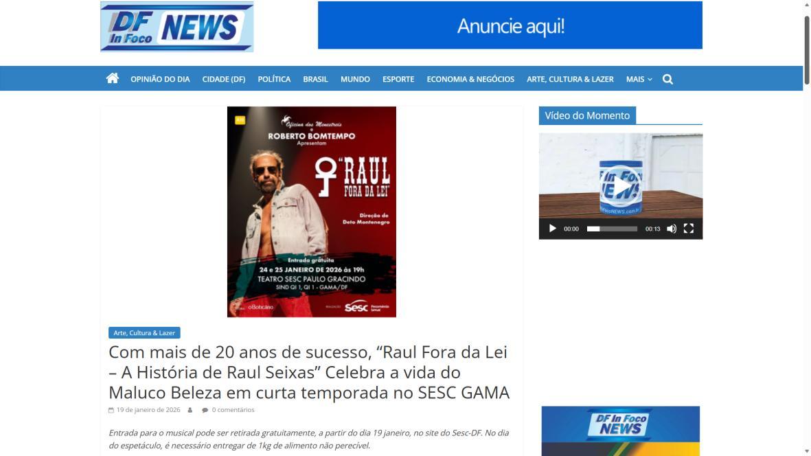 Sucesso absoluto desde 2000, o musical "Raul Fora da Lei – A história de Raul Seixas" segue em cartaz com energia contagiante. Após uma temporada de grande êxito na CAIXA Cultural Brasília em setembro de 2025, com sessões lotadas e crítica entusiástica, o espetáculo agora faz curtas temporadas no Teatro Paulo Gracindo (Sesc Gama), dias 24 e 25 de janeiro, e retorna ao Teatro da CAIXA Cultural Brasília, dias 30 e 31 de janeiro e 1º de fevereiro.
