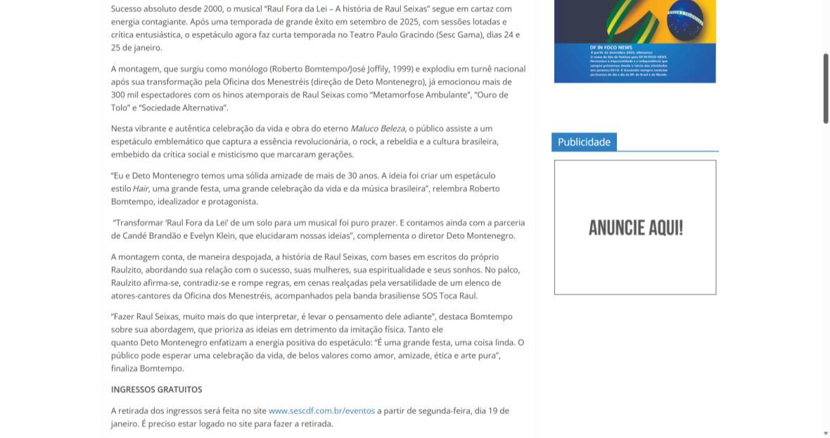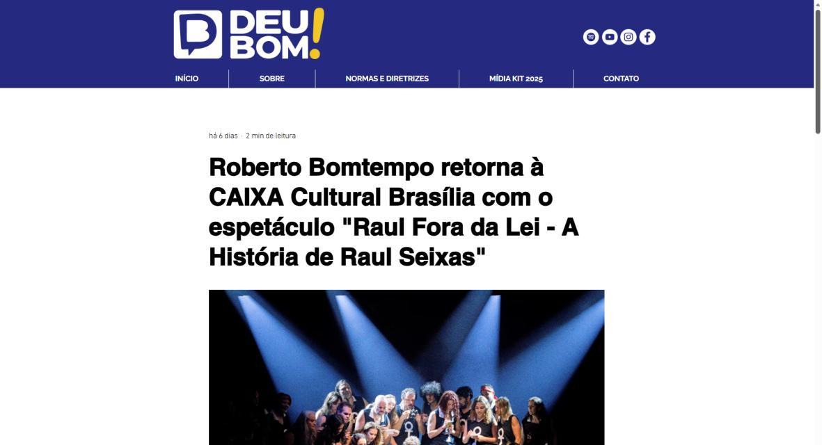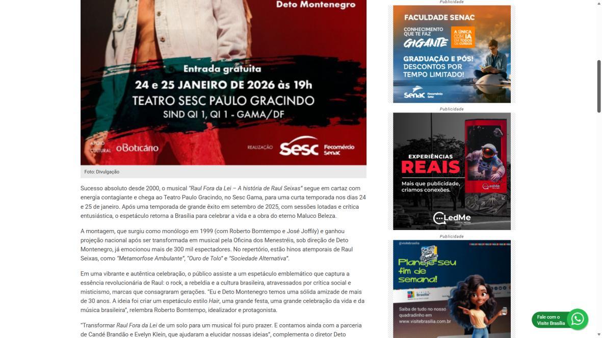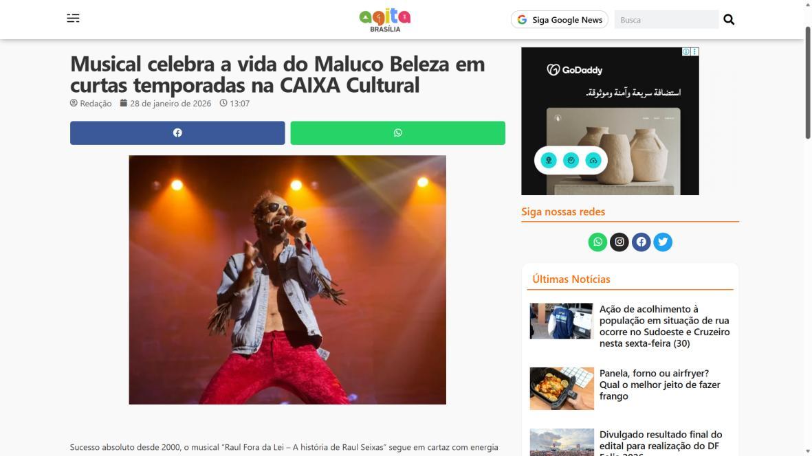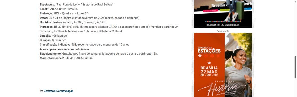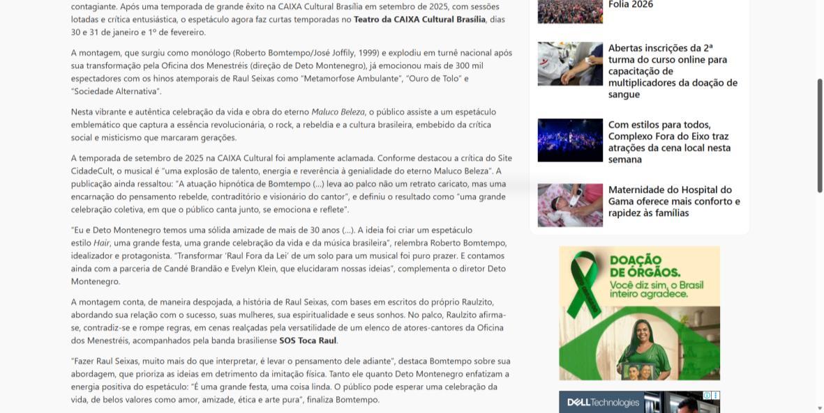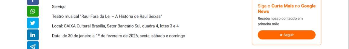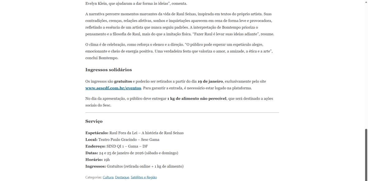 Sucesso absoluto desde 2000, o musical "Raul Fora da Lei – A história de Raul Seixas" segue em cartaz com energia contagiante. Após uma temporada de grande êxito na CAIXA Cultural Brasília em setembro de 2025, com sessões lotadas e crítica entusiástica, o espetáculo agora faz curtas temporadas no Teatro Paulo Gracindo (Sesc Gama), dias 24 e 25 de janeiro, e retorna ao Teatro da CAIXA Cultural Brasília, dias 30 e 31 de janeiro e 1º de fevereiro.