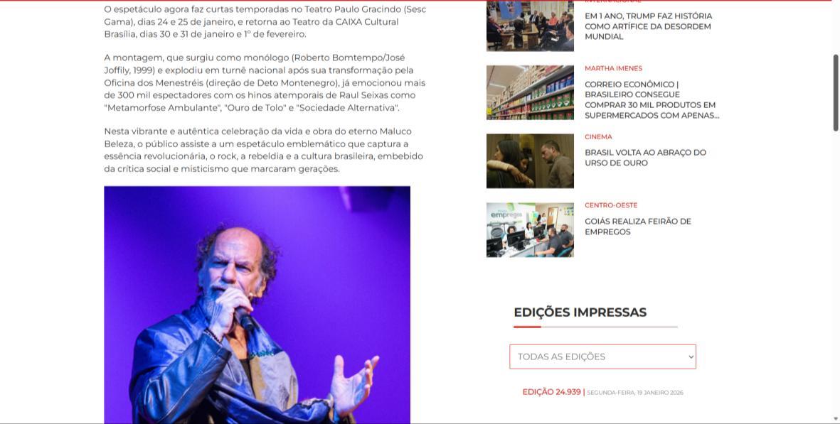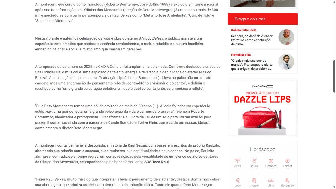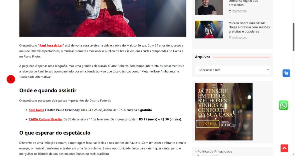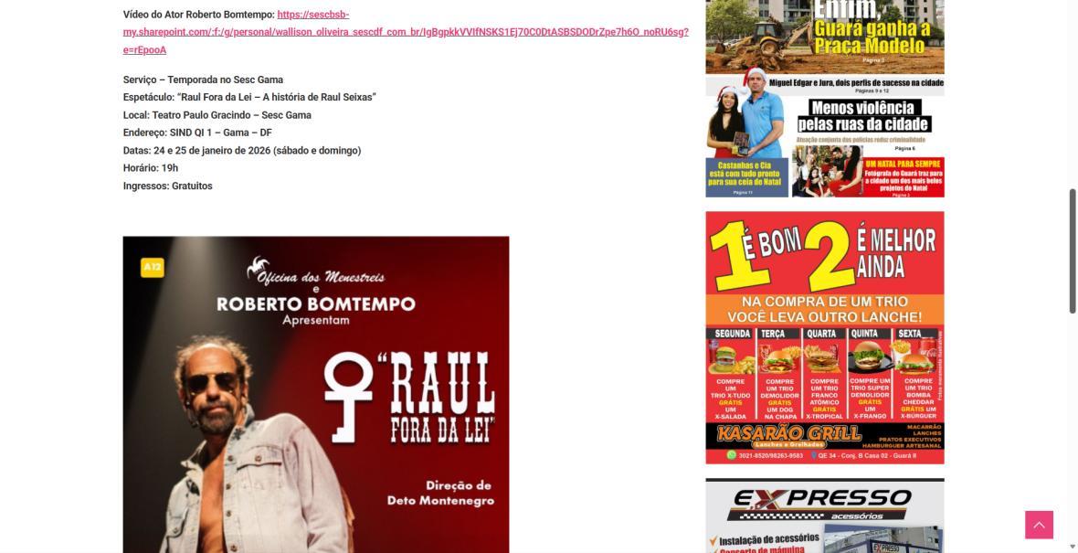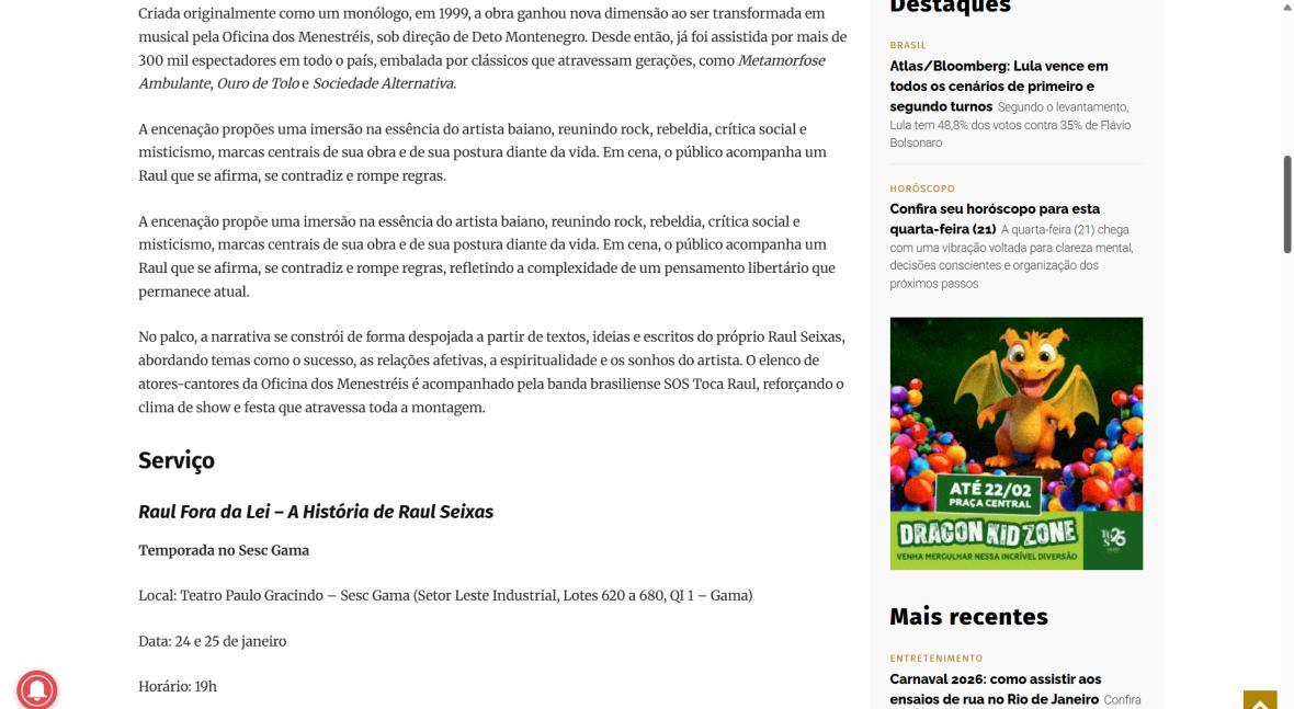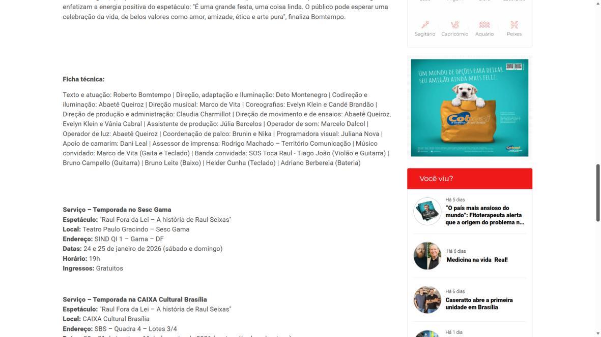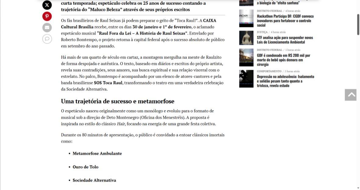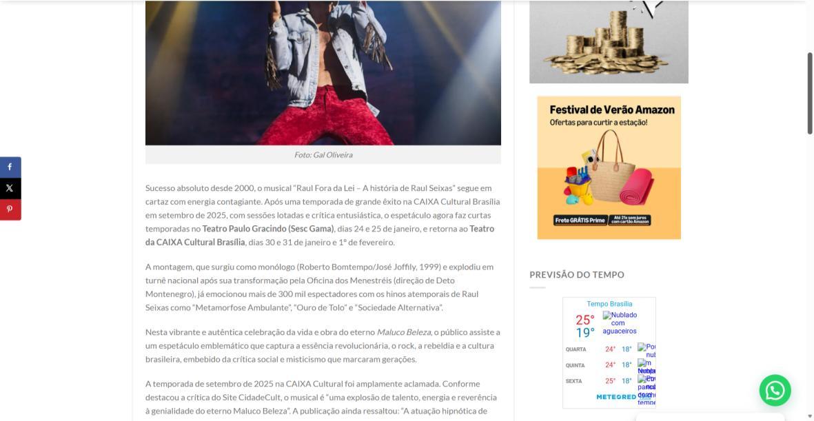 Sucesso absoluto desde 2000, o musical "Raul Fora da Lei – A história de Raul Seixas" segue em cartaz com energia contagiante. Após uma temporada de grande êxito na CAIXA Cultural Brasília em setembro de 2025, com sessões lotadas e crítica entusiástica, o espetáculo agora faz curtas temporadas no Teatro Paulo Gracindo (Sesc Gama), dias 24 e 25 de janeiro, e retorna ao Teatro da CAIXA Cultural Brasília, dias 30 e 31 de janeiro e 1º de fevereiro.