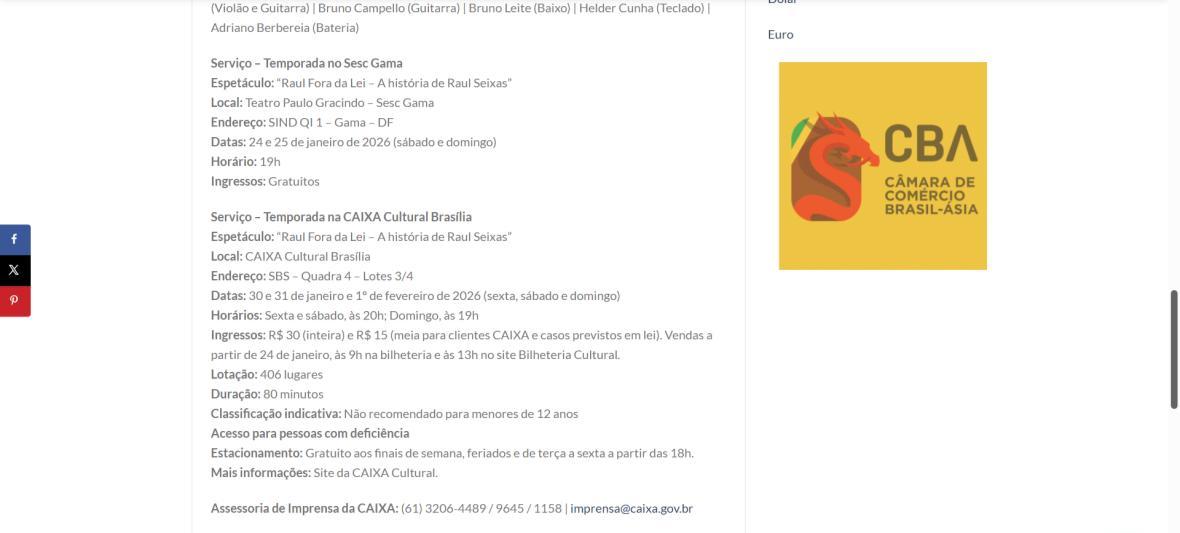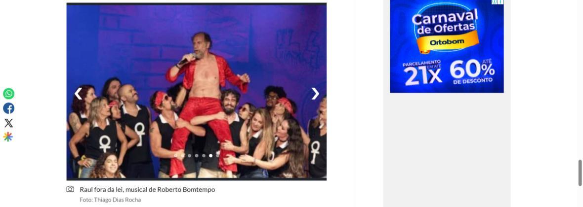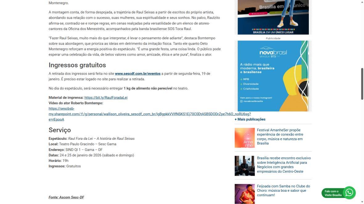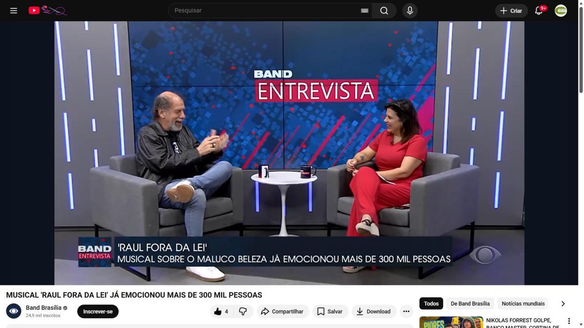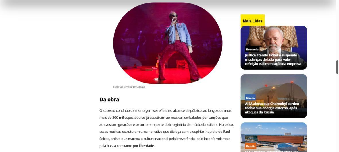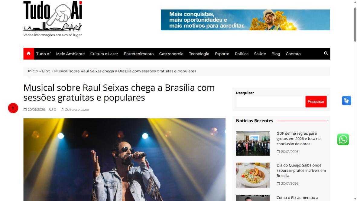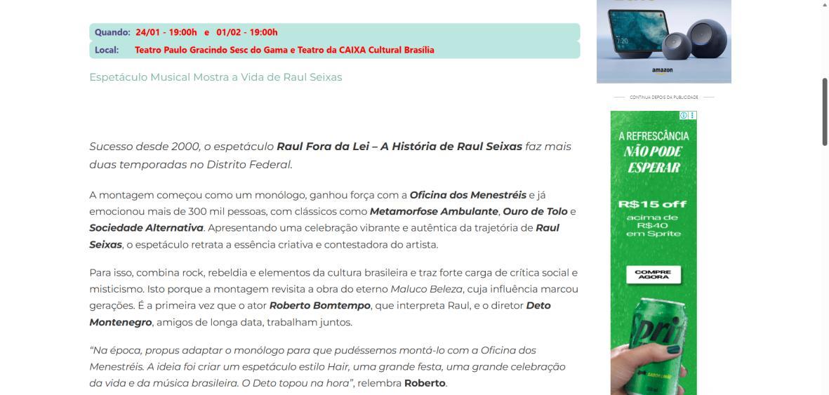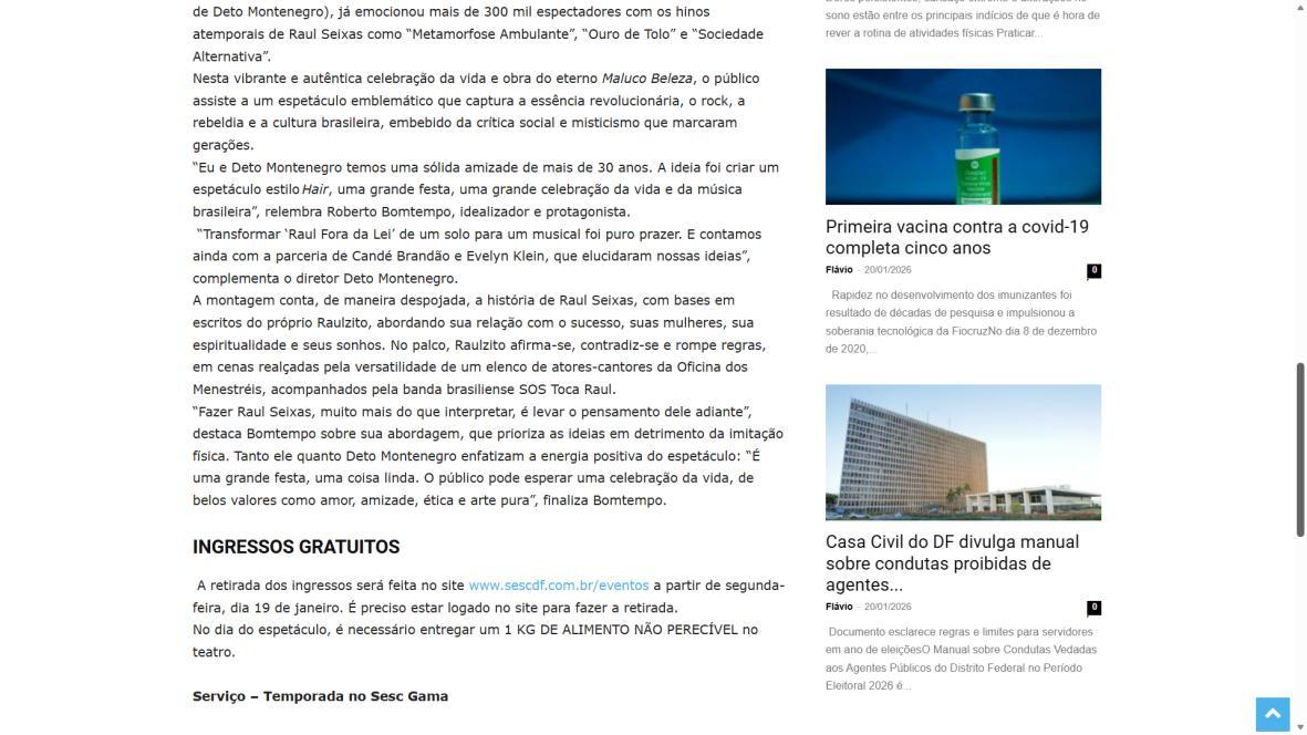 Sucesso absoluto desde 2000, o musical "Raul Fora da Lei – A história de Raul Seixas" segue em cartaz com energia contagiante. Após uma temporada de grande êxito na CAIXA Cultural Brasília em setembro de 2025, com sessões lotadas e crítica entusiástica, o espetáculo agora faz curtas temporadas no Teatro Paulo Gracindo (Sesc Gama), dias 24 e 25 de janeiro, e retorna ao Teatro da CAIXA Cultural Brasília, dias 30 e 31 de janeiro e 1º de fevereiro.