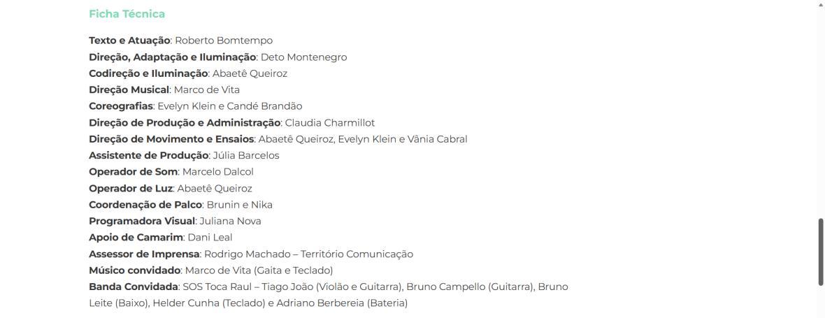 Texto e atuação: Roberto Bomtempo | Direção, adaptação e Iluminação: Deto Montenegro | Codireção e iluminação: Abaetê Queiroz | Direção musical: Marco de Vita | Coreografias: Evelyn Klein e Candé Brandão | Direção de produção e administração: Claudia Charmillot | Direção de movimento e de ensaios: Abaetê Queiroz, Evelyn Klein e Vânia Cabral | Assistente de produção: Júlia Barcelos | Operador de som: Marcelo Dalcol | Operador de luz: Abaetê Queiroz | Coordenação de palco: Brunin e Nika |