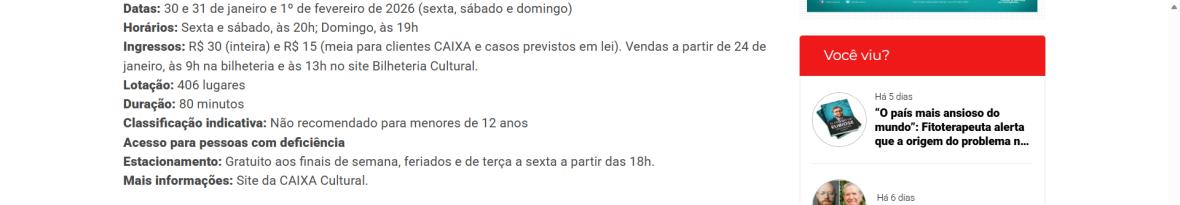 Ingressos: R$ 30 (inteira) e R$ 15 (meia para clientes CAIXA e casos previstos em lei). Vendas a partir de 24 de janeiro, às 9h na bilheteria e às 13h no site Bilheteria