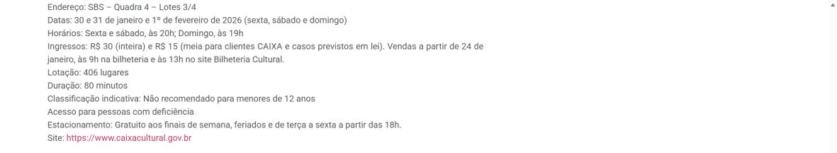 Horários: Sexta e sábado, às 20h; Domingo, às 19h