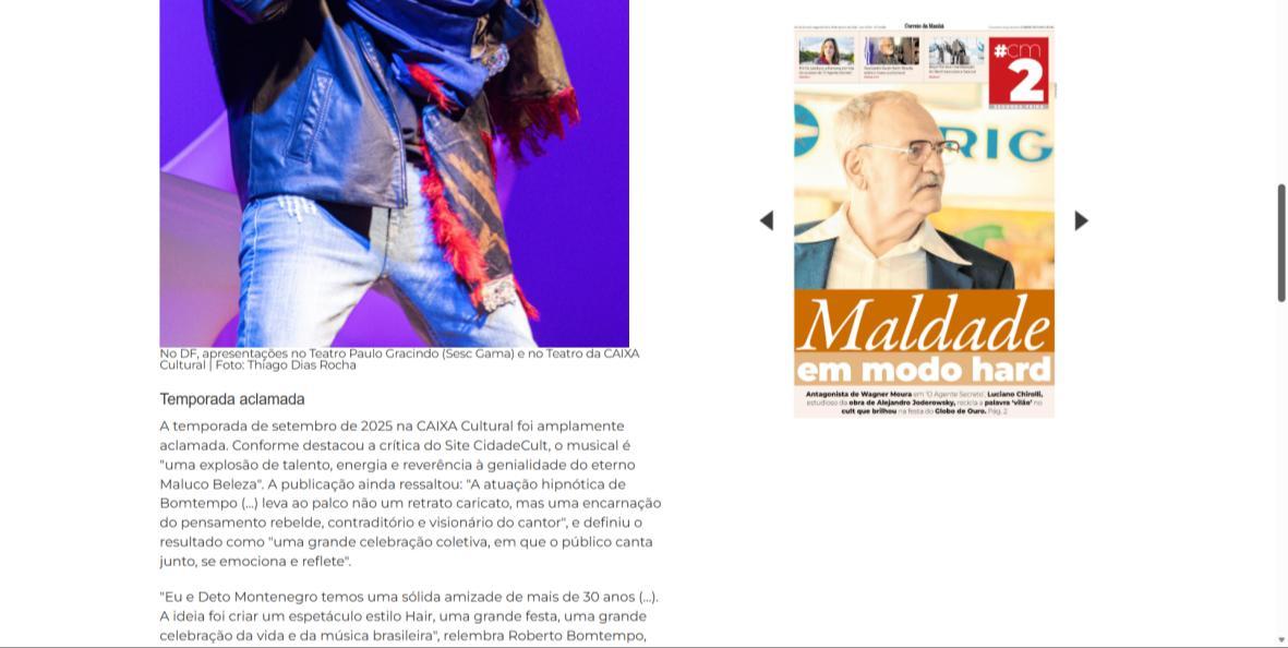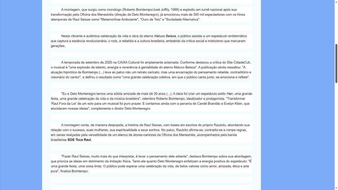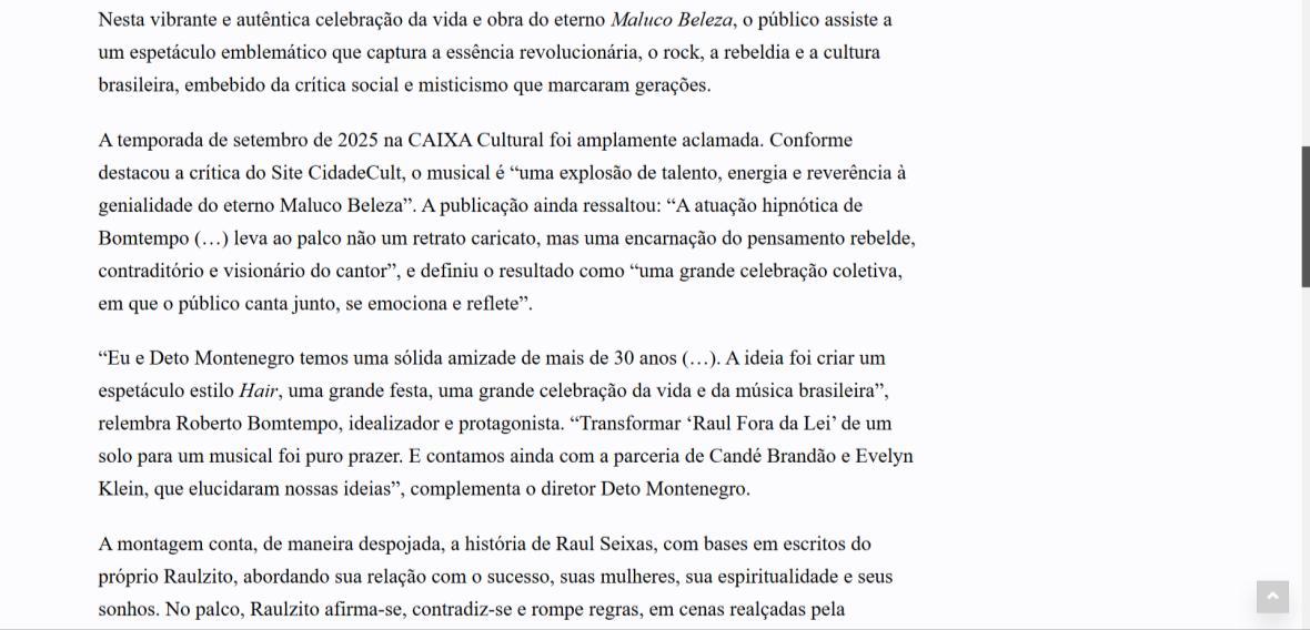 A temporada de setembro de 2025 na CAIXA Cultural foi amplamente aclamada. Conforme destacou a crítica do Site CidadeCult, o musical é "uma explosão de talento, energia e reverência à genialidade do eterno Maluco Beleza". A publicação ainda ressaltou: "A atuação hipnótica de Bomtempo (...) leva ao palco não um retrato caricato, mas uma encarnação do pensamento rebelde, contraditório e visionário do cantor", e definiu o resultado como "uma grande celebração coletiva, em que o público canta junto, se emociona e reflete".