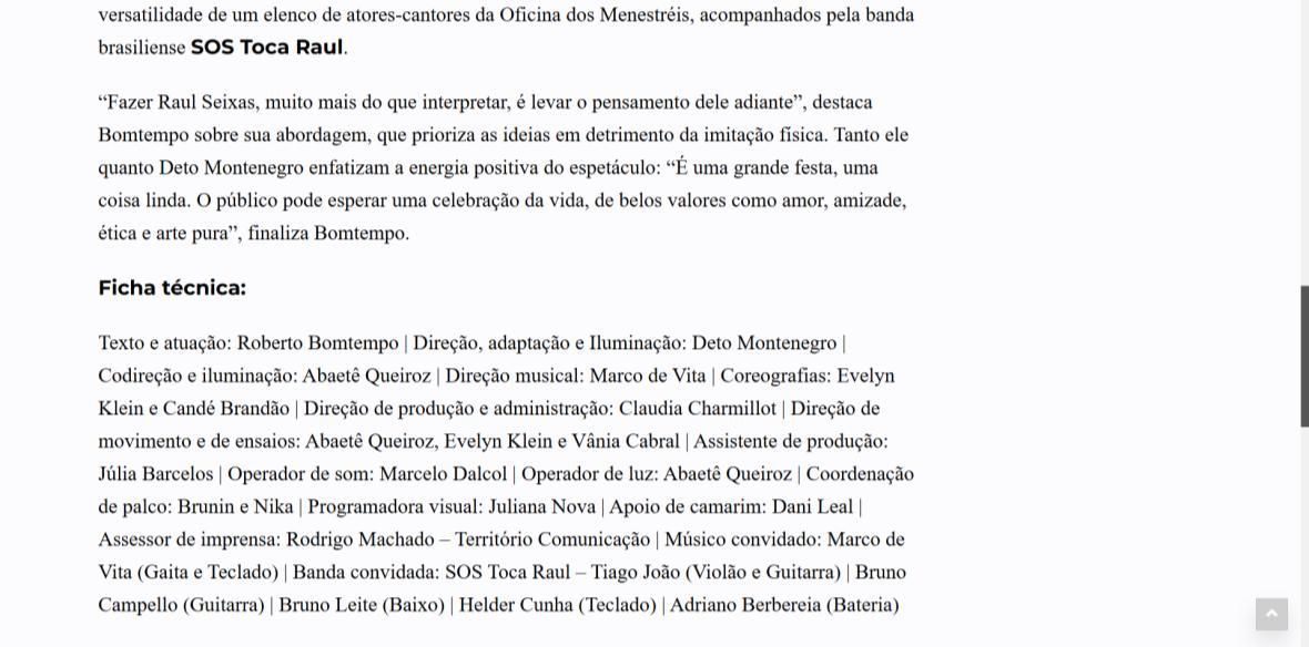 "Fazer Raul Seixas, muito mais do que interpretar, é levar o pensamento dele adiante", destaca Bomtempo sobre sua abordagem, que prioriza as ideias em detrimento da imitação física. Tanto ele quanto Deto Montenegro enfatizam a energia positiva do espetáculo: "É uma grande festa, uma coisa linda. O público pode esperar uma celebração da vida, de belos valores como amor, amizade, ética e arte pura", finaliza Bomtempo.