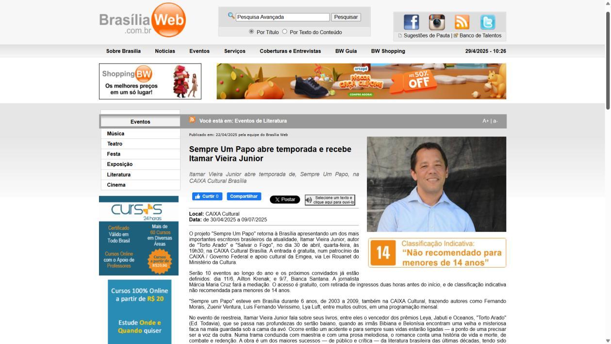 O projeto “Sempre Um Papo” retorna à Brasília apresentando um dos mais importantes escritores brasileiros da atualidade, Itamar Vieira Junior, autor de “Torto Arado” e “Salvar o Fogo”, no dia 30 de abril, quarta-feira, às 19h30, na CAIXA Cultural Brasília. A entrada é gratuita, num patrocínio da CAIXA / Governo Federal e apoio cultural da Emgea, via Lei Rouanet do Ministério da Cultura.