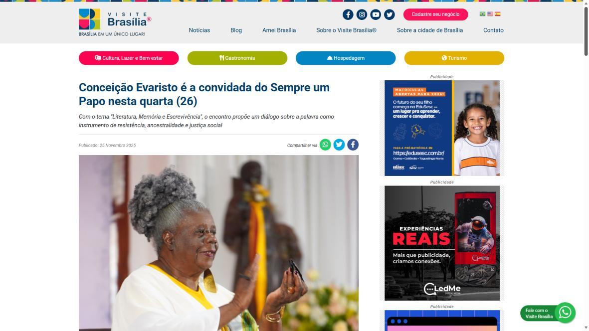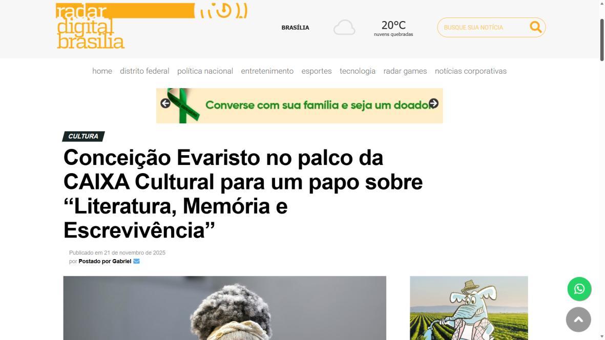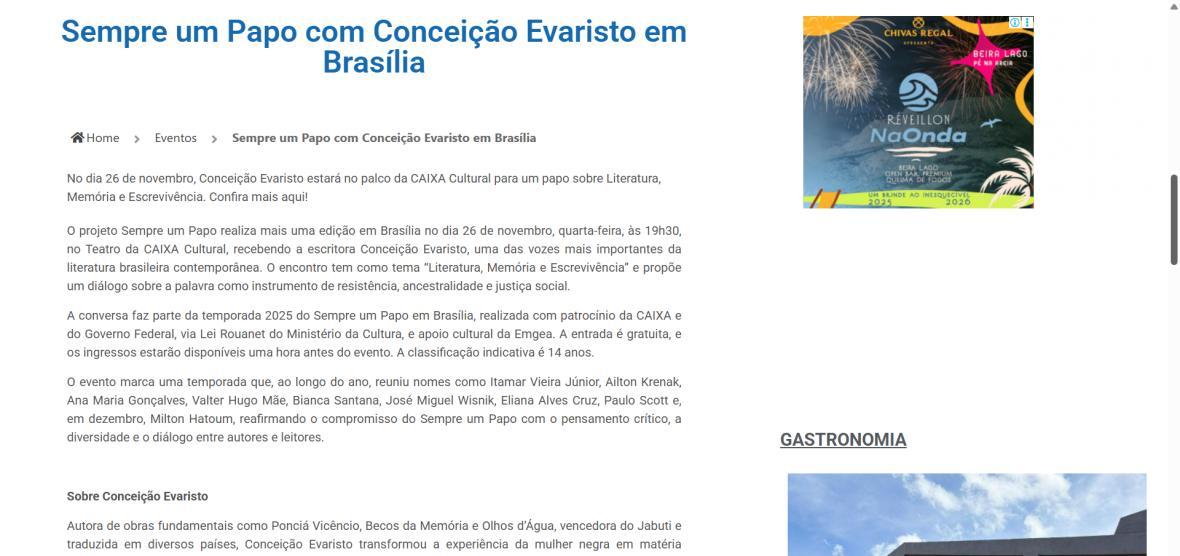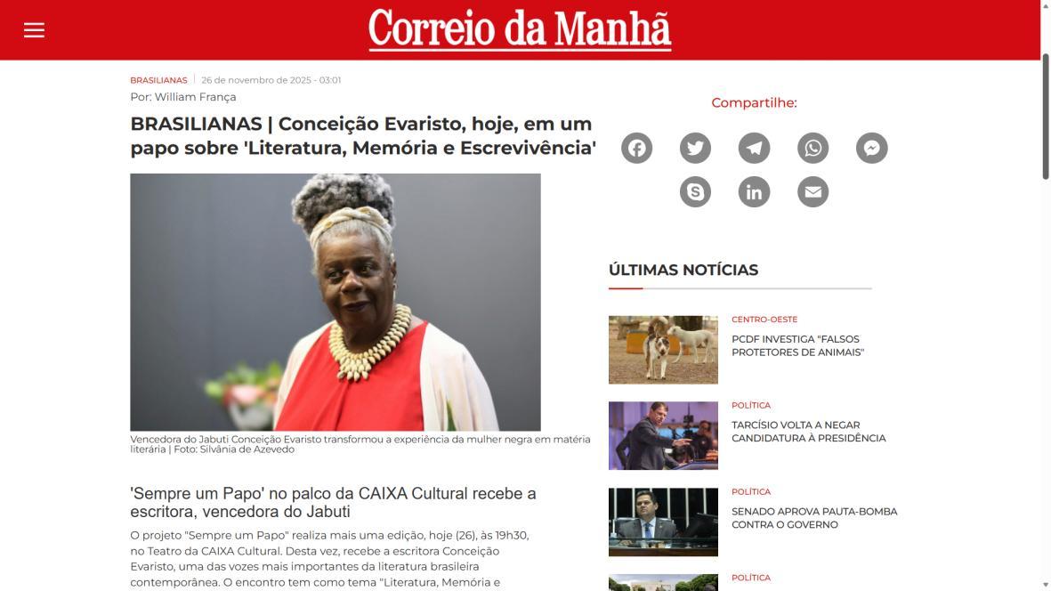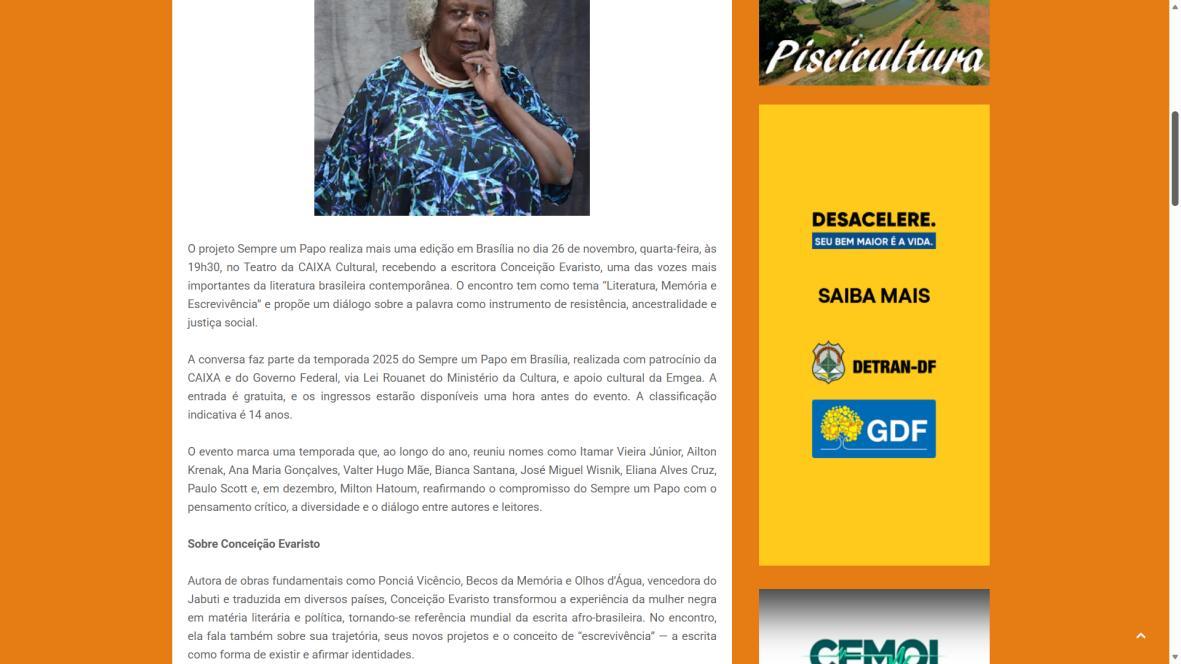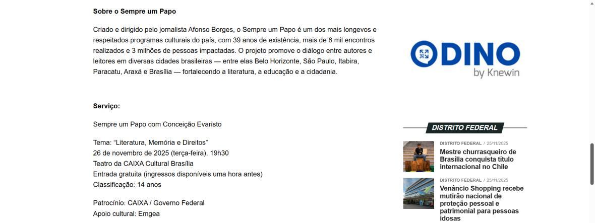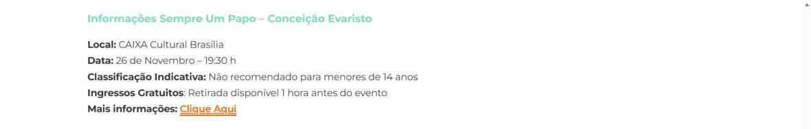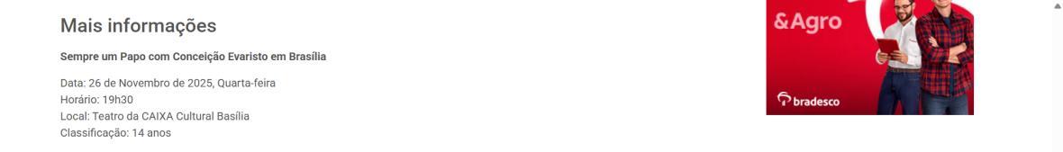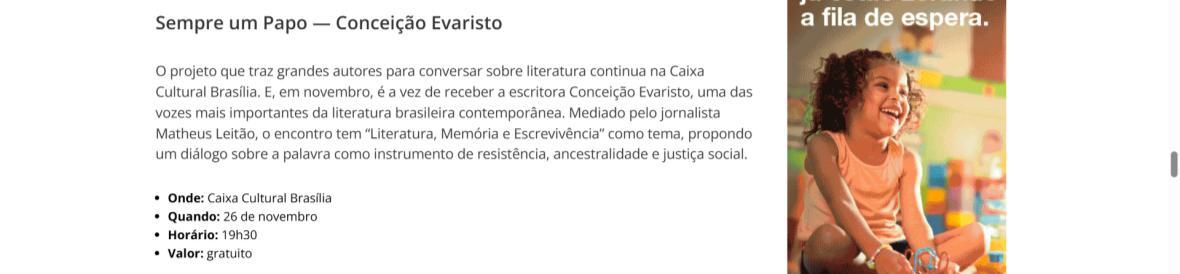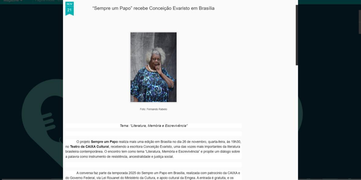O projeto Sempre um Papo realiza mais uma edição em Brasília no dia 26 de novembro, quarta-feira, às 19h30, no Teatro da CAIXA Cultural, recebendo a escritora Conceição Evaristo, uma das vozes mais importantes da literatura brasileira contemporânea. O encontro tem como tema “Literatura, Memória e Escrevivência” e propõe um diálogo sobre a palavra como instrumento de resistência, ancestralidade e justiça social.