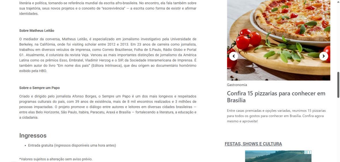 A conversa faz parte da temporada 2025 do Sempre um Papo em Brasília, realizada com patrocínio da CAIXA e do Governo Federal, via Lei Rouanet do Ministério da Cultura, e apoio cultural da Emgea. A entrada é gratuita, e os ingressos estarão disponíveis uma hora antes do evento. A classificação indicativa é 14 anos.