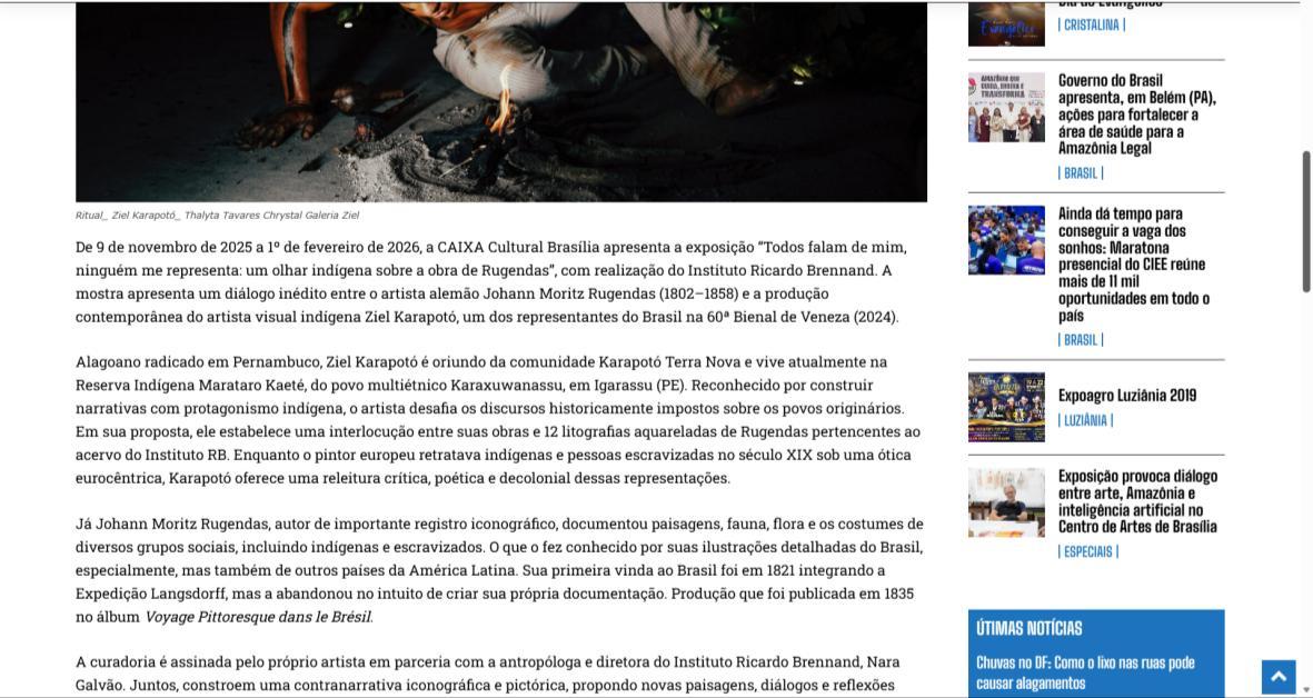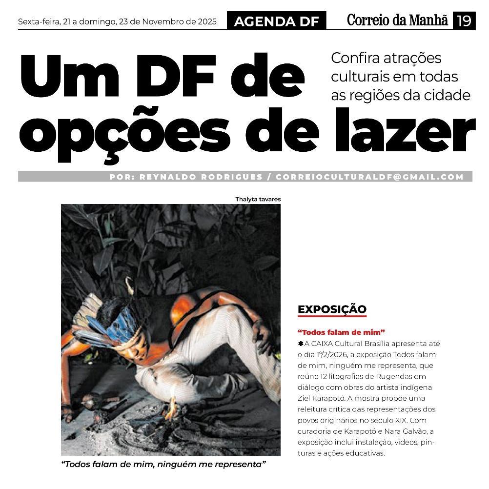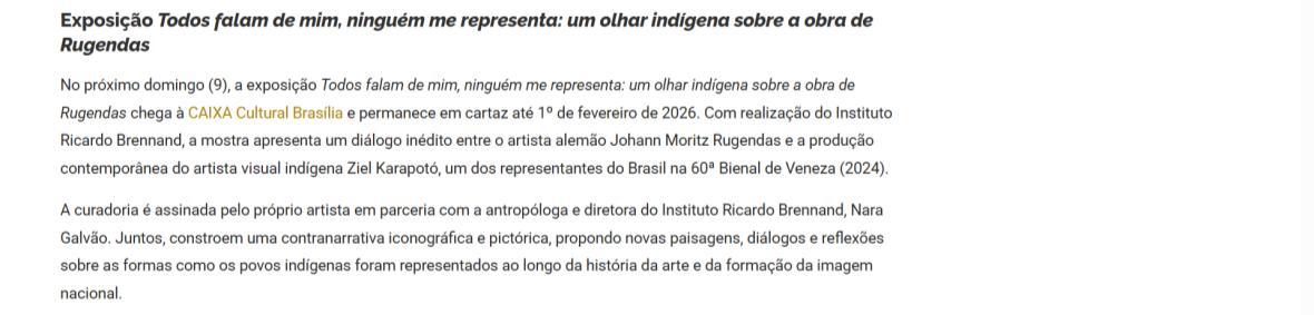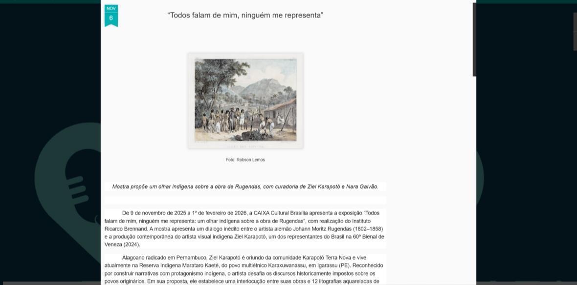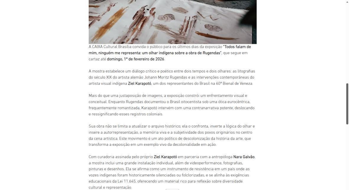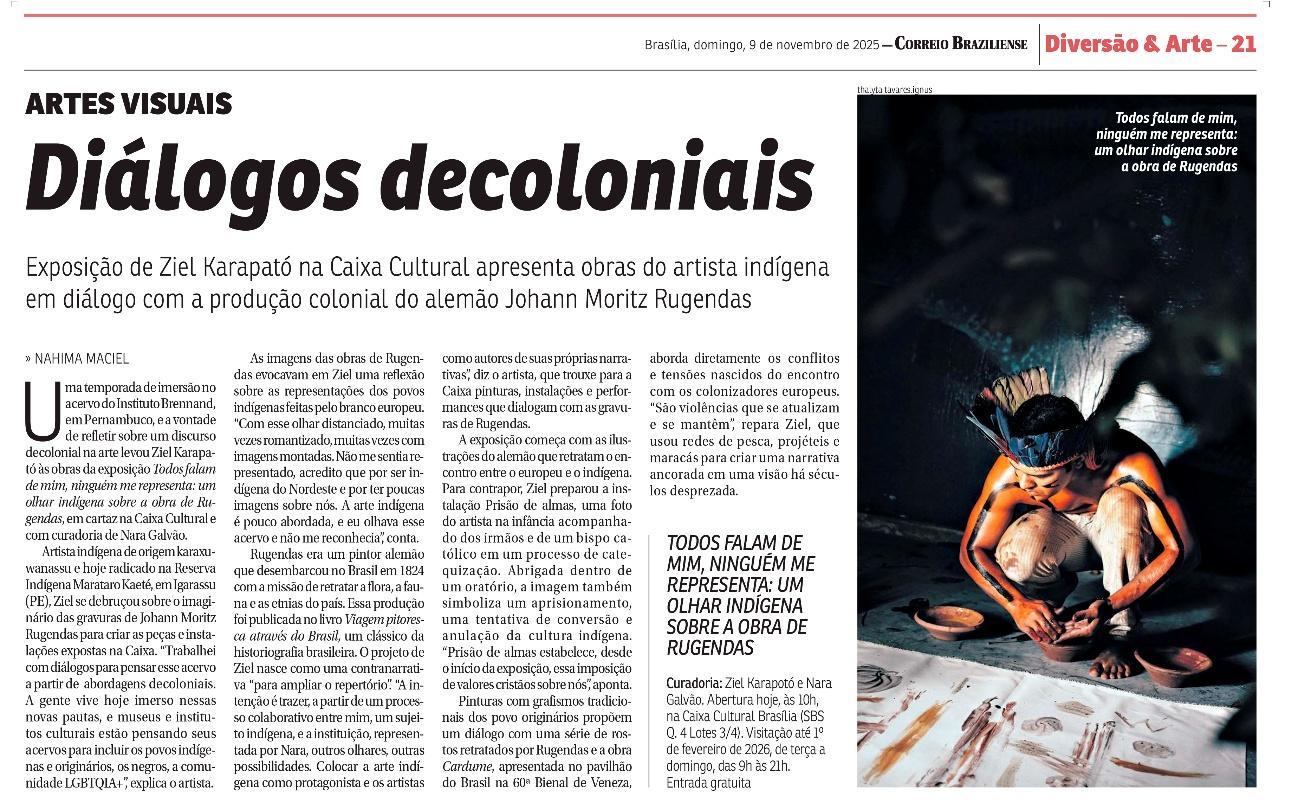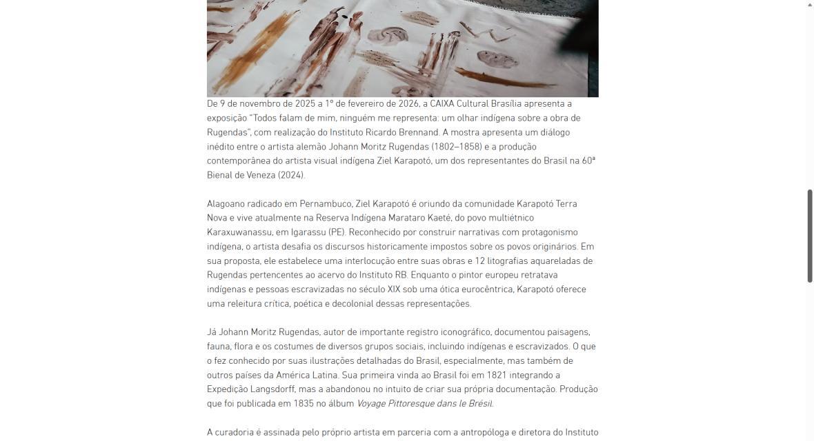 De 9 de novembro de 2025 a 1º de fevereiro de 2026, a CAIXA Cultural Brasília apresenta a exposição “Todos falam de mim, ninguém me representa: um olhar indígena sobre a obra de Rugendas”, com realização do Instituto Ricardo Brennand. A mostra apresenta um diálogo inédito entre o artista alemão Johann Moritz Rugendas (1802–1858) e a produção contemporânea do artista visual indígena Ziel Karapotó, um dos representantes do Brasil na 60ª Bienal de Veneza (2024).