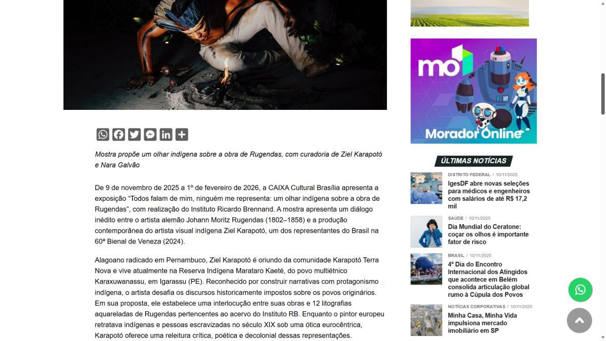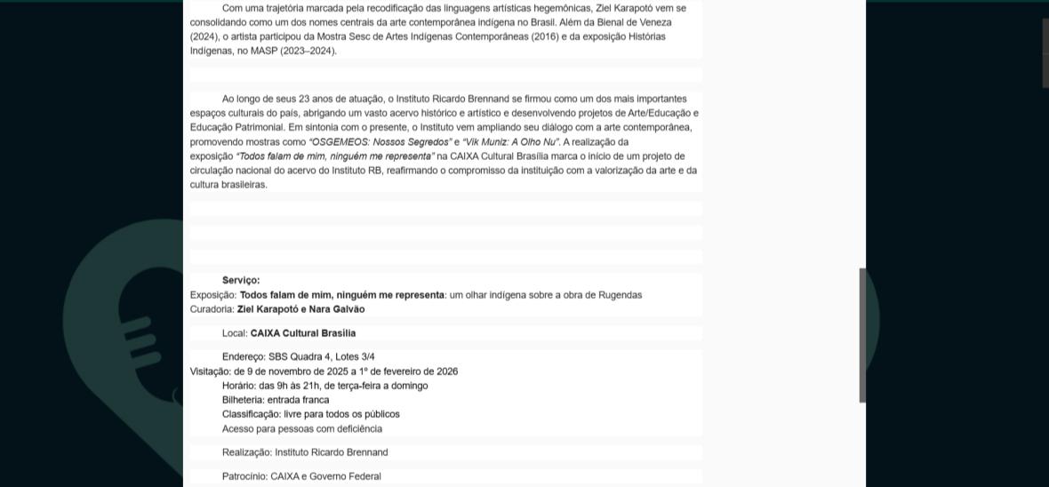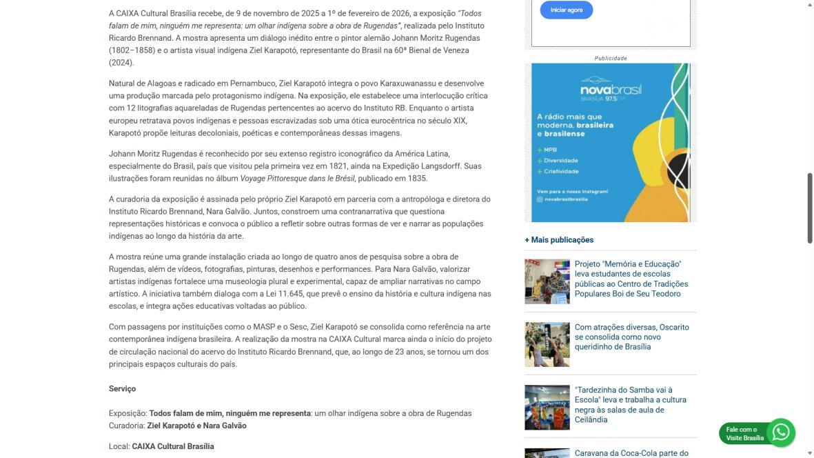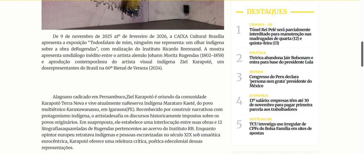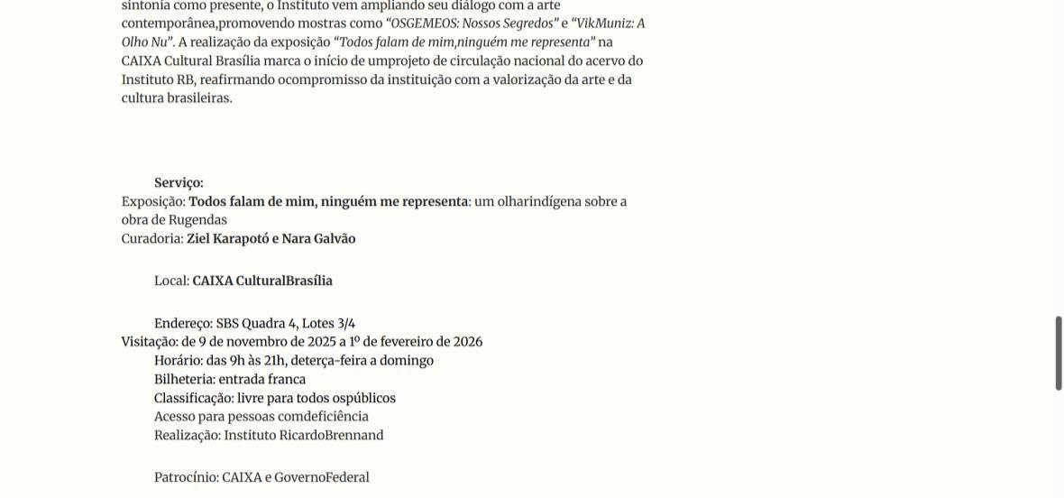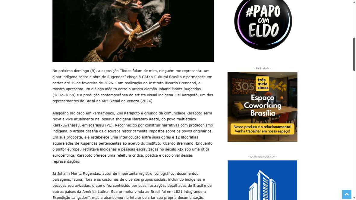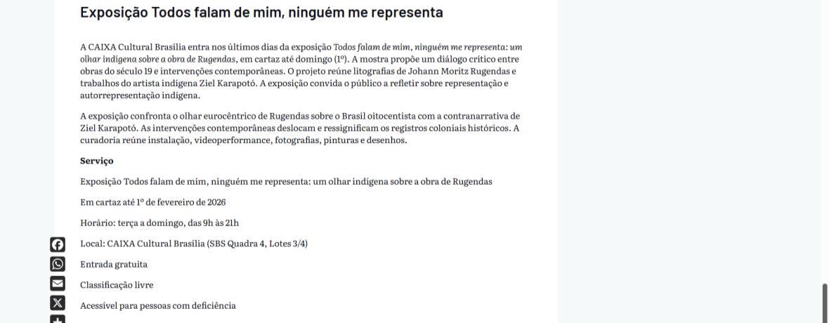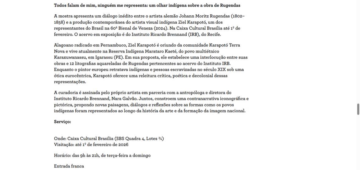 De 9 de novembro de 2025 a 1º de fevereiro de 2026, a CAIXA Cultural Brasília apresenta a exposição “Todos falam de mim, ninguém me representa: um olhar indígena sobre a obra de Rugendas”, com realização do Instituto Ricardo Brennand. A mostra apresenta um diálogo inédito entre o artista alemão Johann Moritz Rugendas (1802–1858) e a produção contemporânea do artista visual indígena Ziel Karapotó, um dos representantes do Brasil na 60ª Bienal de Veneza (2024).