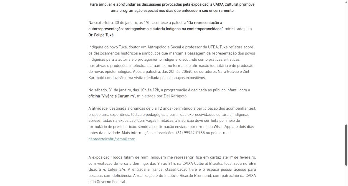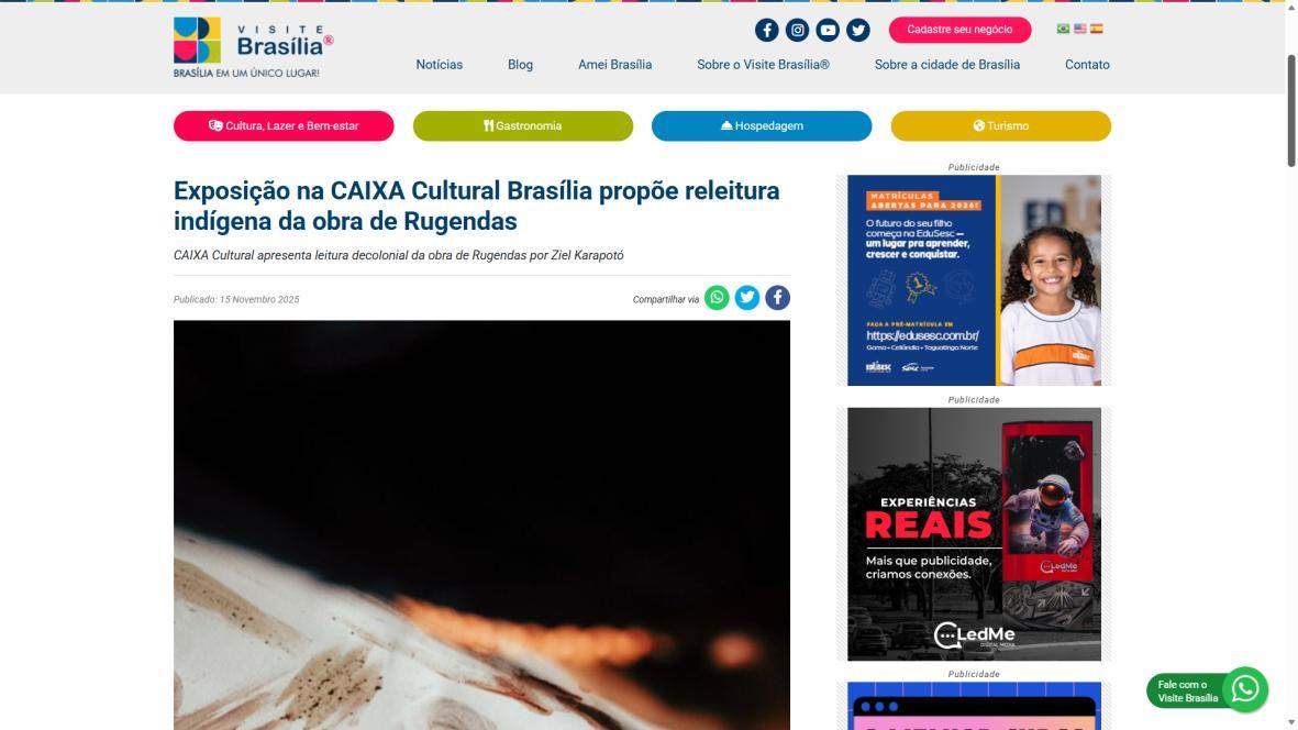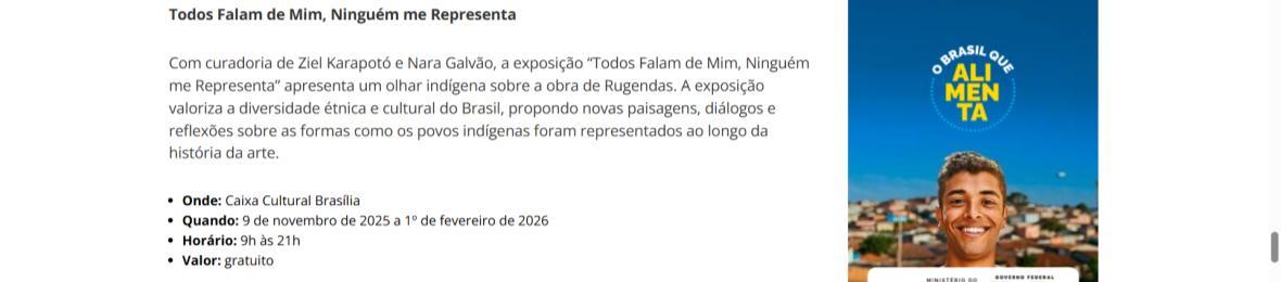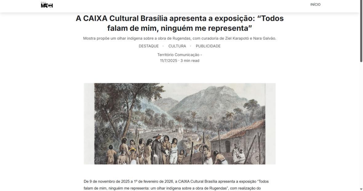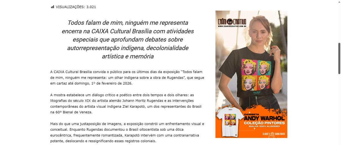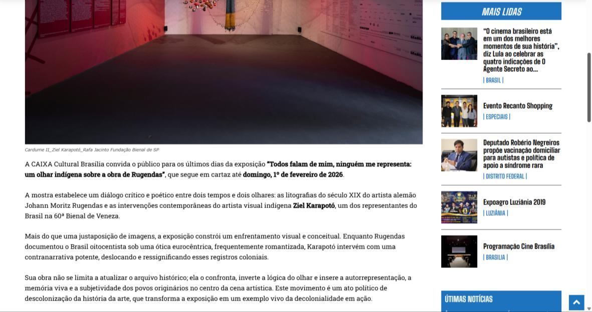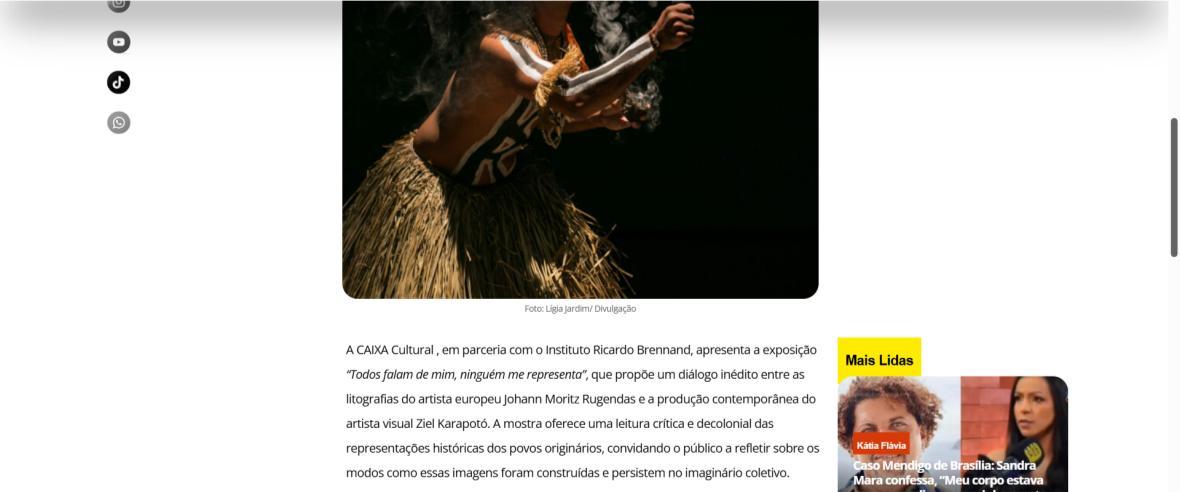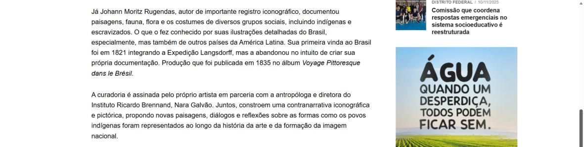 De 9 de novembro de 2025 a 1º de fevereiro de 2026, a CAIXA Cultural Brasília apresenta a exposição “Todos falam de mim, ninguém me representa: um olhar indígena sobre a obra de Rugendas”, com realização do Instituto Ricardo Brennand. A mostra apresenta um diálogo inédito entre o artista alemão Johann Moritz Rugendas (1802–1858) e a produção contemporânea do artista visual indígena Ziel Karapotó, um dos representantes do Brasil na 60ª Bienal de Veneza (2024).