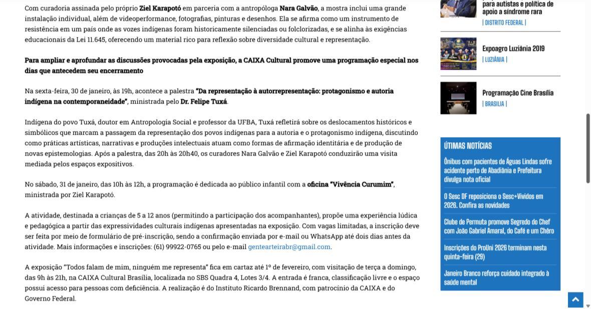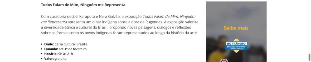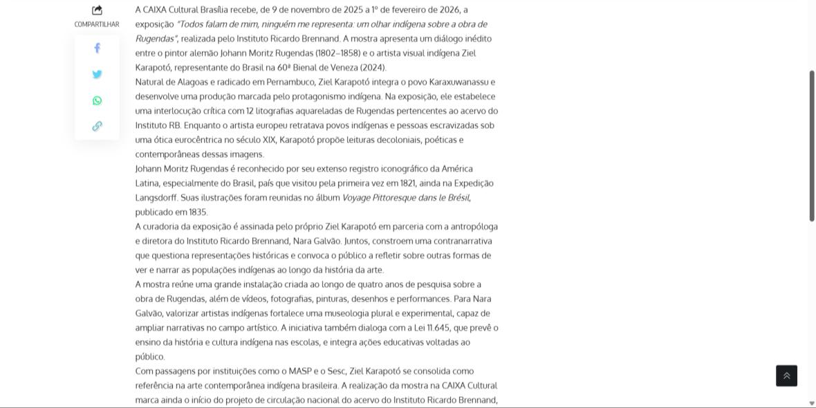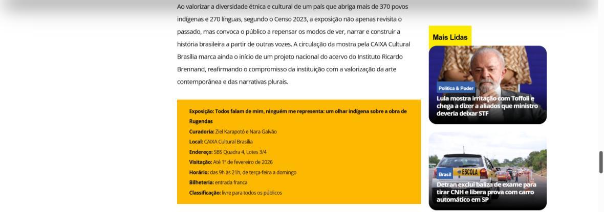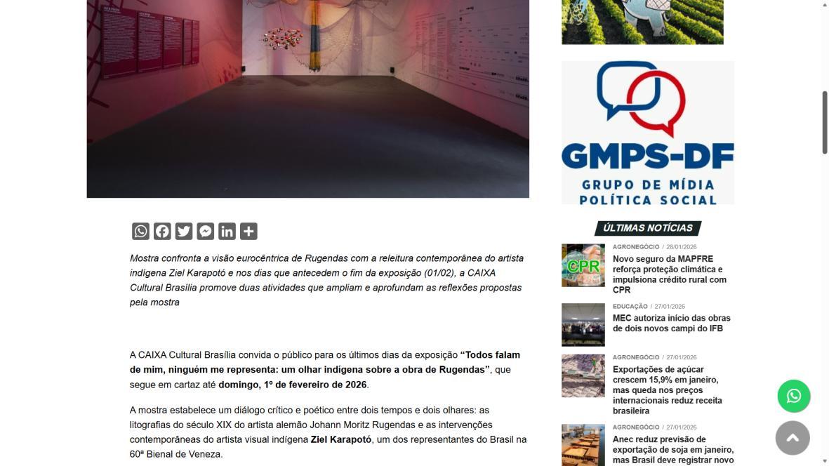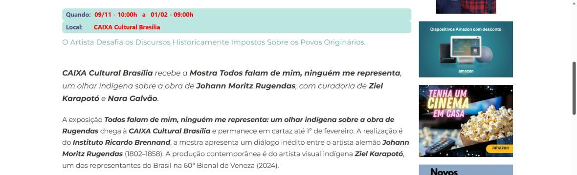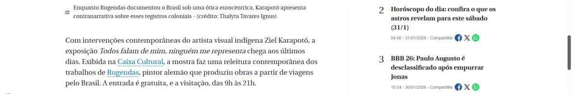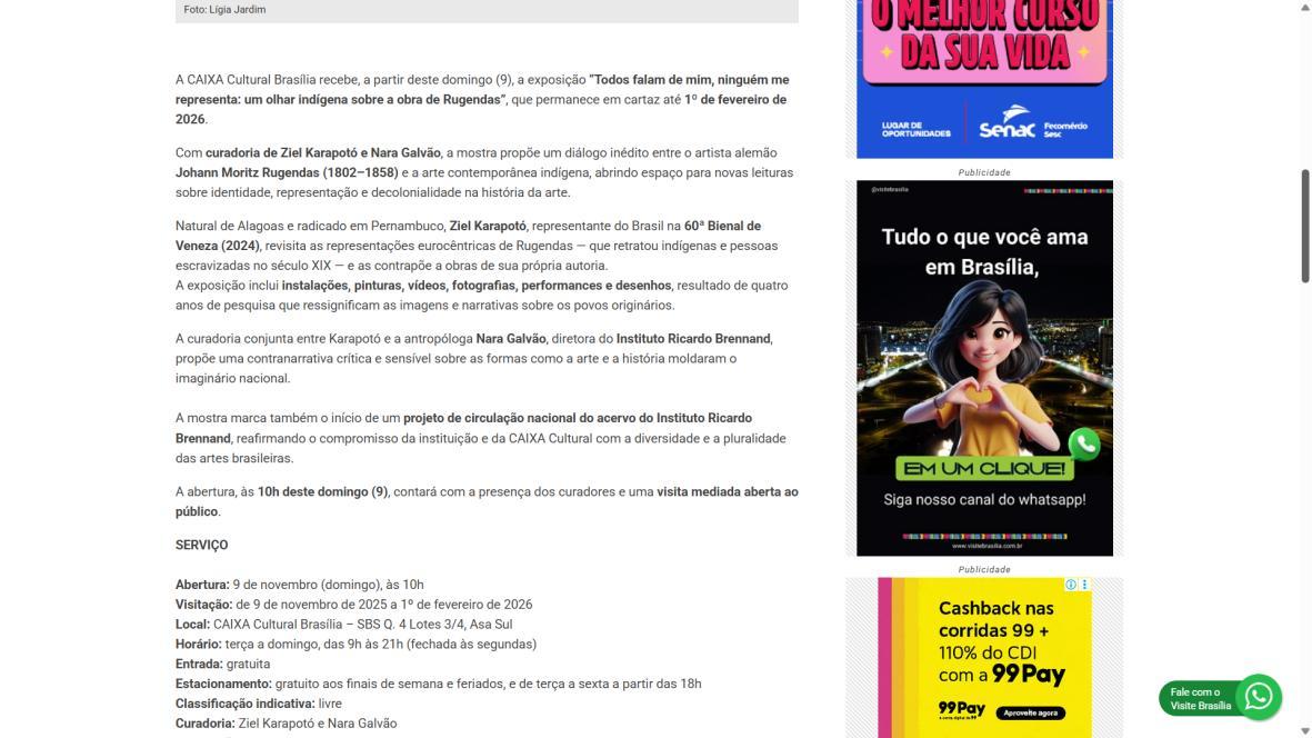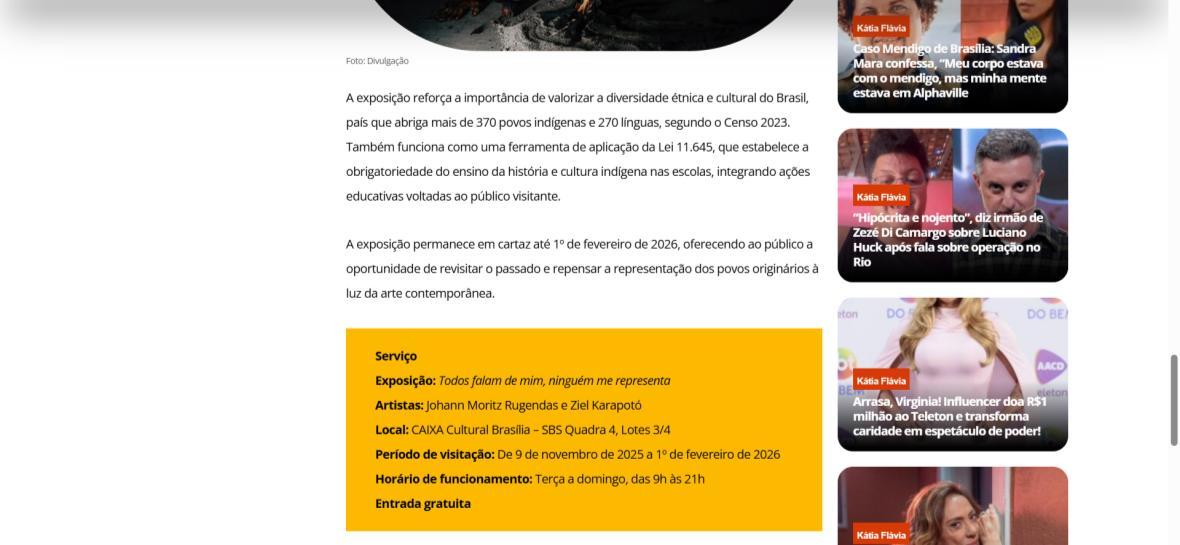 De 9 de novembro de 2025 a 1º de fevereiro de 2026, a CAIXA Cultural Brasília apresenta a exposição “Todos falam de mim, ninguém me representa: um olhar indígena sobre a obra de Rugendas”, com realização do Instituto Ricardo Brennand. A mostra apresenta um diálogo inédito entre o artista alemão Johann Moritz Rugendas (1802–1858) e a produção contemporânea do artista visual indígena Ziel Karapotó, um dos representantes do Brasil na 60ª Bienal de Veneza (2024).
