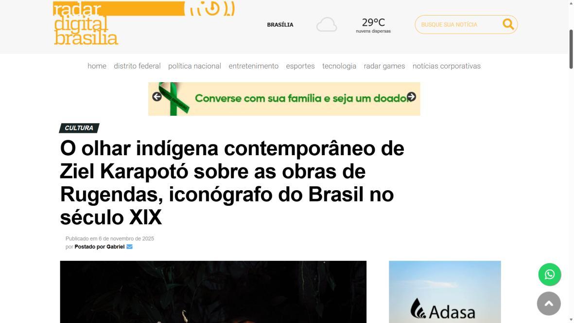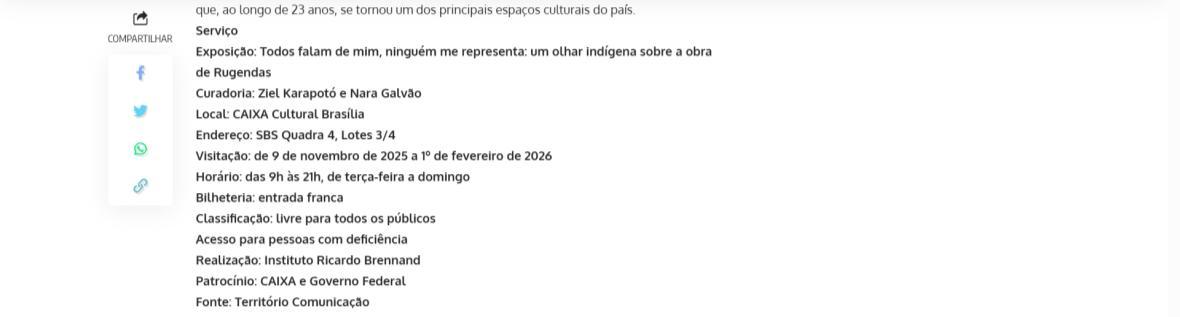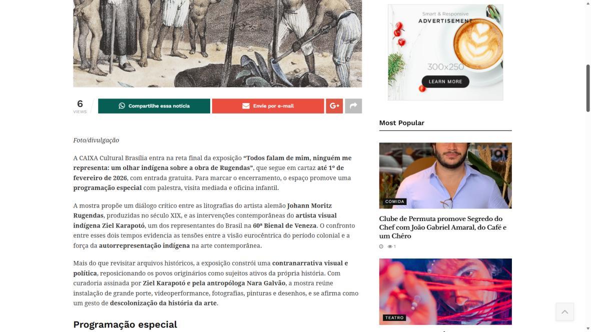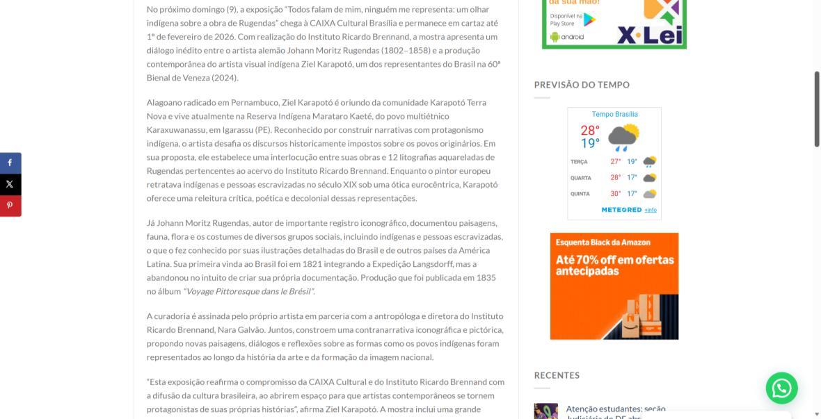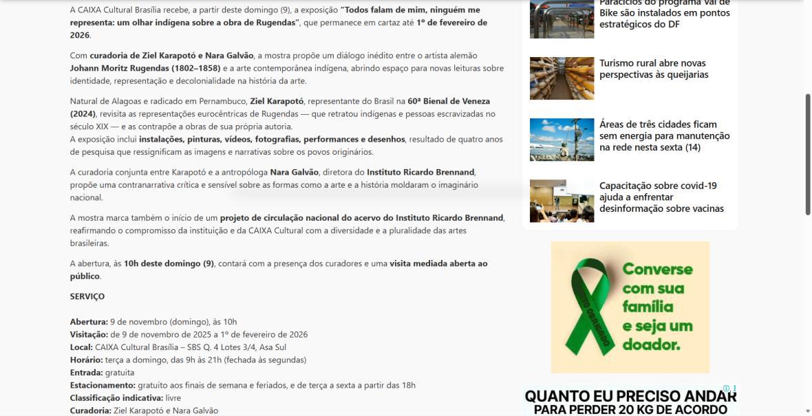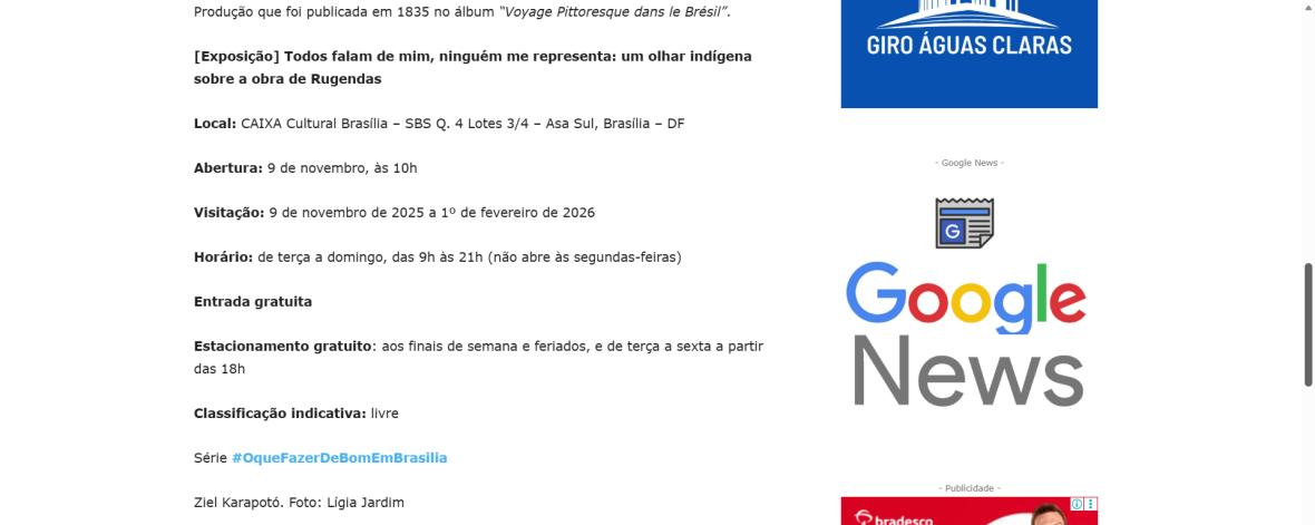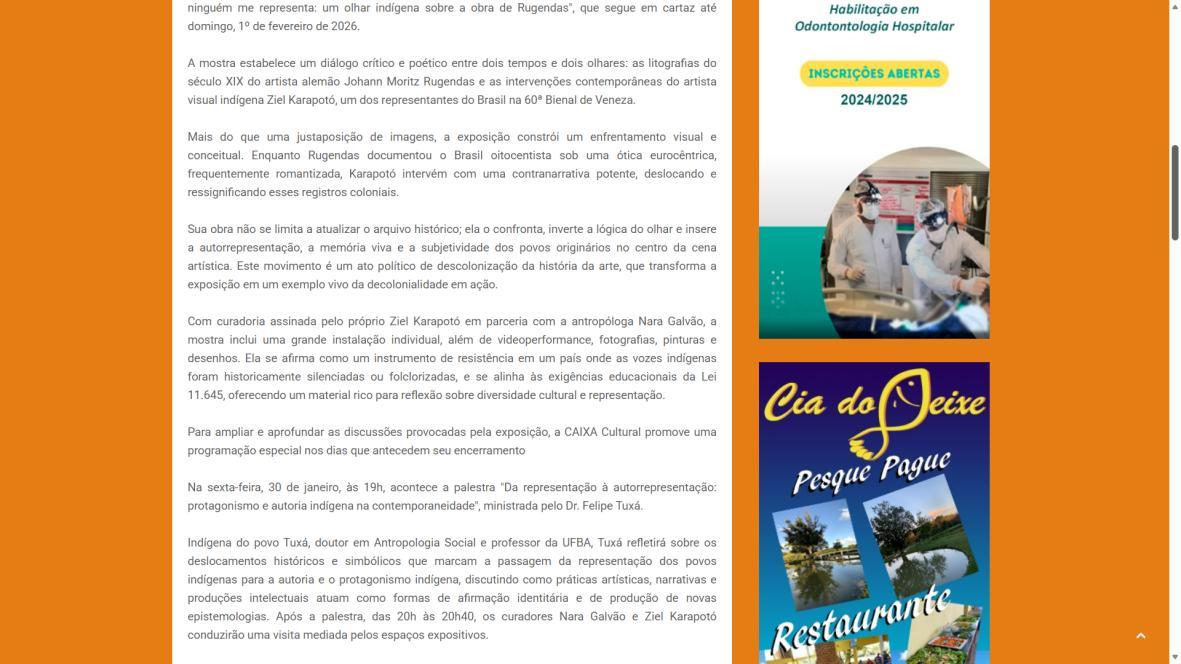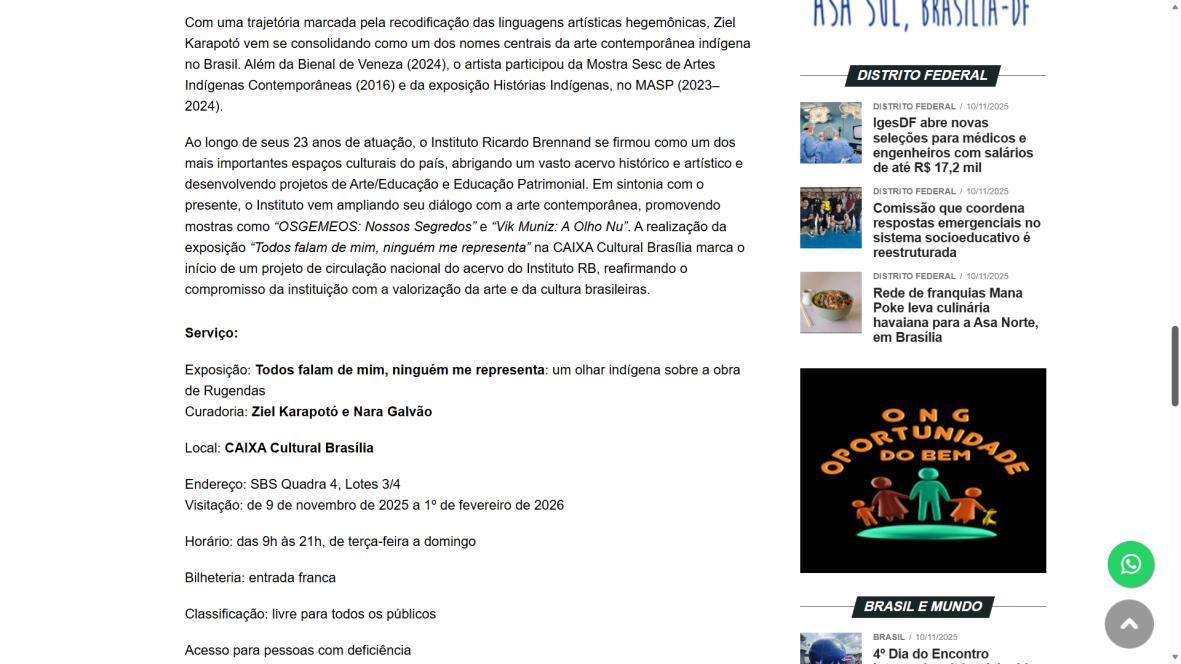De 9 de novembro de 2025 a 1º de fevereiro de 2026, a CAIXA Cultural Brasília apresenta a exposição “Todos falam de mim, ninguém me representa: um olhar indígena sobre a obra de Rugendas”, com realização do Instituto Ricardo Brennand. A mostra apresenta um diálogo inédito entre o artista alemão Johann Moritz Rugendas (1802–1858) e a produção contemporânea do artista visual indígena Ziel Karapotó, um dos representantes do Brasil na 60ª Bienal de Veneza (2024).
